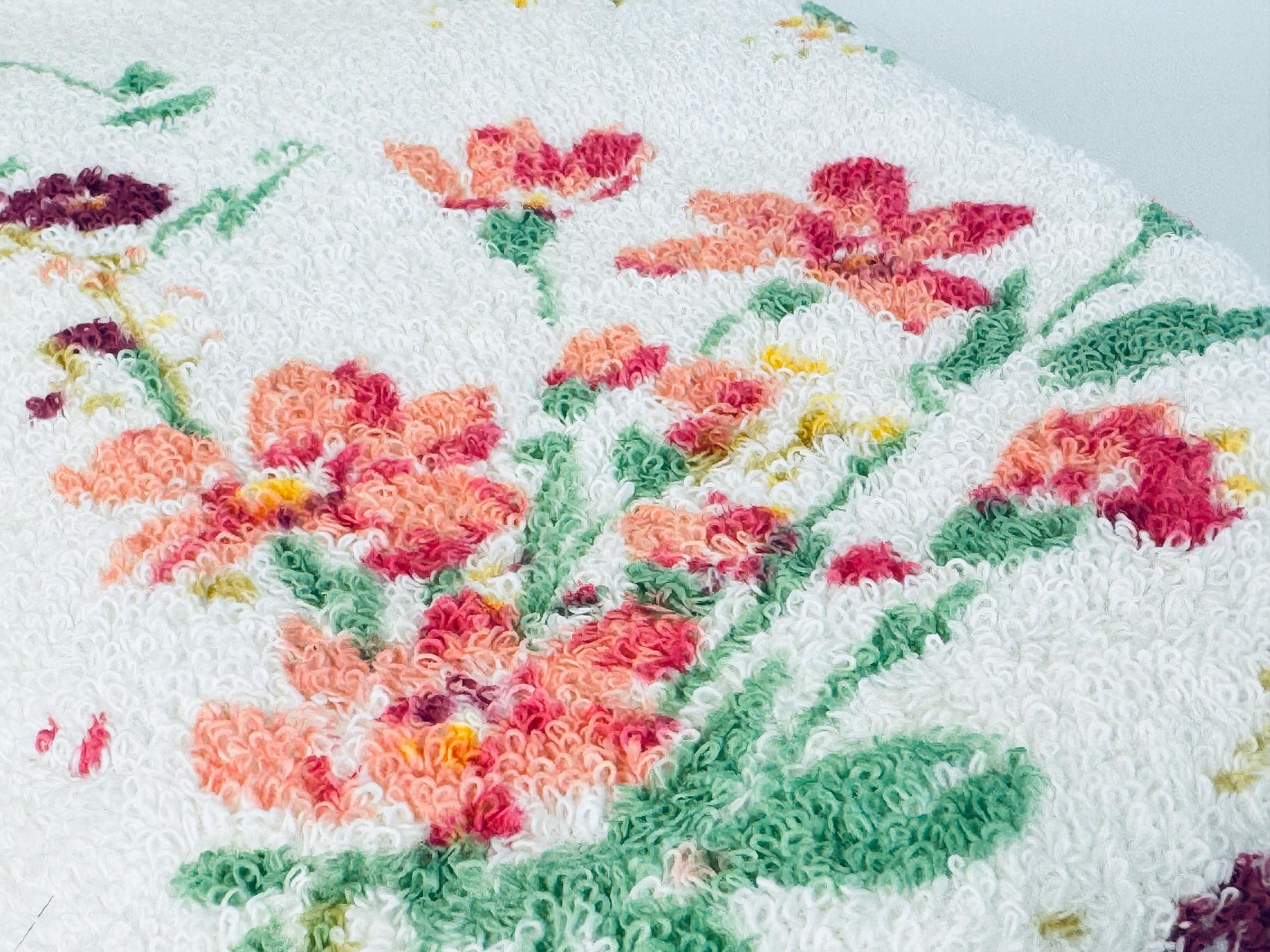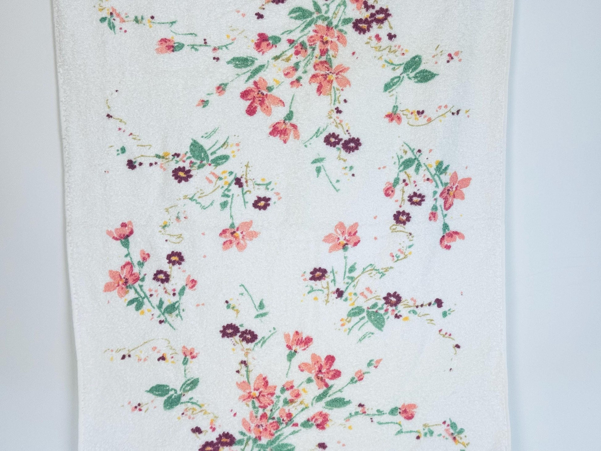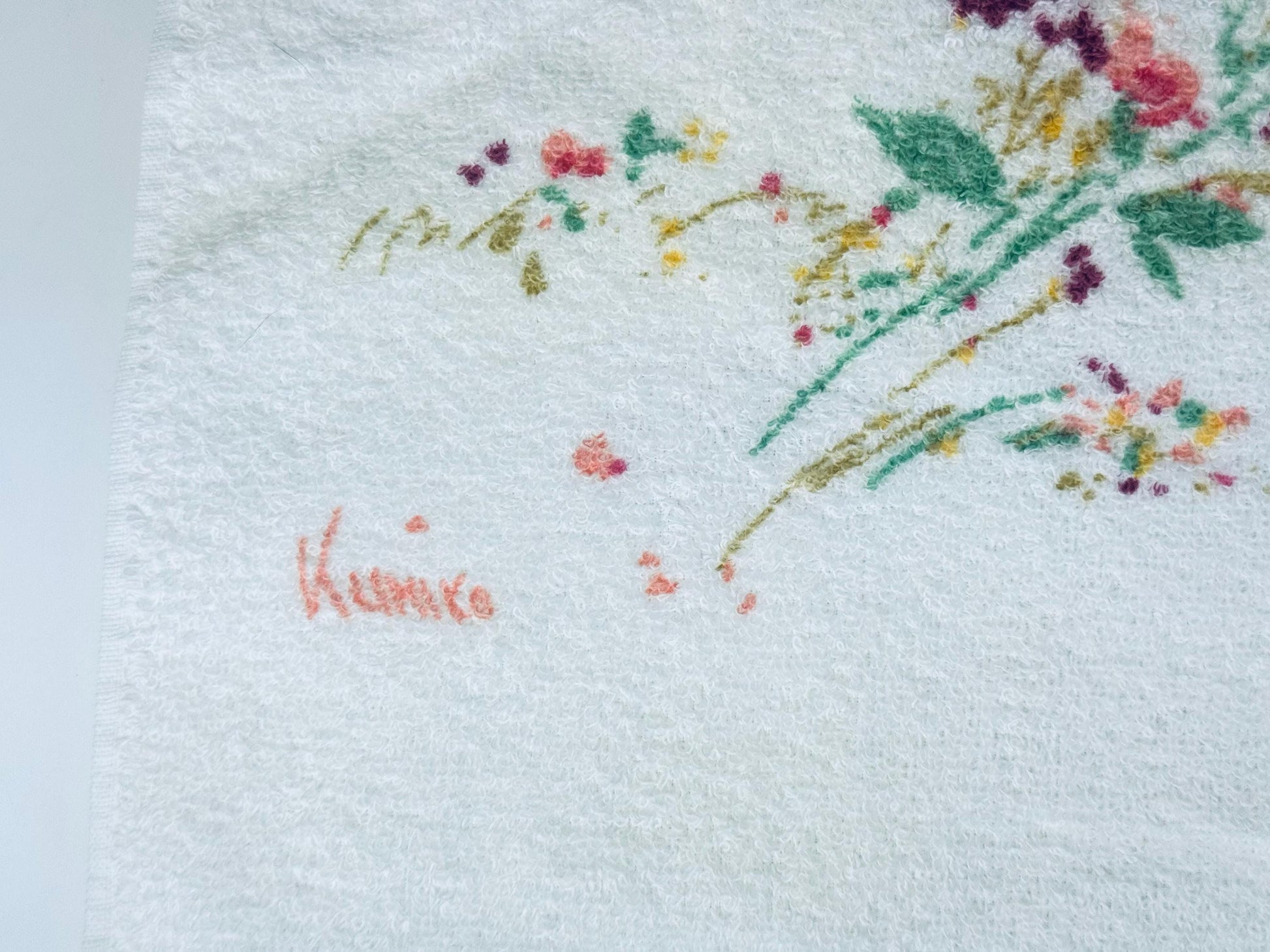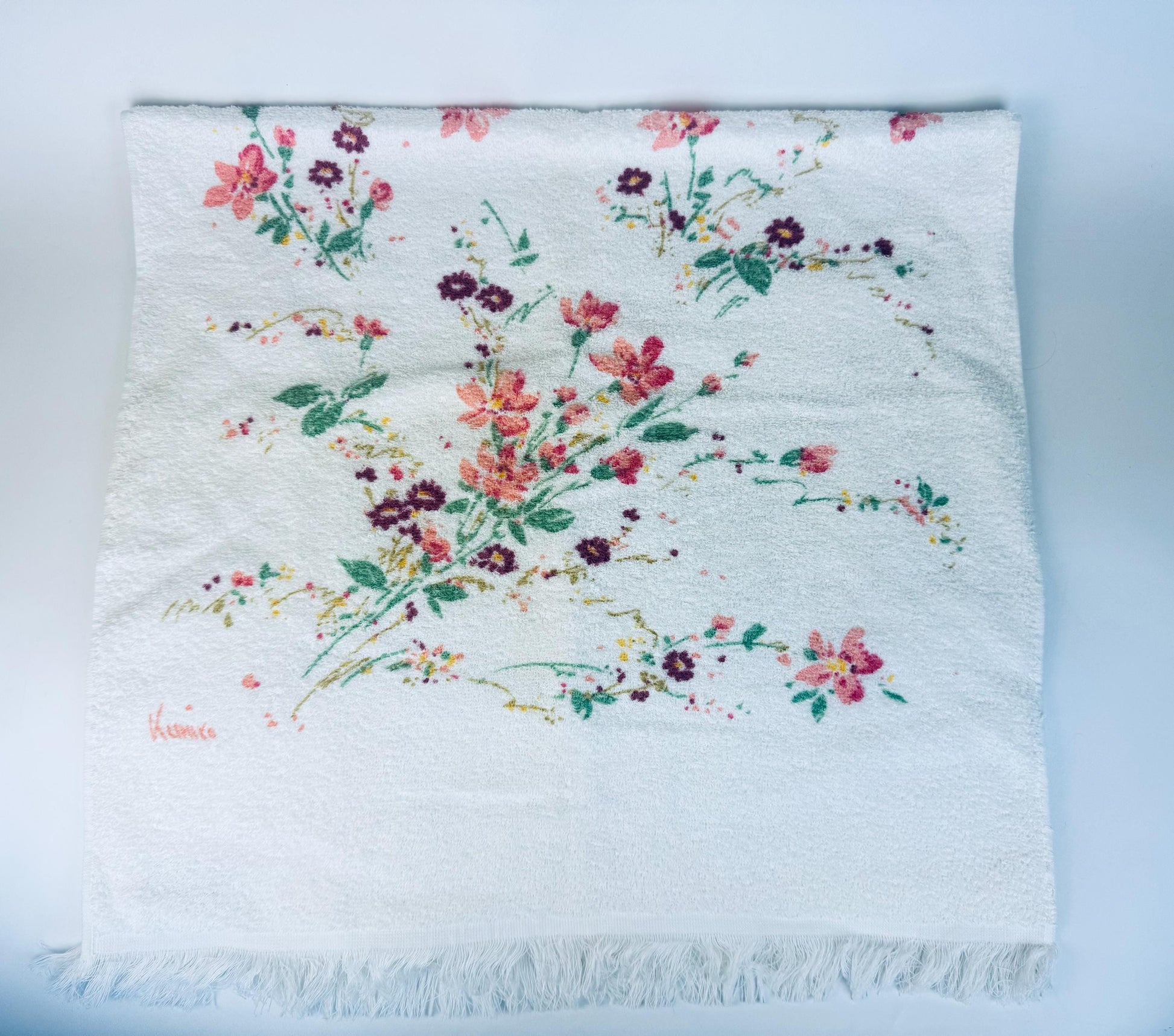 đžđž A painterly floral bath towel signed by textile artist Kimiko, showcasing pink, purple, and green blossoms on soft white terry cloth. Produced in Canada during the 1980s by Wabasso, this cottonâpolyester blend piece balances absorbency with durability, finished with charming fringed edges. Perfect for everyday use, a guest bath, or displayed as a collectible textile.