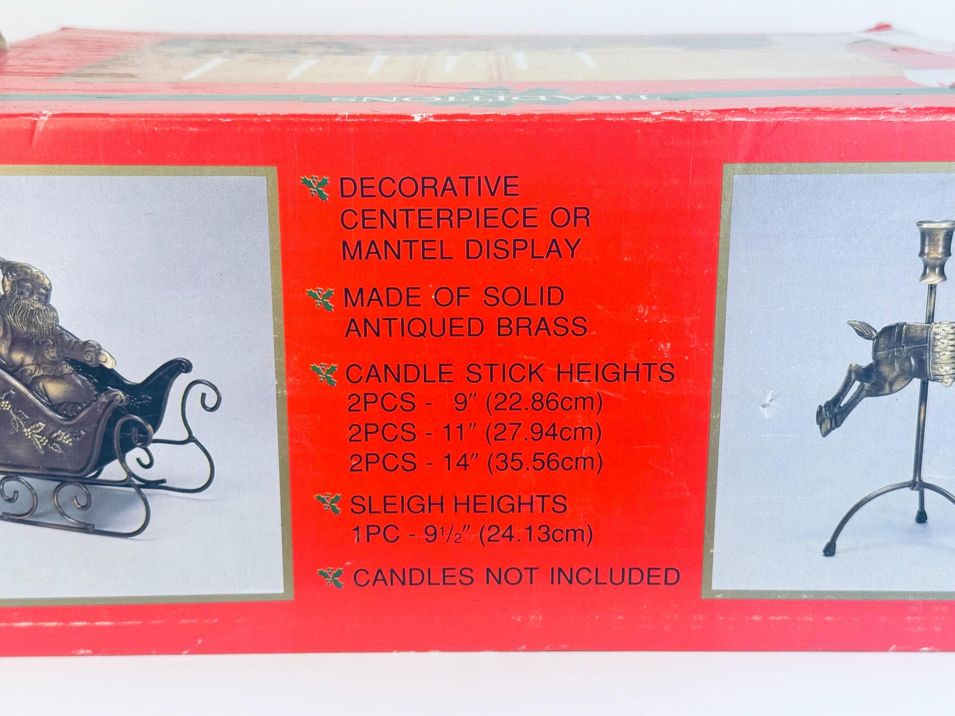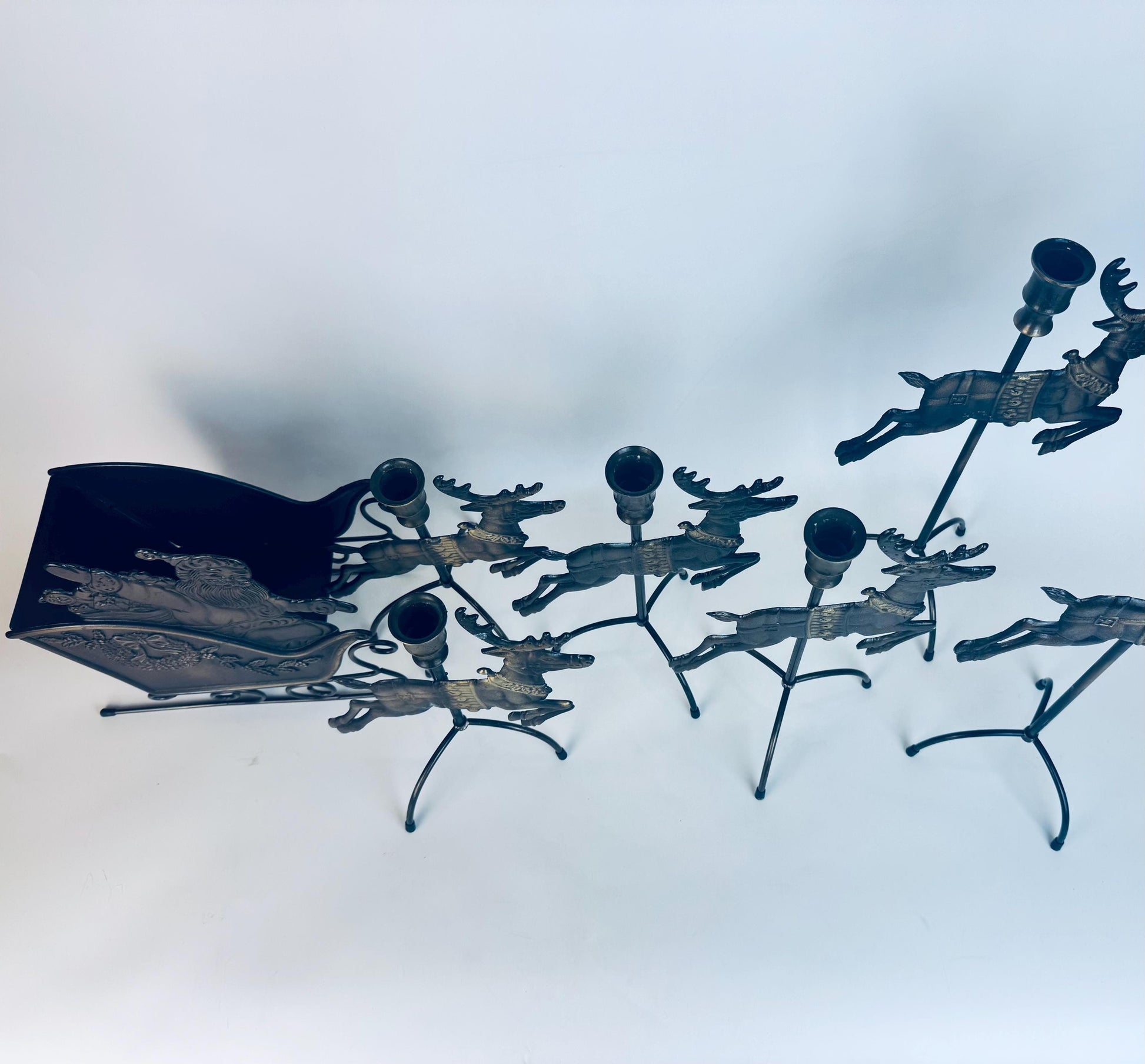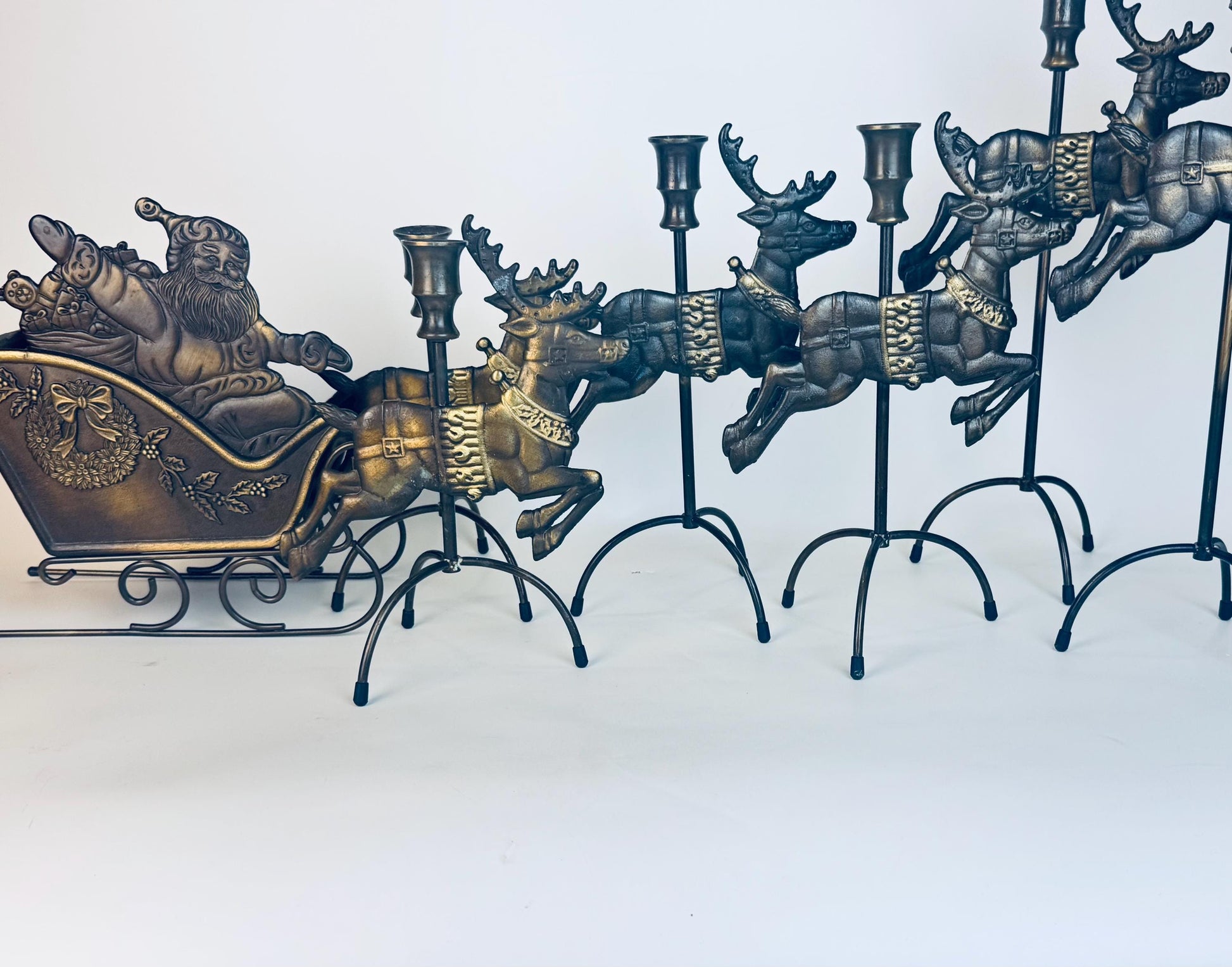 Vintage 1990s Solid Brass Reindeer & Sleigh Candleholder Set Antiqued Gold Holiday Mantel or Table Centrepiece Display