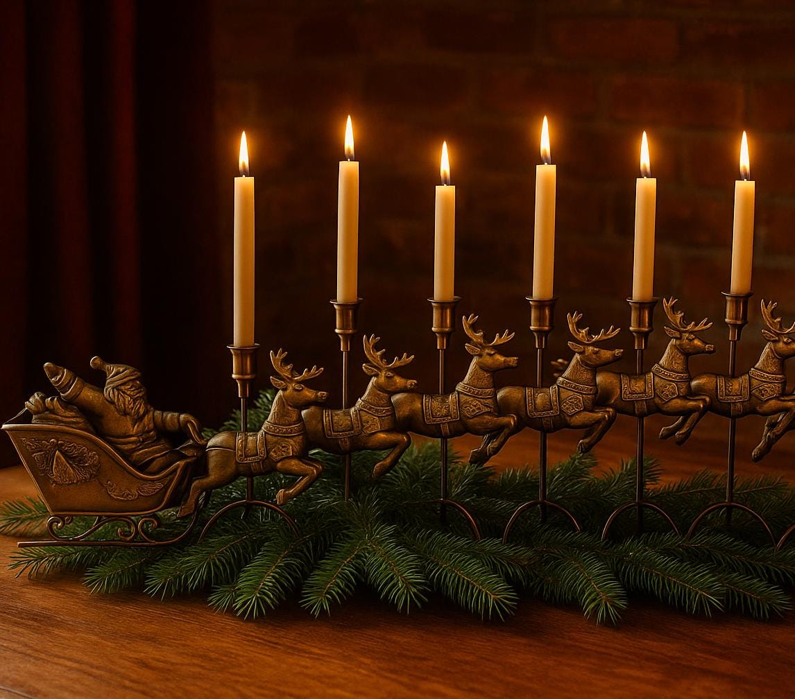 🎅 🦌 A nostalgic holiday centrepiece crafted from solid antiqued brass, this 1990s Traditions reindeer and sleigh candlestick set captures the charm of classic Christmas décor. Each piece showcases finely cast details — from Santa’s flowing beard to the ornate sleigh and reindeer harnesses — creating a striking focal point on any mantel or festive table. A collectible statement set designed to glow beautifully under candlelight.