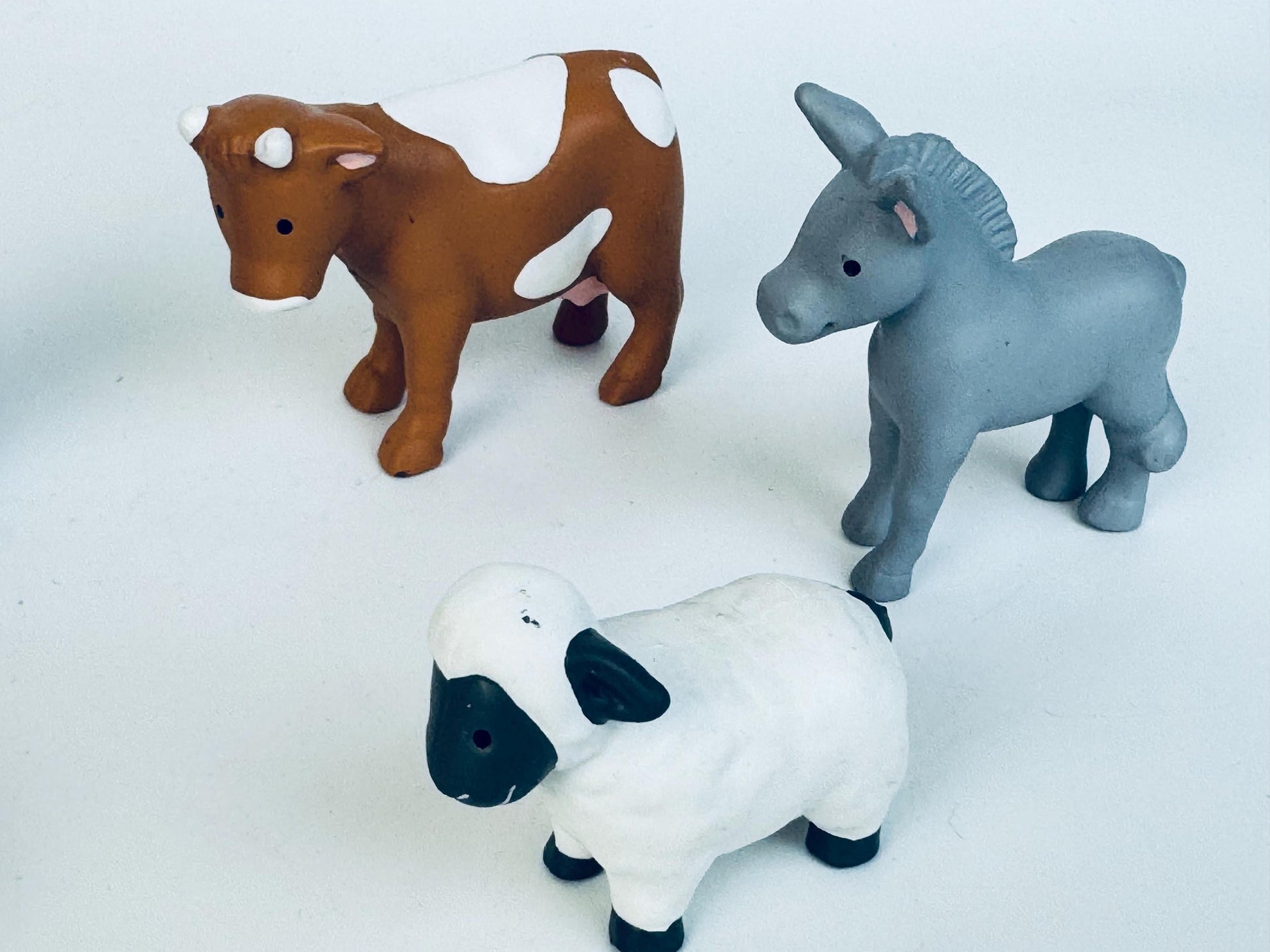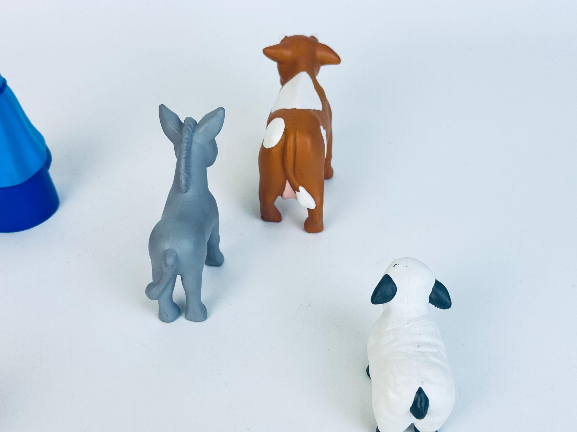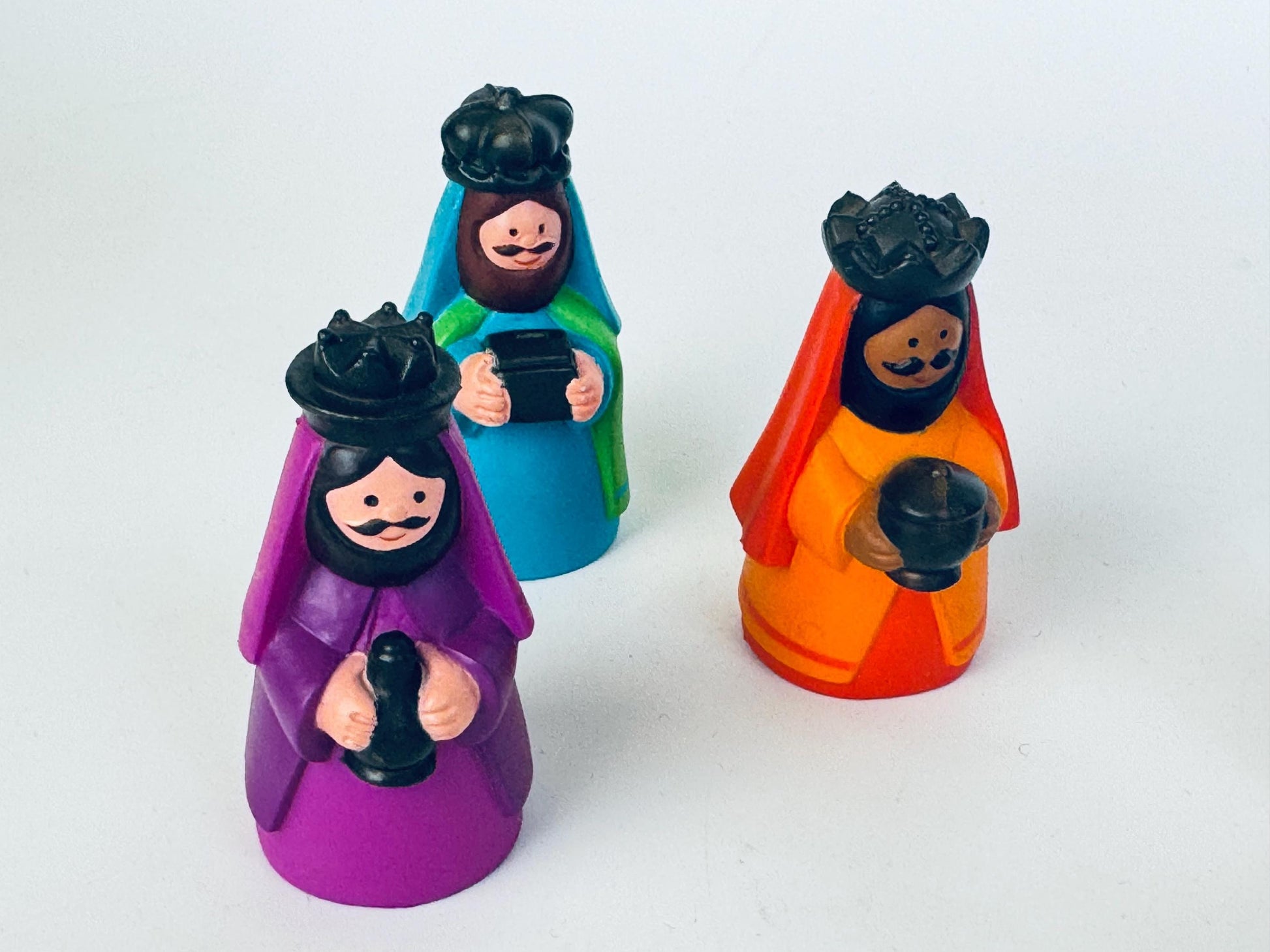 🐪🐴🐄 Playful yet reverent, this 1993 Avon My First Christmas Story nativity set captures the charm of early-’90s holiday design. Each of the nine soft rubber figures — Mary, Joseph, Baby Jesus, three Wise Men, a cow, lamb, and donkey — is painted in bright, storybook hues with simple features ideal for display or gentle play. The set’s rounded shapes and joyful colour palette make it a delightful, child-safe creche for mantel or nursery décor.