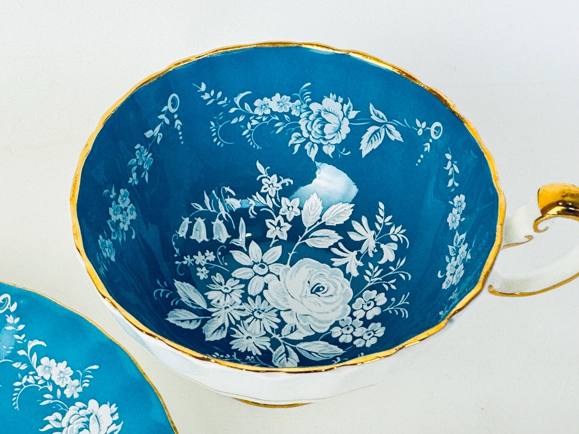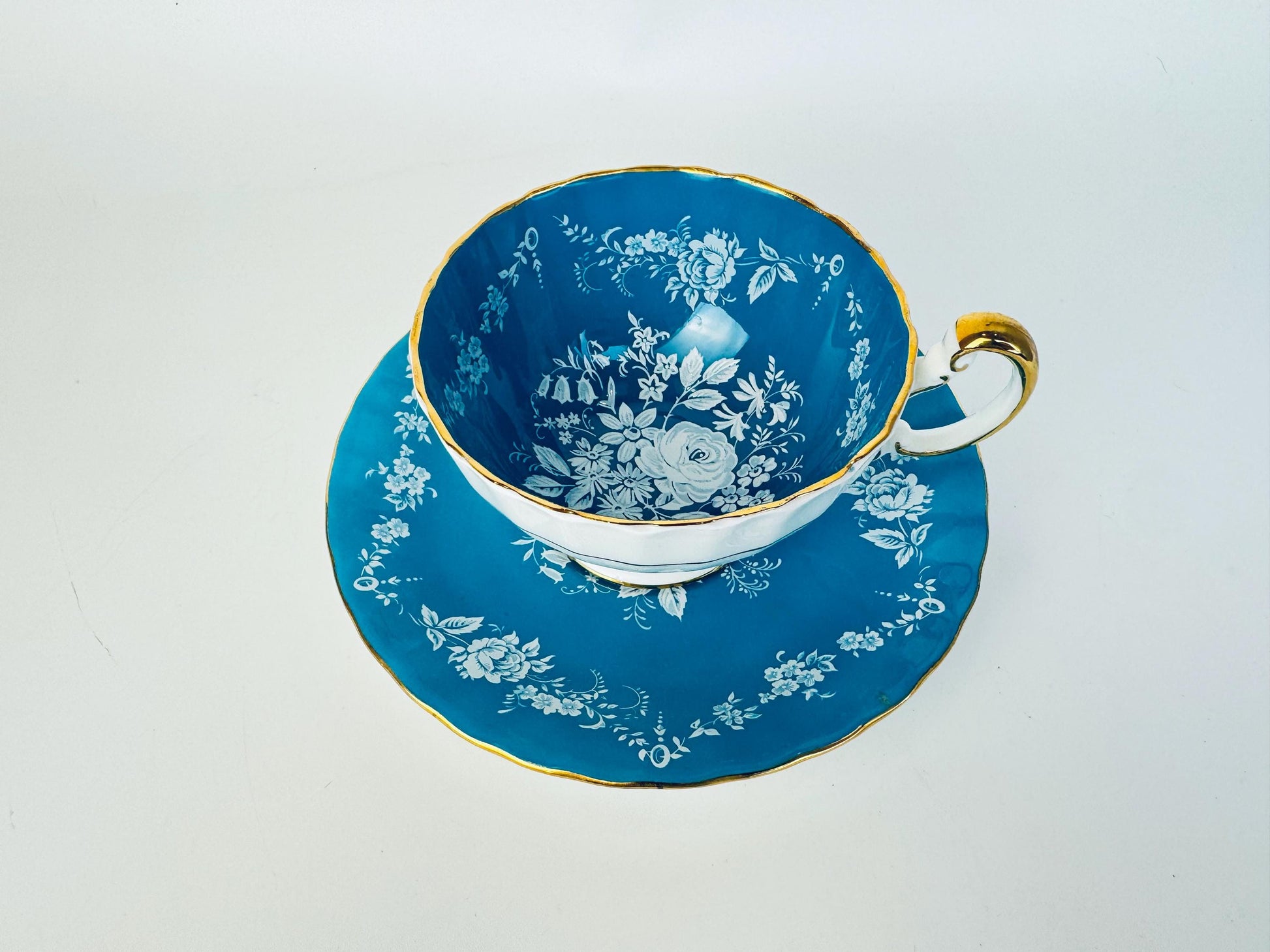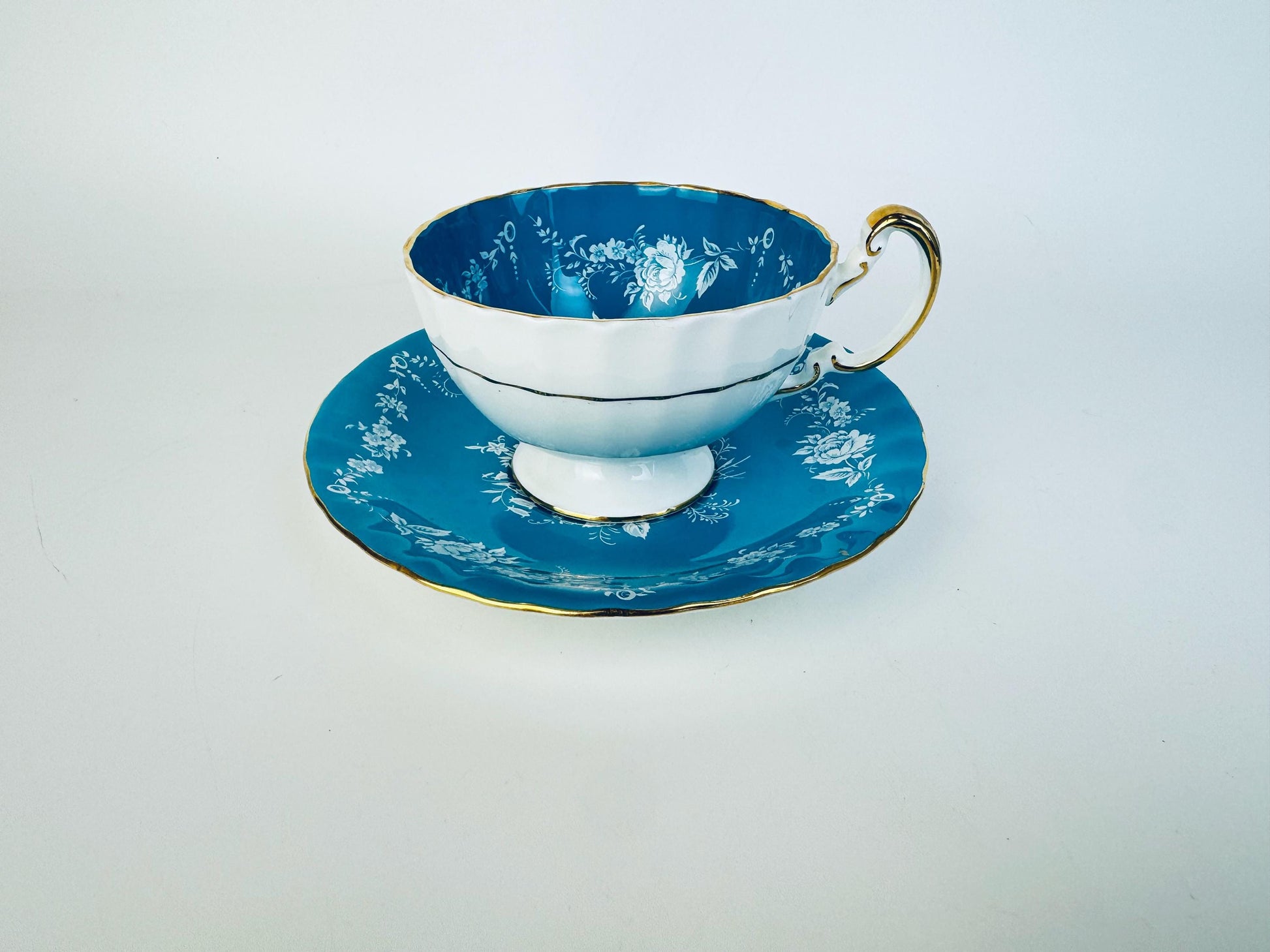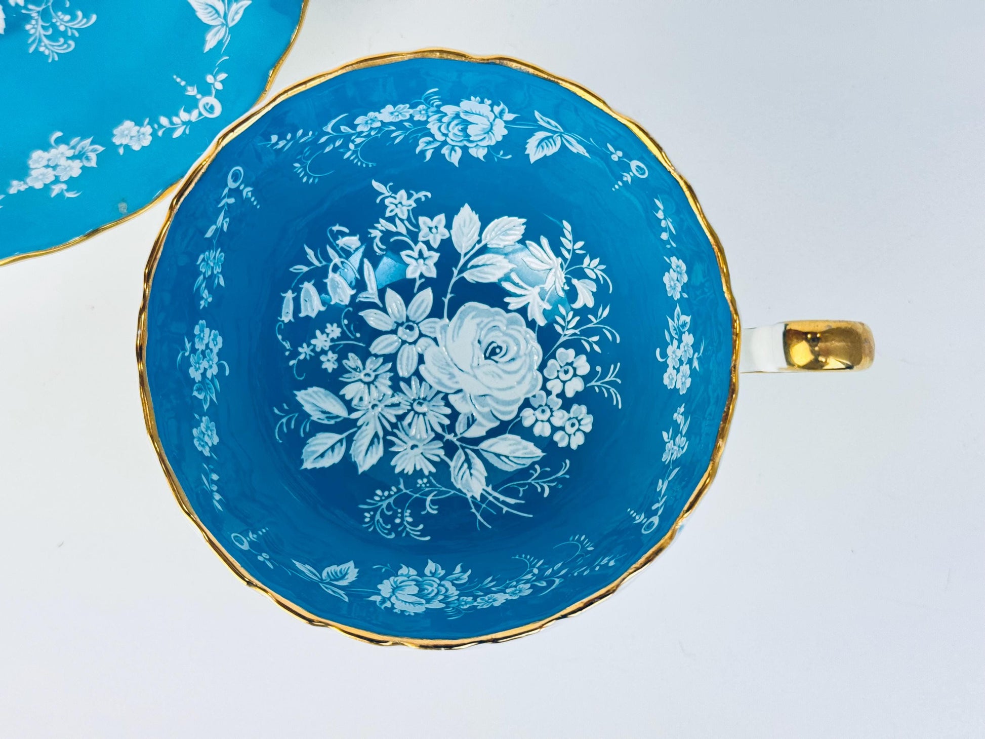 Tasse à thé et soucoupe vintage « AYNSLEY » en porcelaine bleu turquoise, blanc et or – Motif floral rose – Fabriquée en Angleterre