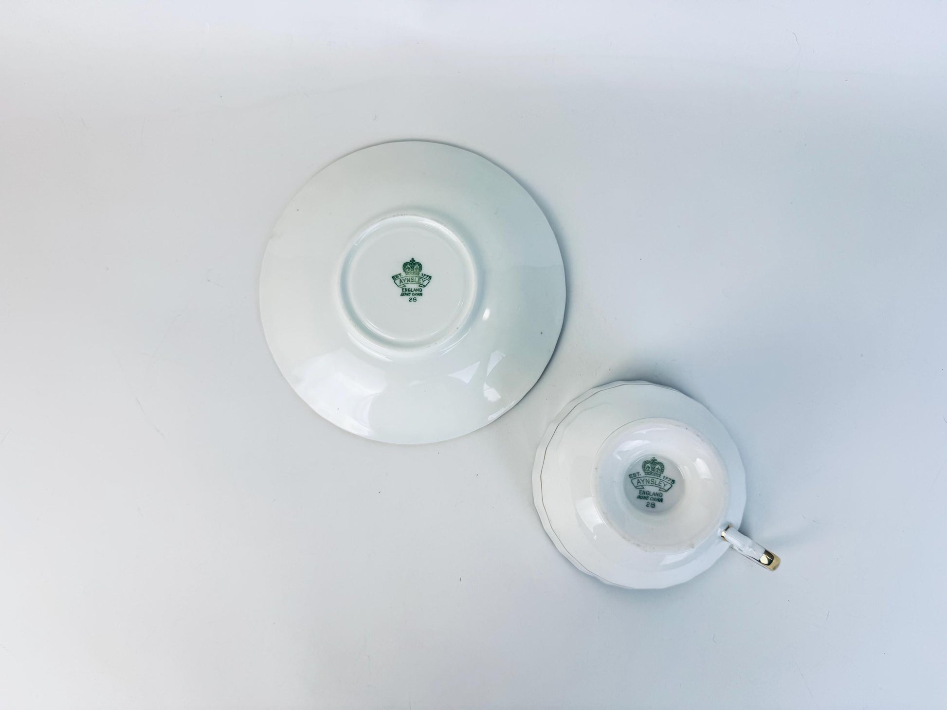 Fondée en 1775, Aynsley est rapidement devenue un leader de la porcelaine anglaise fine, admirée pour sa clarté et son savoir-faire artisanal. Dans les années 1950, les motifs floraux turquoise vibrants de la marque reflétaient le goût de l'après-guerre pour les couleurs vives associées à des motifs botaniques intemporels.