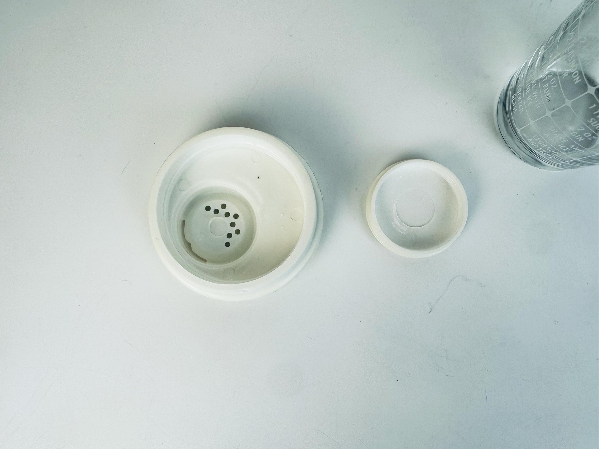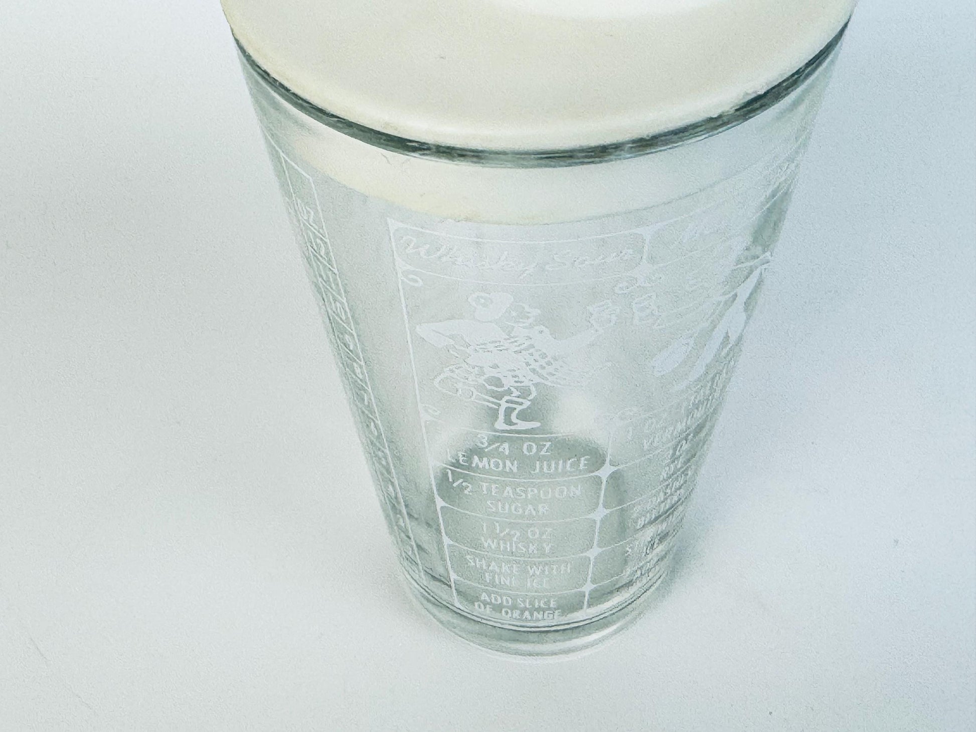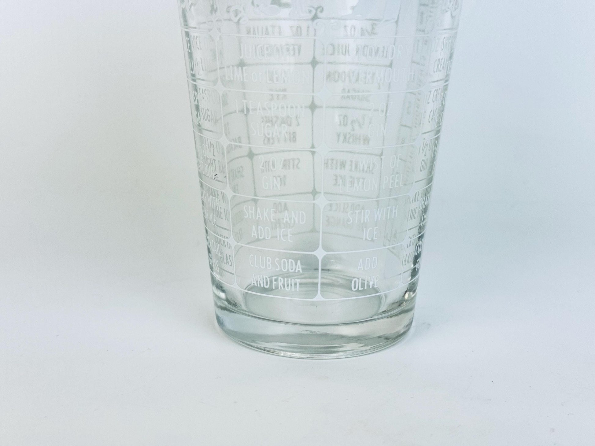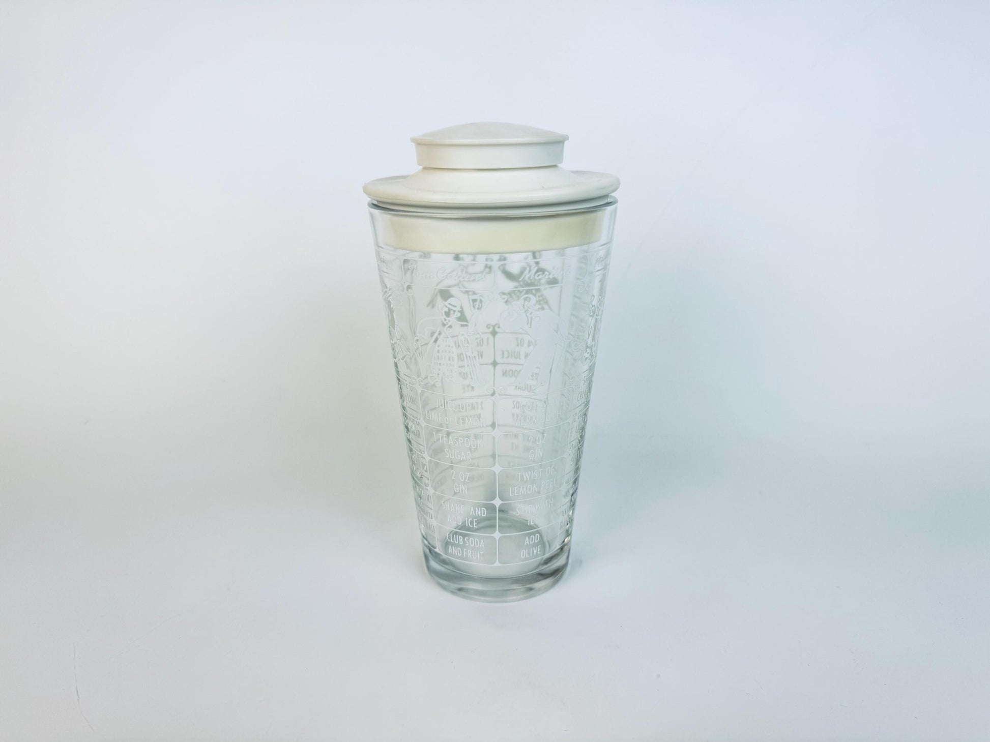 đž Effortlessly charming, this 1950s Federal Glass cocktail shaker features clear pressed glass ornamented with printed drink recipes and a crisp white plastic lidâideal for your retro bar cart, display shelf, or spirited dinner party. With vivid cocktail-graphics including Tom Collins, Martini, Daiquiri, and mixology instructions, it invites both use and admiration. Offered in excellent vintage condition, this barware accent captures the fun of mid-century entertaining.
