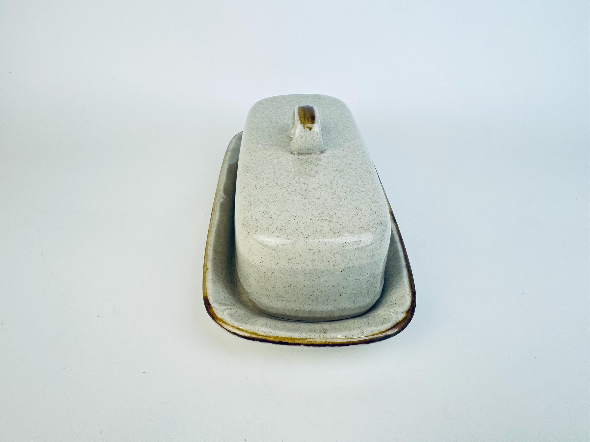 đ§ Striking in its subtle speckled grey glaze and clean rectangular two-piece form, this 1960s/70s Japanese stoneware covered butter dish marries utilitarian simplicity with refined designâideal as a butter keeper, cheese server or vintage tabletop accent. The crisp lid with integrated arch handle complements the low trayâs gentle curve, rock-glaze-trimmed rim lending a warm tone to the cool body. A refined piece for kitchen or dining styling, ready to slip into your mid-century modern, Japandi or minimalist setting.