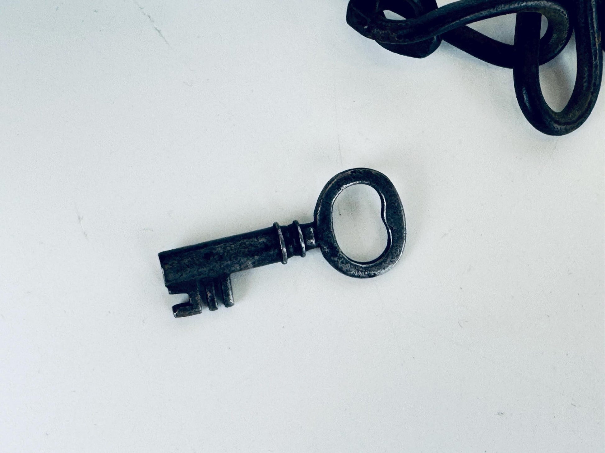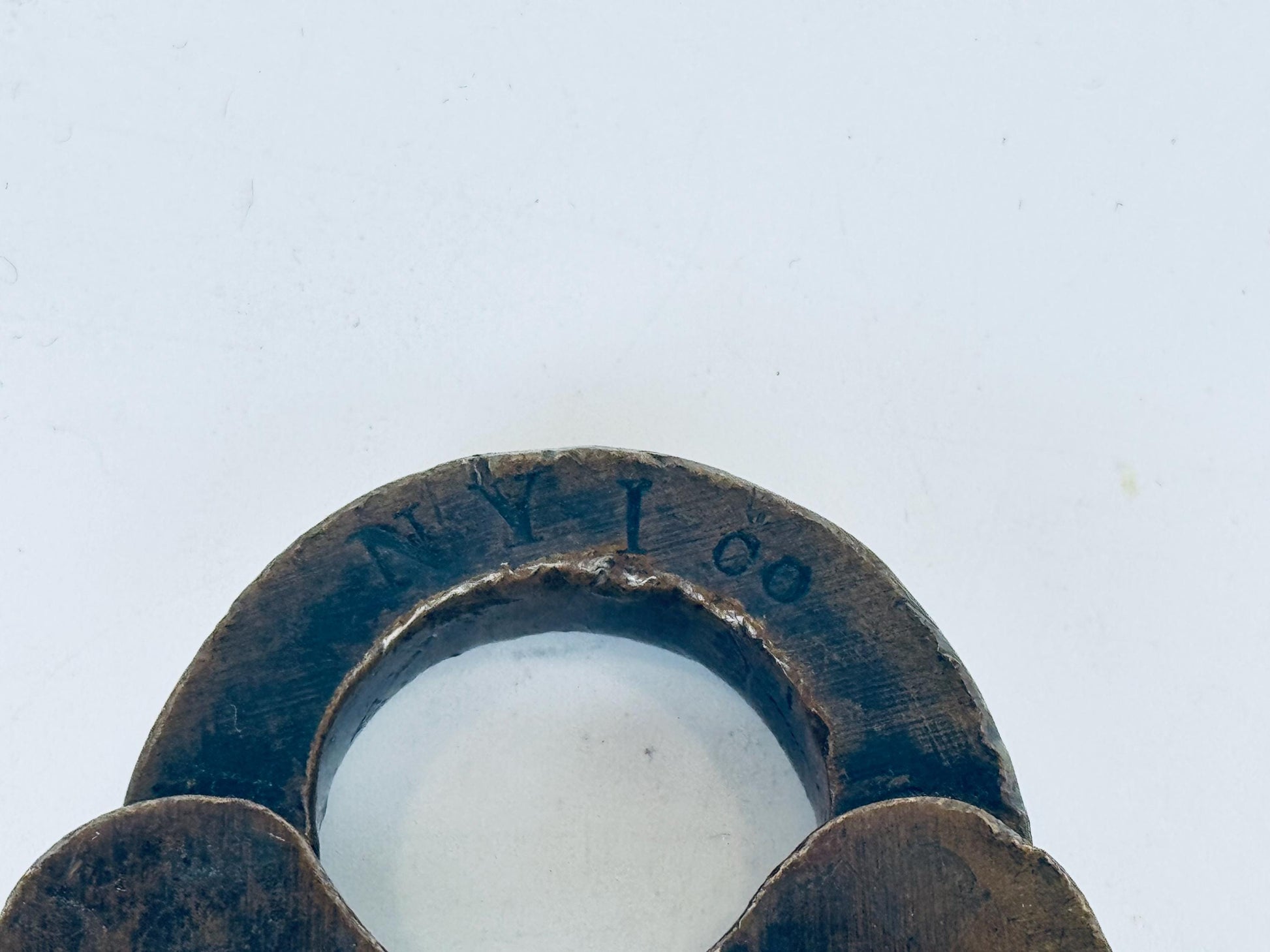 🖤 🚂 A striking 1870s brass-and-iron railroad switch lock, this heart-shaped masterpiece pairs sculptural form with authentic industrial history, complete with its original wrought chain and fully functional key. The deep, timeworn patina and substantial weight give it the presence of a true artefact—an heirloom-grade accent ideal for curated shelving, gallery-style wall décor, or as a rare collector’s centrepiece.