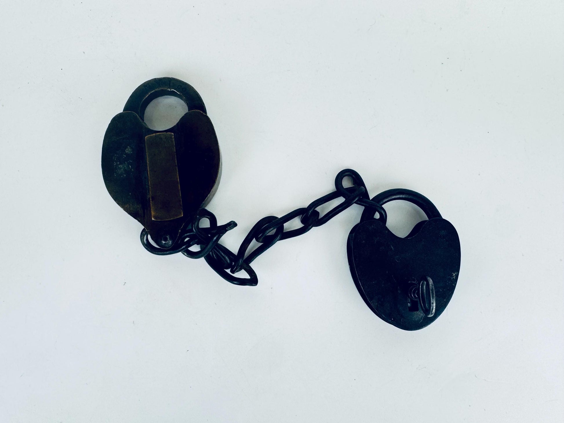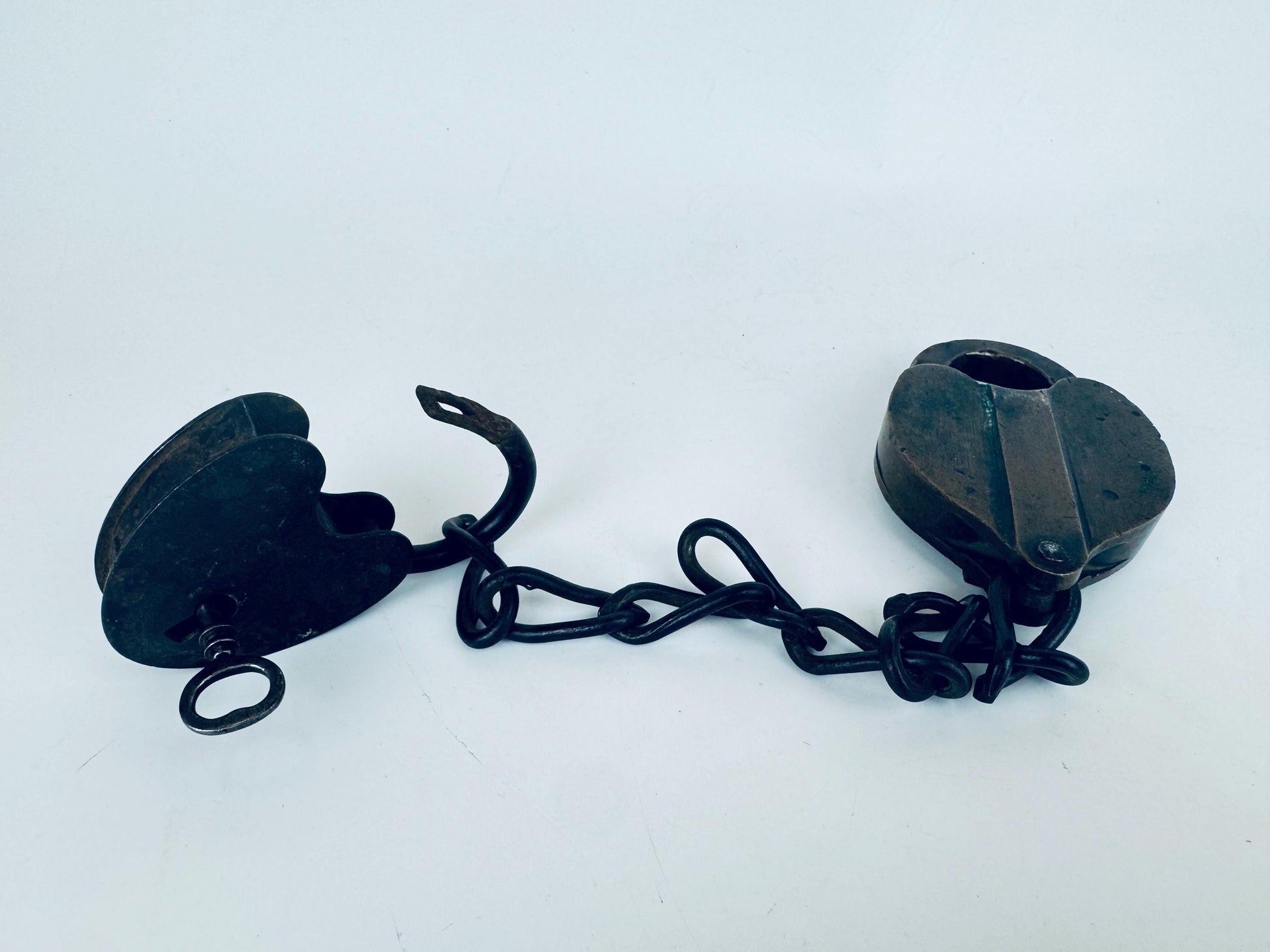 Antique + Rare 1870s Heart-Shaped Padlock Brass & Iron Railroad Lock Original Chain + Key