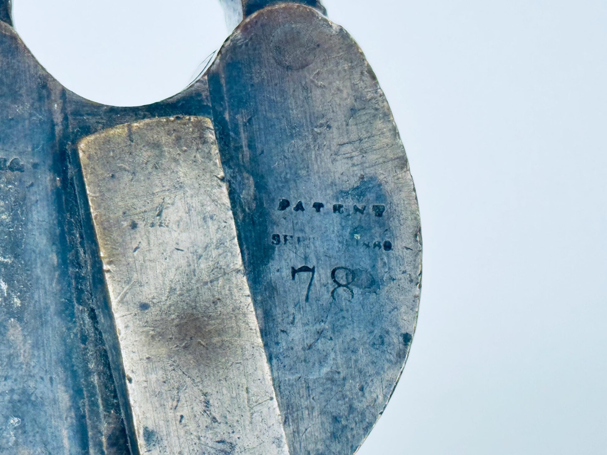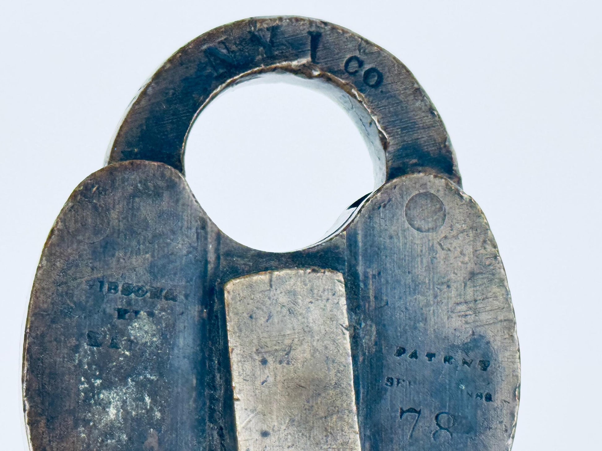 Crafted in the late nineteenth century and stamped with the 1878 patent date, this lock was produced during a pivotal era when makers like the New York Lock Co. engineered hardware that balanced mechanical ingenuity with enduring craftsmanship. Its original chain—surviving intact—is exceptionally rare, as most were removed or lost during decades of railroad service. Today, pieces of this calibre are coveted not only for their mechanical authenticity but for their sculptural, museum-worthy presence.