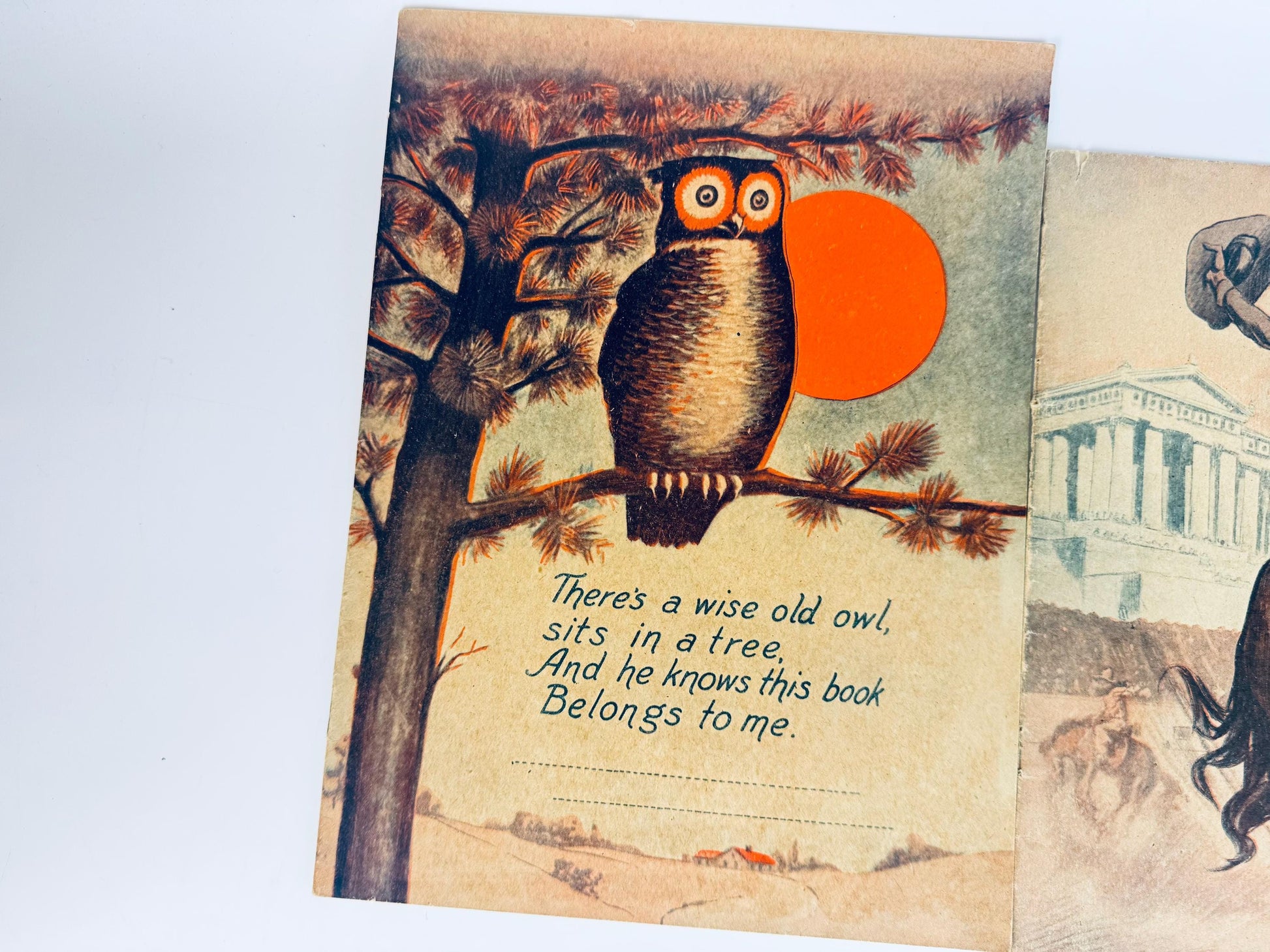 🦉🐴✈️ A charming 1930s Canadian school notebook from W.J. Gage & Company, featuring the lithographed cover “A Happy Family,” with a St. Bernard and two puppies watched over by a young girl in white. Inside, blank lined pages carry the gentle warmth of aged paper, while the reverse reveals printed arithmetic tables and a full Gage product catalogue — a rare surviving detail. A lovely piece of pre-war stationery history, ideal for framing, vintage office display, or nostalgic paper collecting.