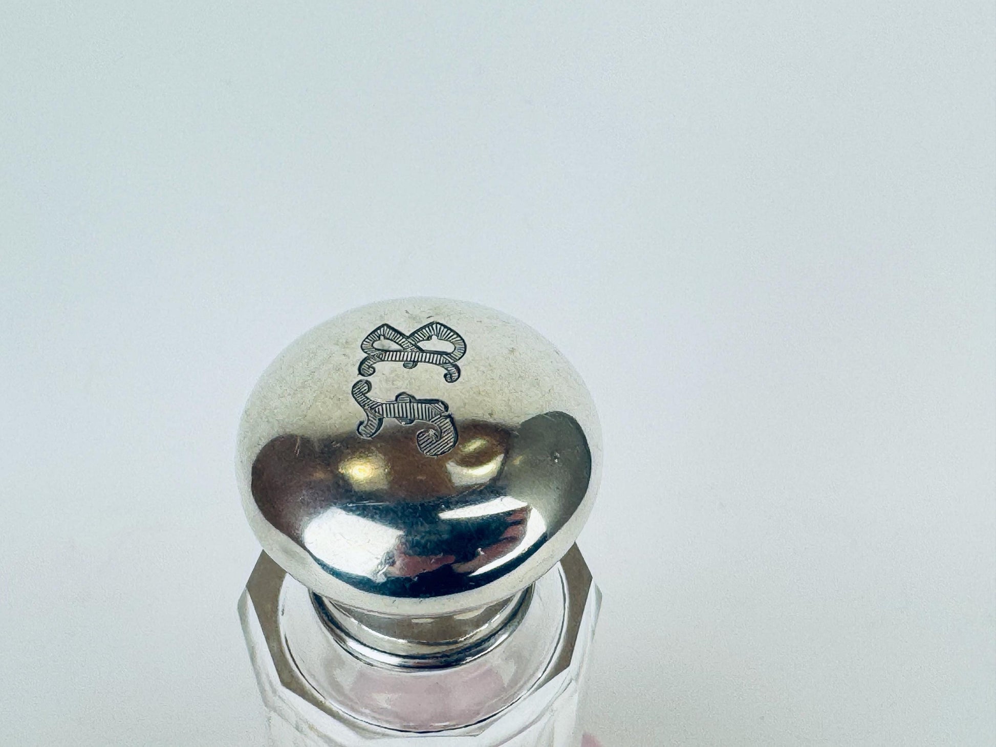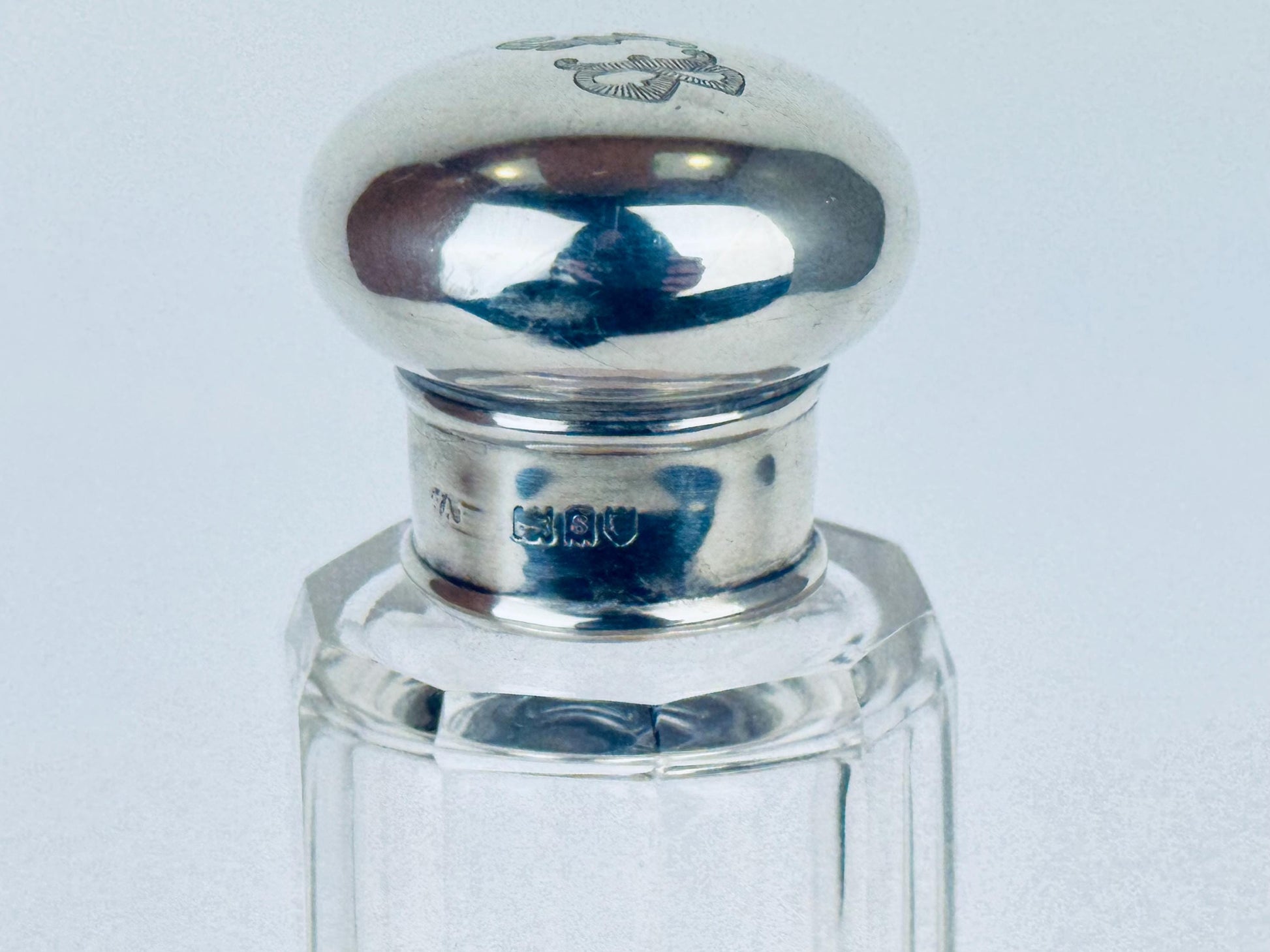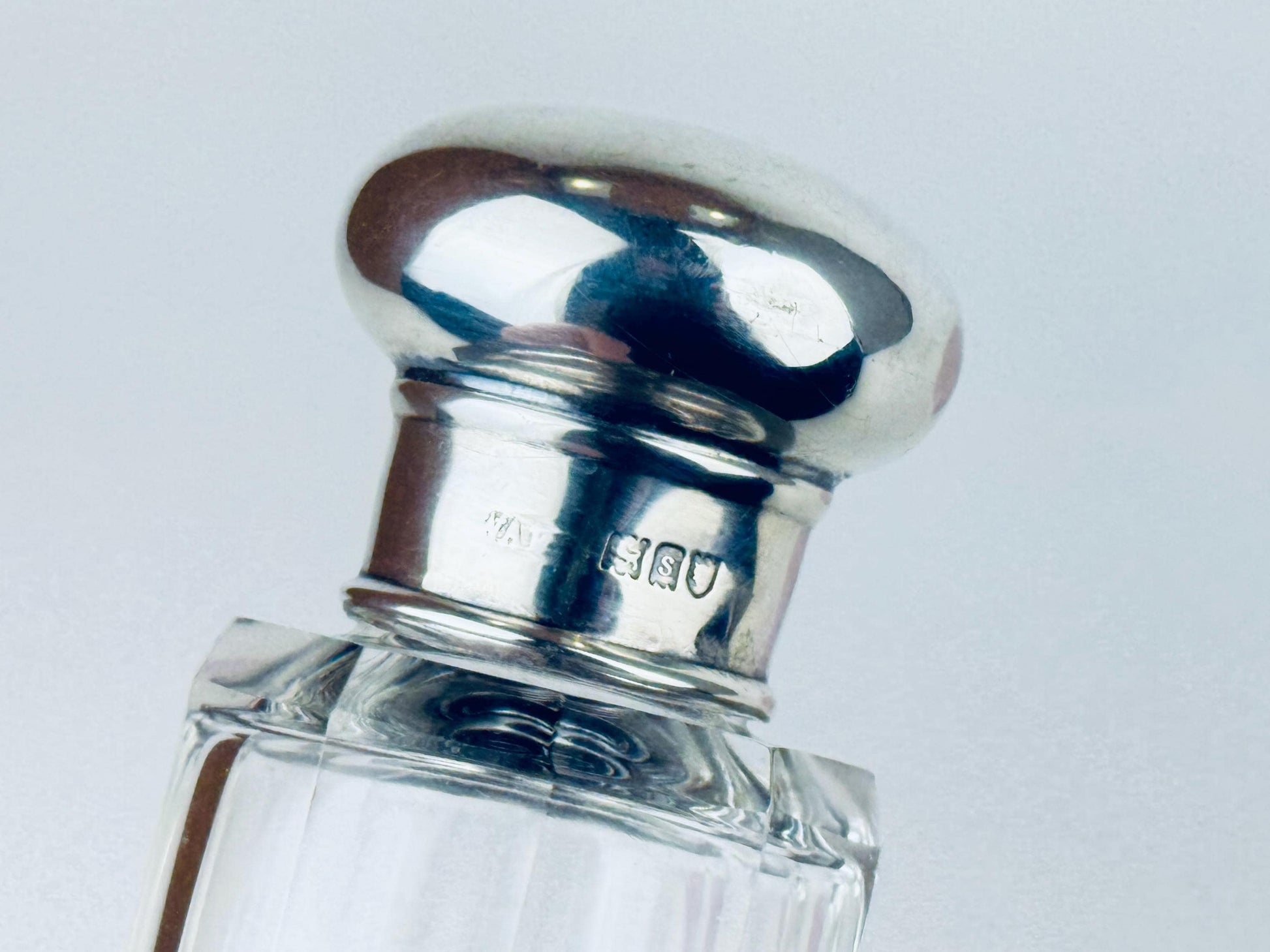 💎 A beautifully sculpted piece of late Art Deco elegance, this 1938 fluted glass perfume bottle is crowned with a sterling silver screw-top hallmarked by Birmingham maker William Aitken (WAI). Its tall octagonal body, crisp optical fluting and gleaming silver cap create a striking interplay of light and geometry — a refined choice for displaying your signature scent or elevating a dressing-table vignette