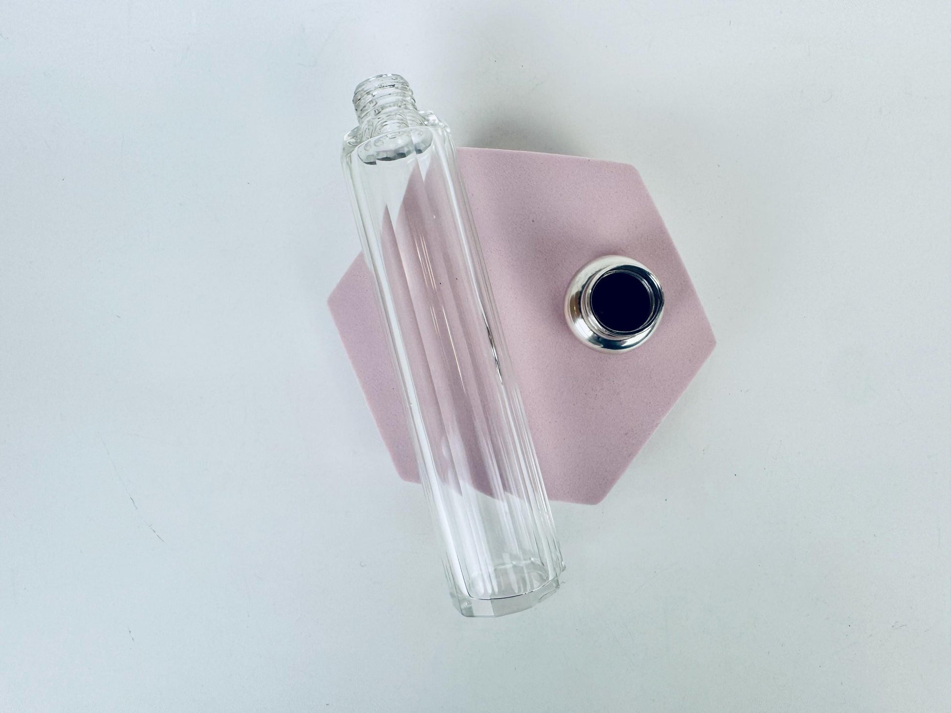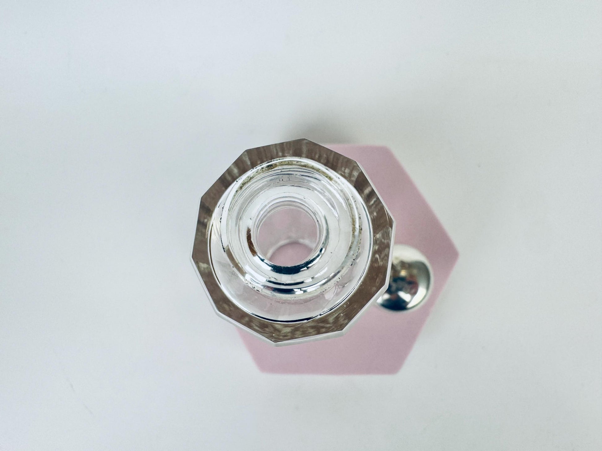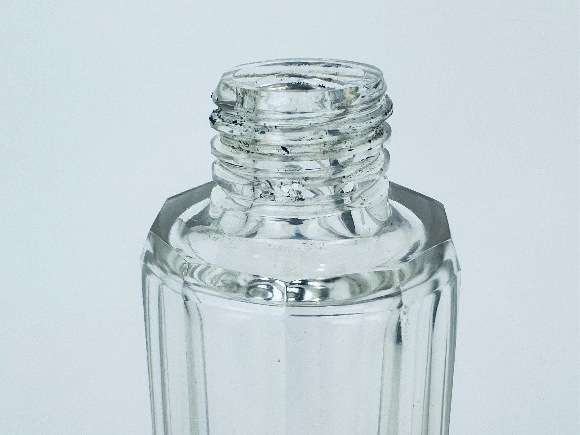 💎 A beautifully sculpted piece of late Art Deco elegance, this 1938 fluted glass perfume bottle is crowned with a sterling silver screw-top hallmarked by Birmingham maker William Aitken (WAI). Its tall octagonal body, crisp optical fluting and gleaming silver cap create a striking interplay of light and geometry — a refined choice for displaying your signature scent or elevating a dressing-table vignette