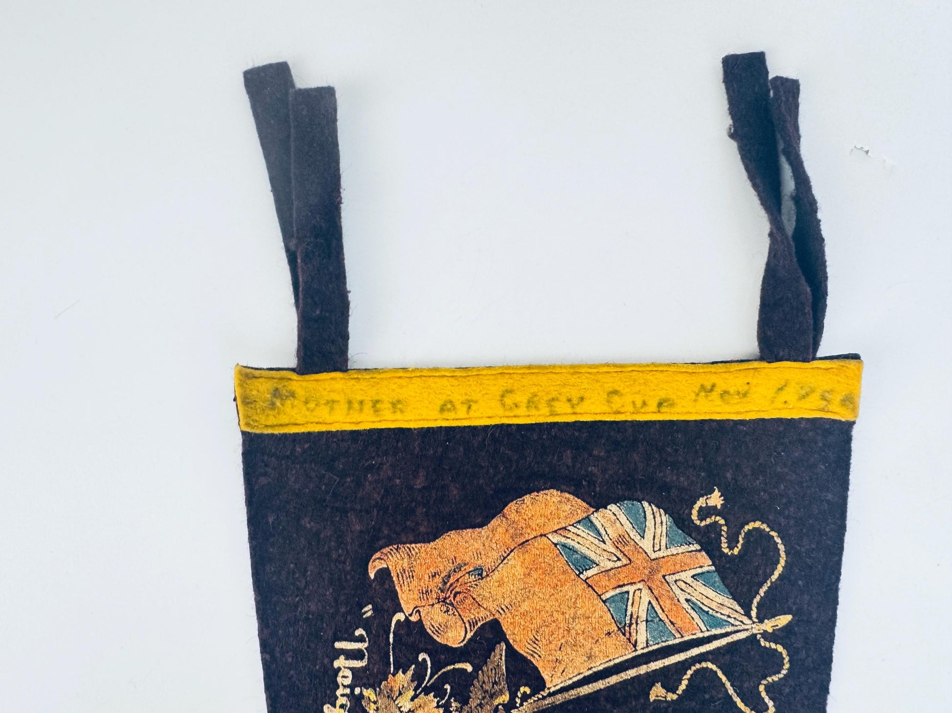 đźš© A nostalgic pair of mid-century Canadian felt pennants — each sold separately — capturing the golden age of road travel and souvenir collecting. One celebrates Toronto, featuring crossed Union Jack and U.S. flags with “Neighbours” beneath; the other commemorates the Caughnawaga Indian Reserve, Que., showcasing Chief Poking Fire and stylised teepees. Both made of richly coloured wool-blend felt with classic screen-printed detail, ideal for framing or styling in a gallery wall, bar, or study. *** Pennants are sold separately. ***Item is in average vintage/used condition. Light wear and creases can be seen. Please see all of the photos. đźš©Pennant Dimensions (Approximate): 21” L : 7" W (Widest Point)Â