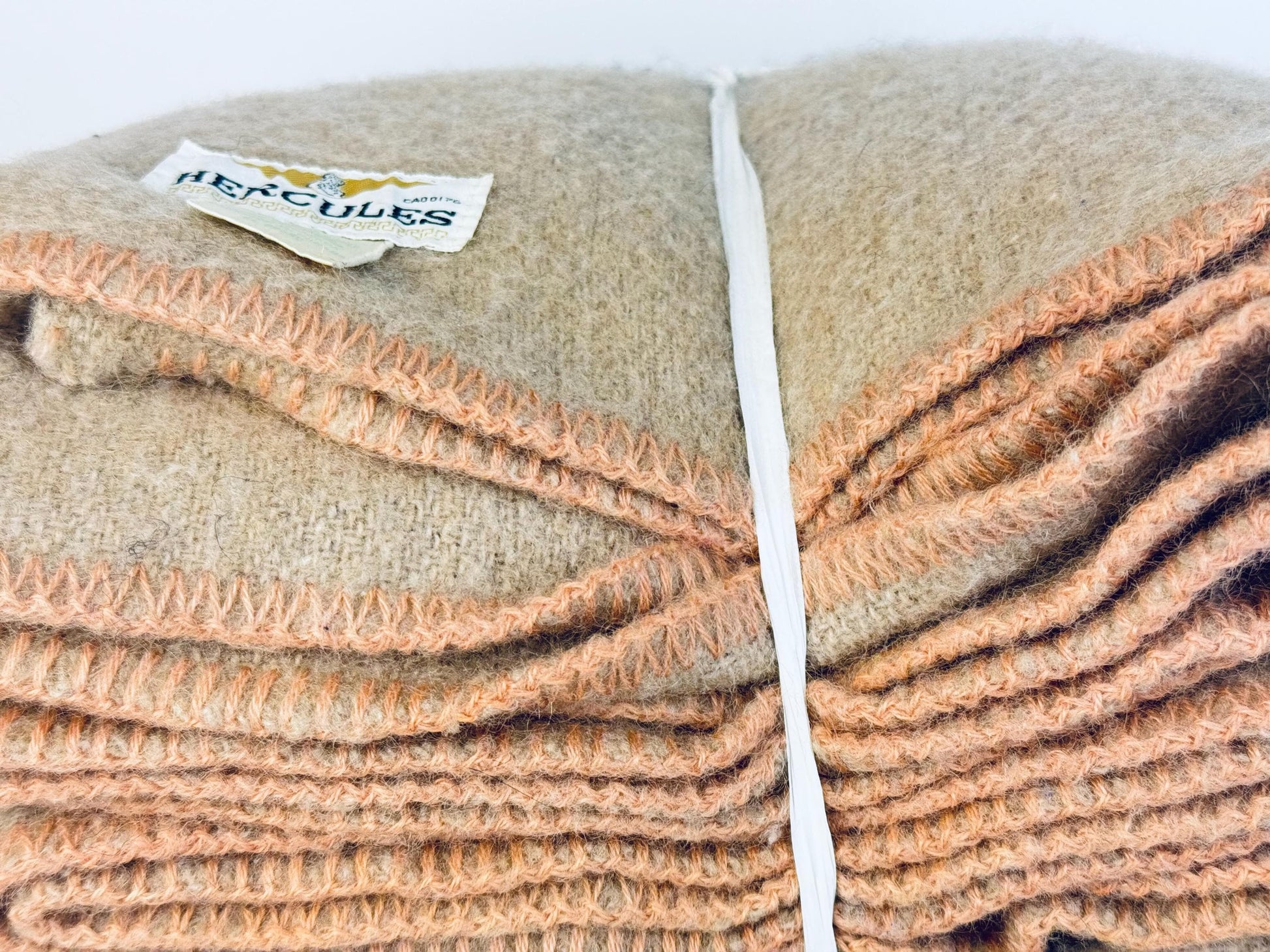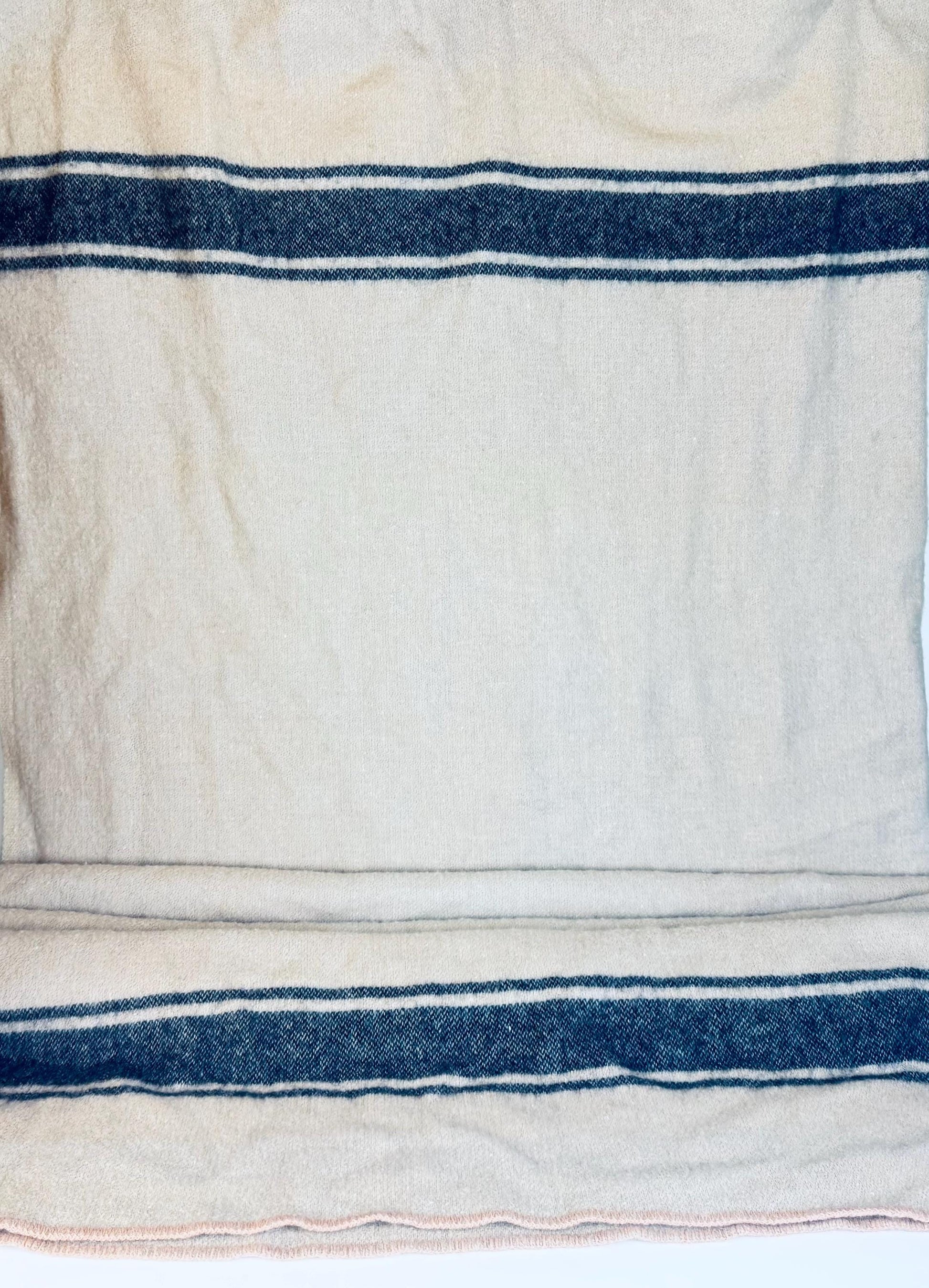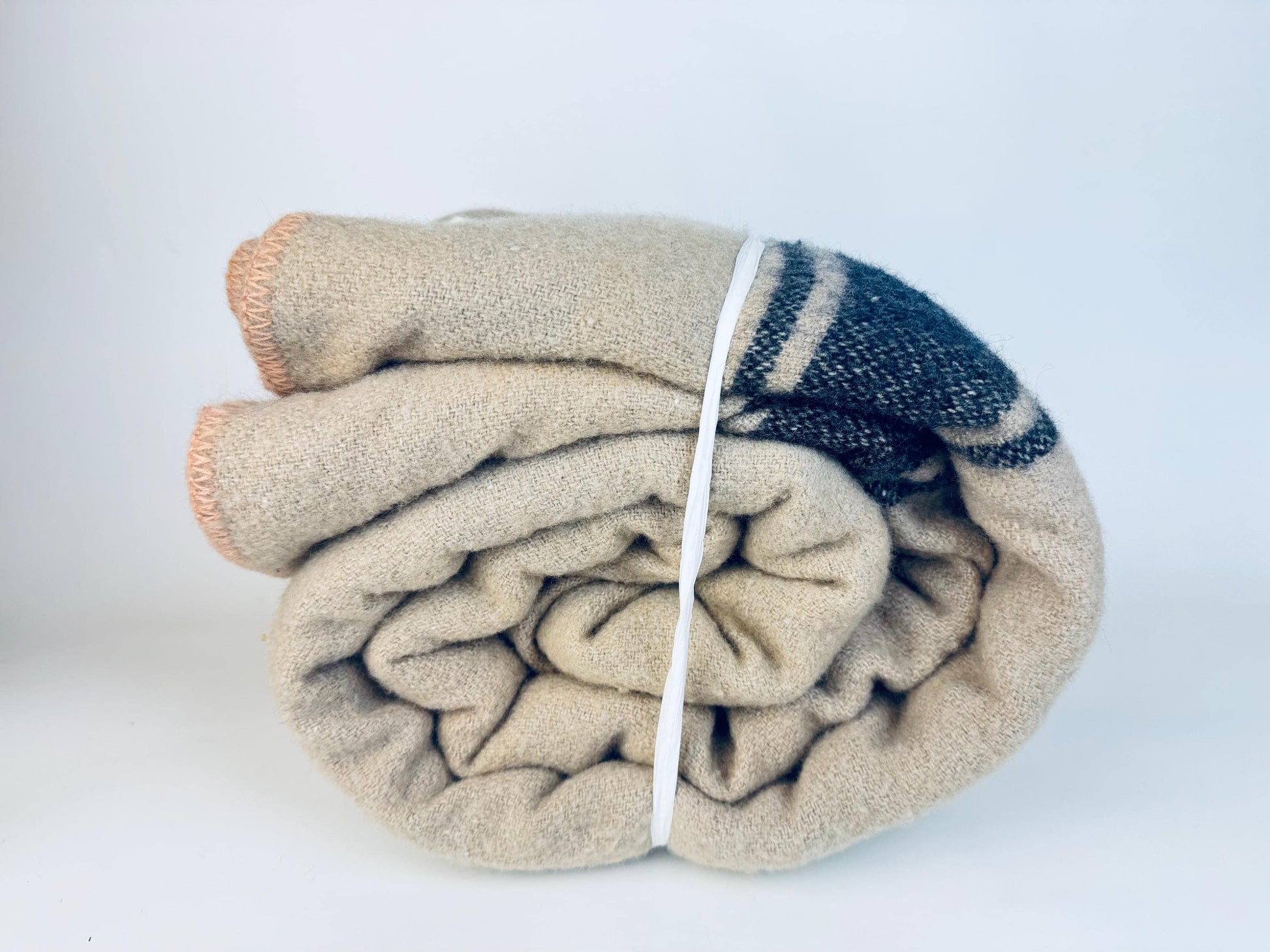 Vintage 1950s Beige Wool-Blend Hercules Camp Blanket with Indigo Stripe - 78×87