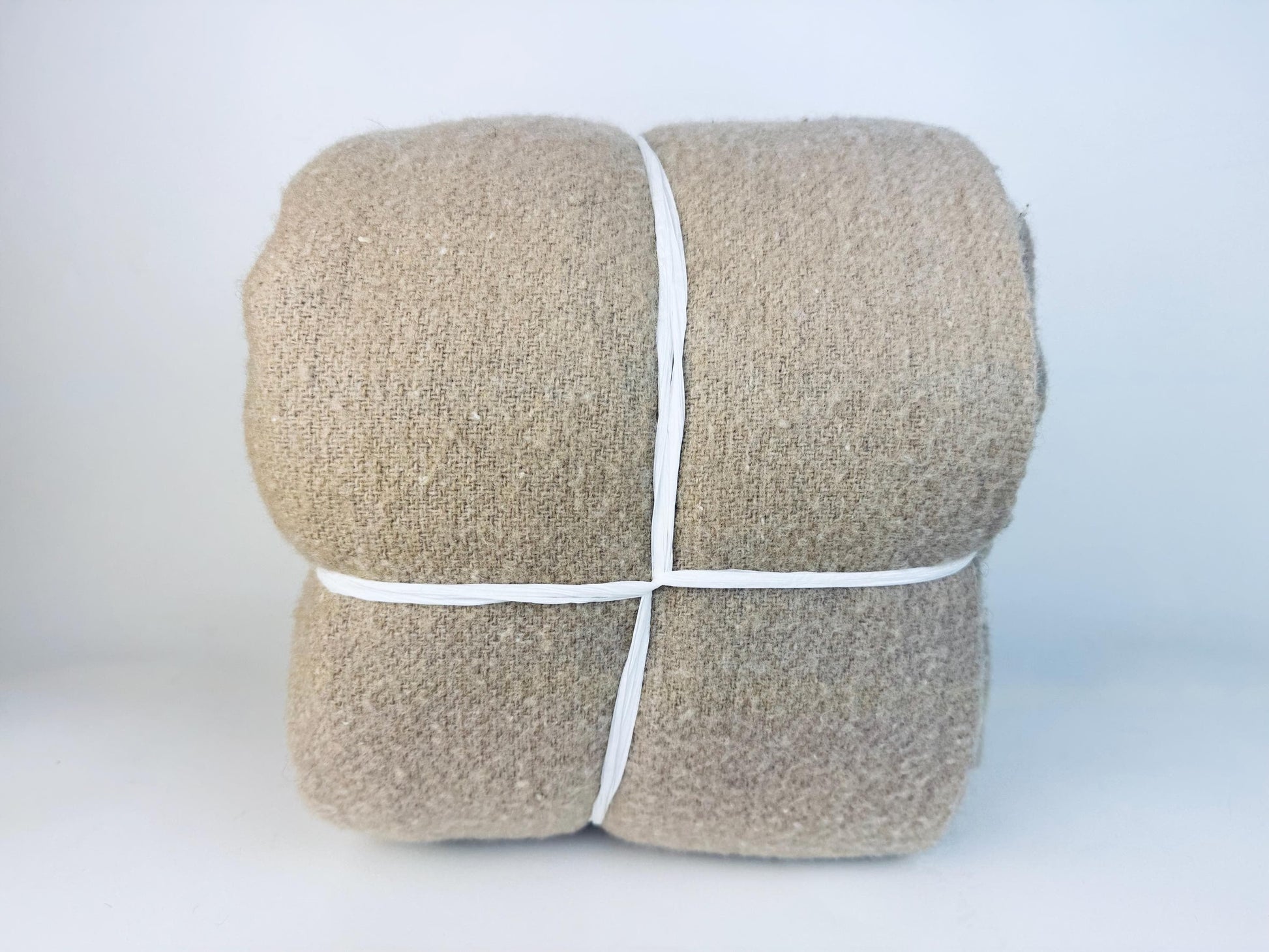 🐑 🟦 A softly woven archival camp blanket in warm sand-beige with a bold indigo stripe detailing — circa late 1950s to early 1960s, this wool-blend piece offers expansive 78″×87″ dimensions and blanket-stitched edge, perfect for styling over a sofa, layering on a bed or elevating outdoor lounging.
