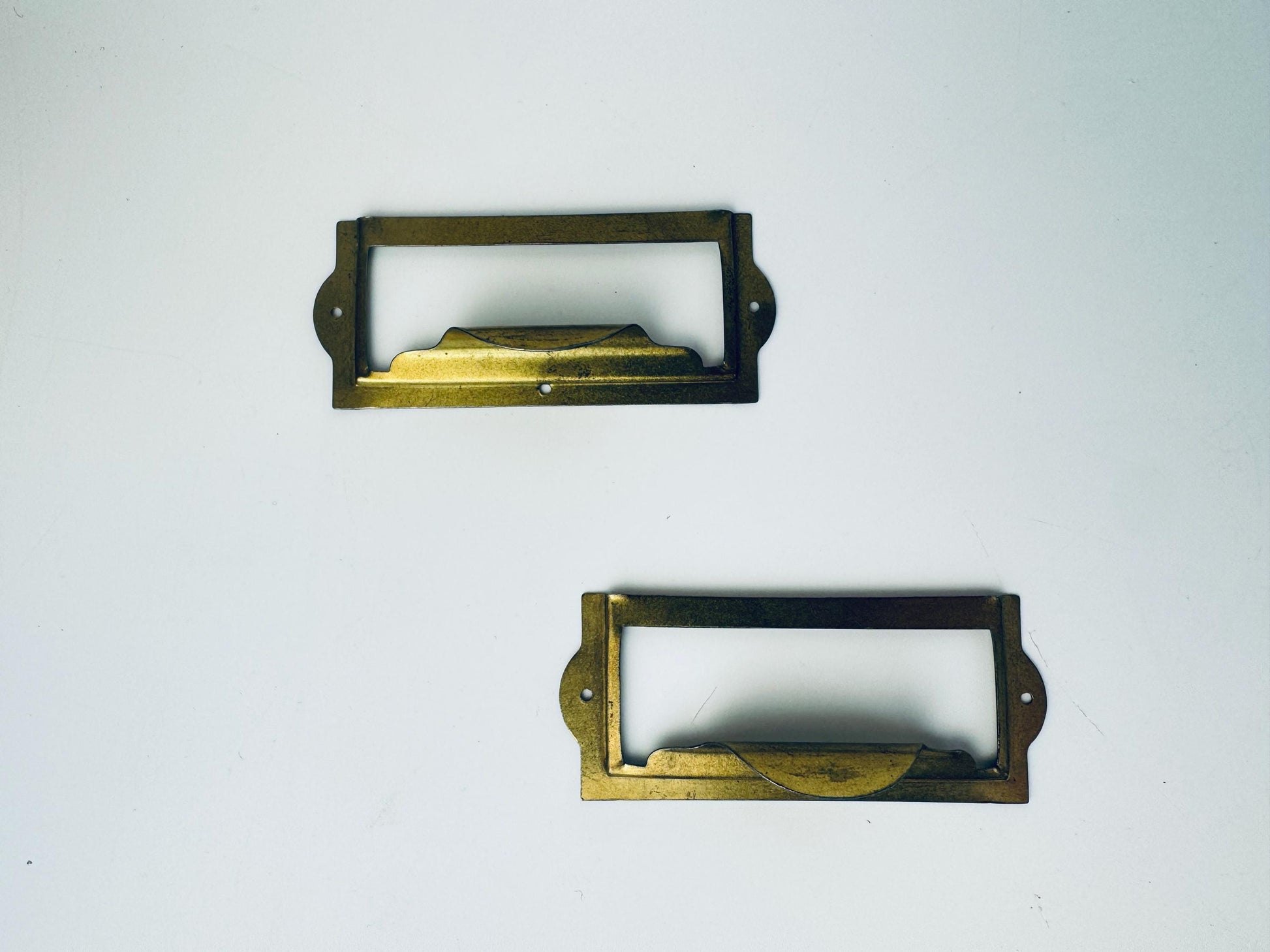 🟨 Classic 1950s brass label-holder drawer pulls that combine practical form and quiet charm. Featuring a warm golden finish and signature card-frame slot, each pull offers both an easy grip and a timeless hardware detail for cabinets, chests, or desk restorations. Choose between the heavier solid brass or lighter stamped style.