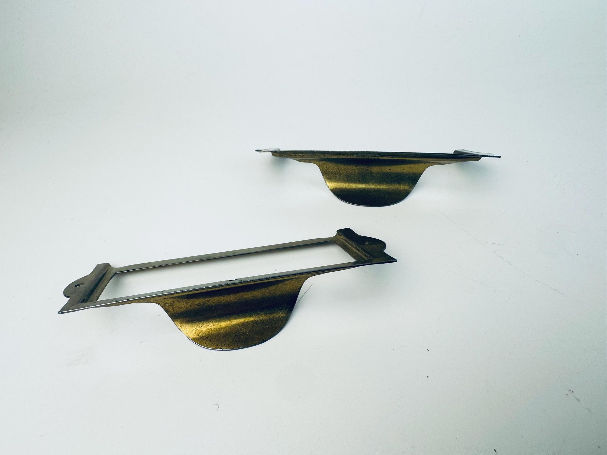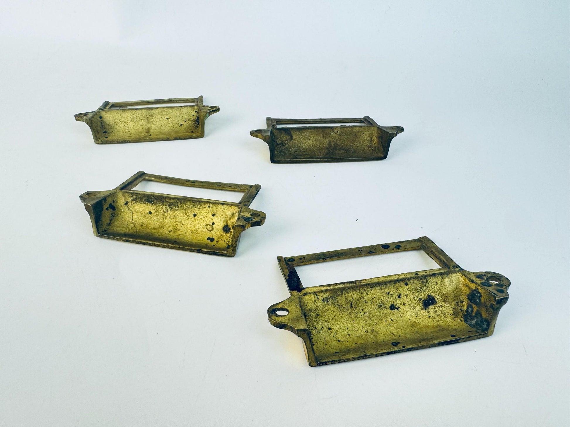 Brass label-holder pulls like these became standard fittings in mid-century offices and libraries, used to catalogue everything from files to small hardware parts. Produced throughout the 1950s and early 1960s, they reflect a period when utility design met craftsmanship — built to last, yet refined enough to suit domestic furniture revival projects today.