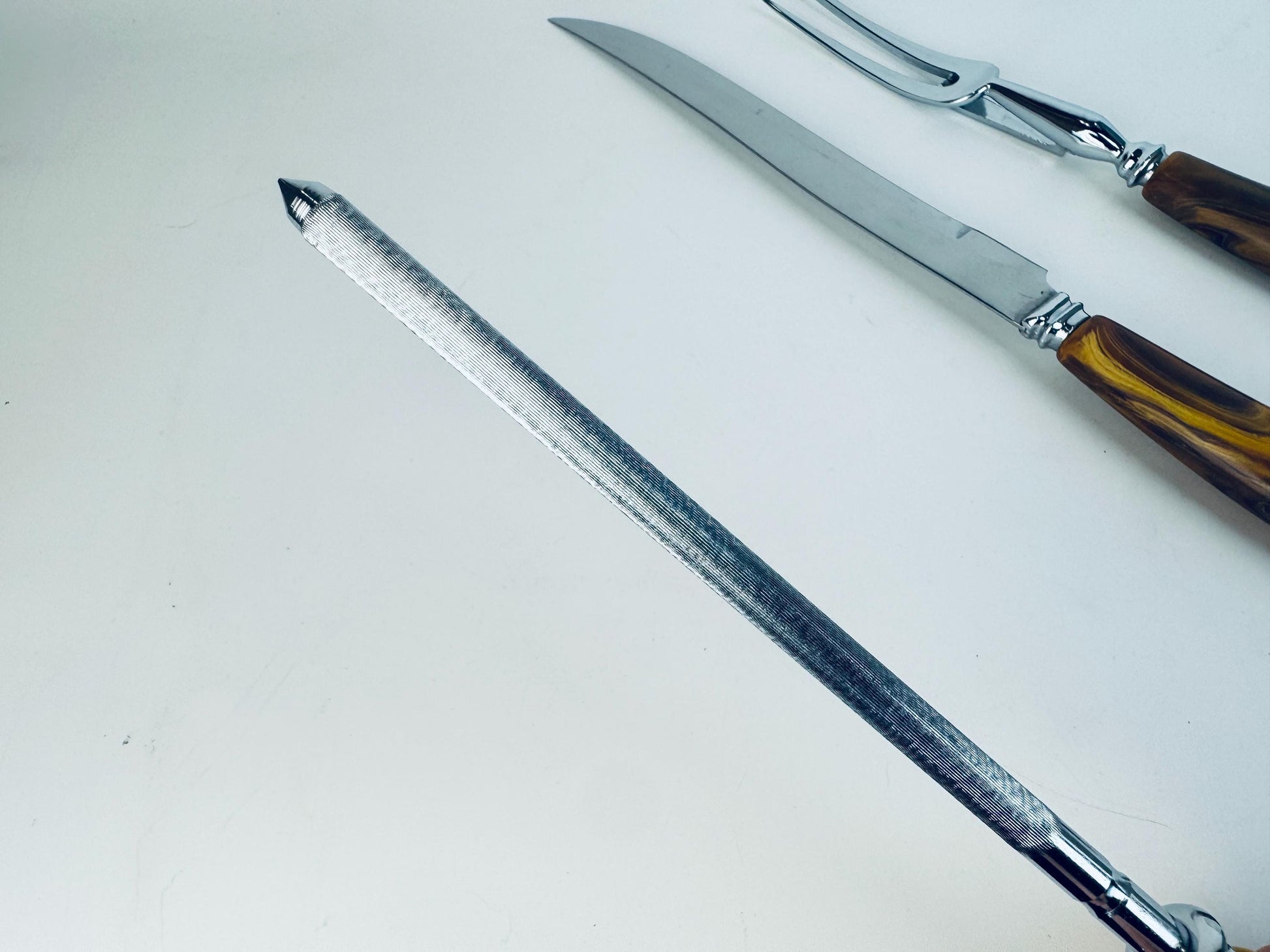 đœïž A refined mid-century carving set by Glo-Hill Cutlery of Montreal, celebrated for their âConnoisseurs Choiceâ line of elegant serveware. This 1950s John Palmer stainless-steel trio, made in Canada, features richly swirled butterscotch Bakelite handles and a satin-lined display case. Ideal for festive roasts or collectors of timeless Canadian craftsmanship.