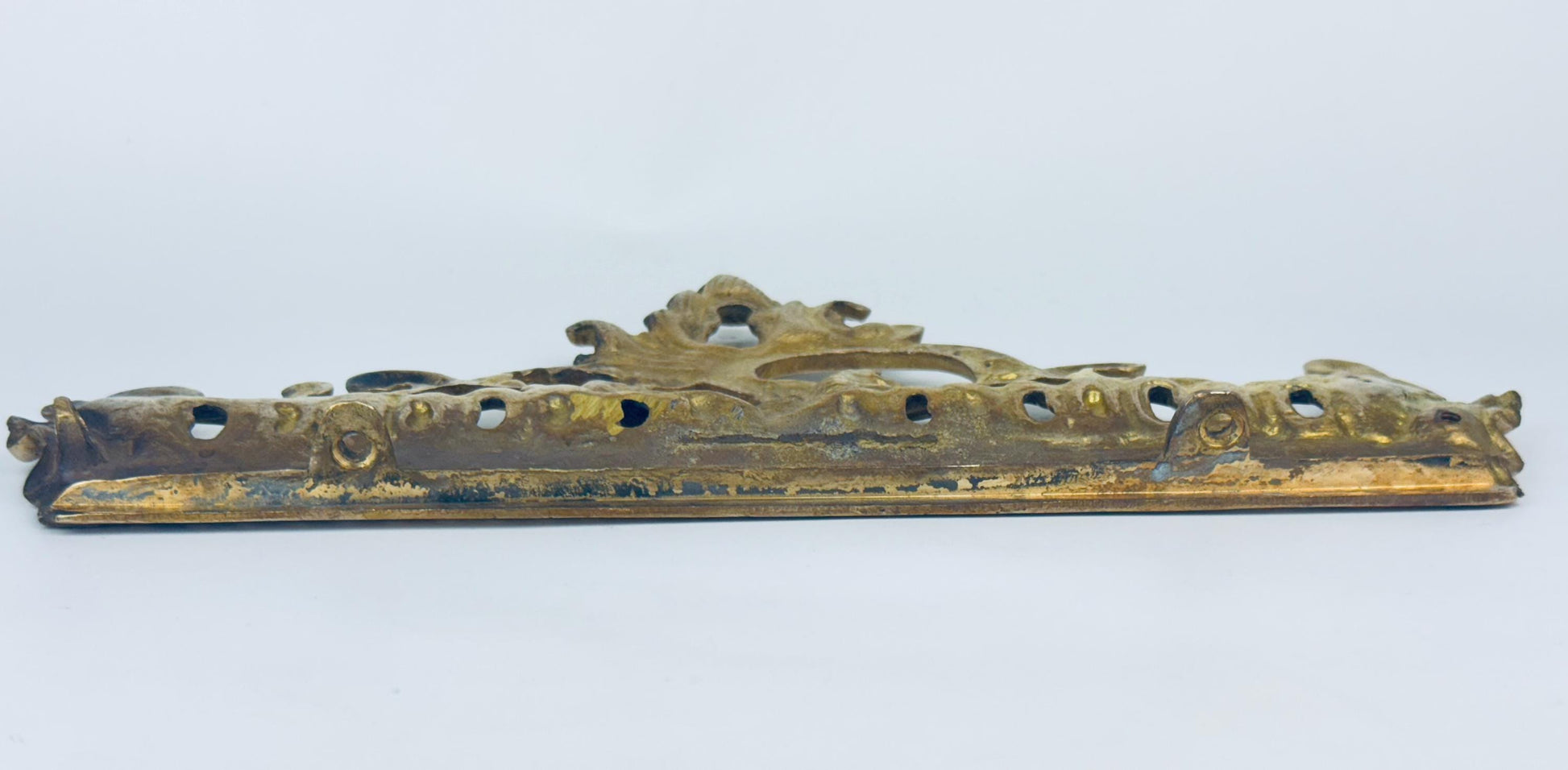 ✨ A lavish mid‑20th century solid brass pediment in opulent Rococo‑Revival style, its ornate scrolls, acanthus motifs, and rich gilded patina elevate any mirror, headboard, or cabinetry as a striking restoration or architectural accent. Crafted in the 1950s with elegant openwork detail, this decorative furniture mount seamlessly blends vintage glamour with timeless design.