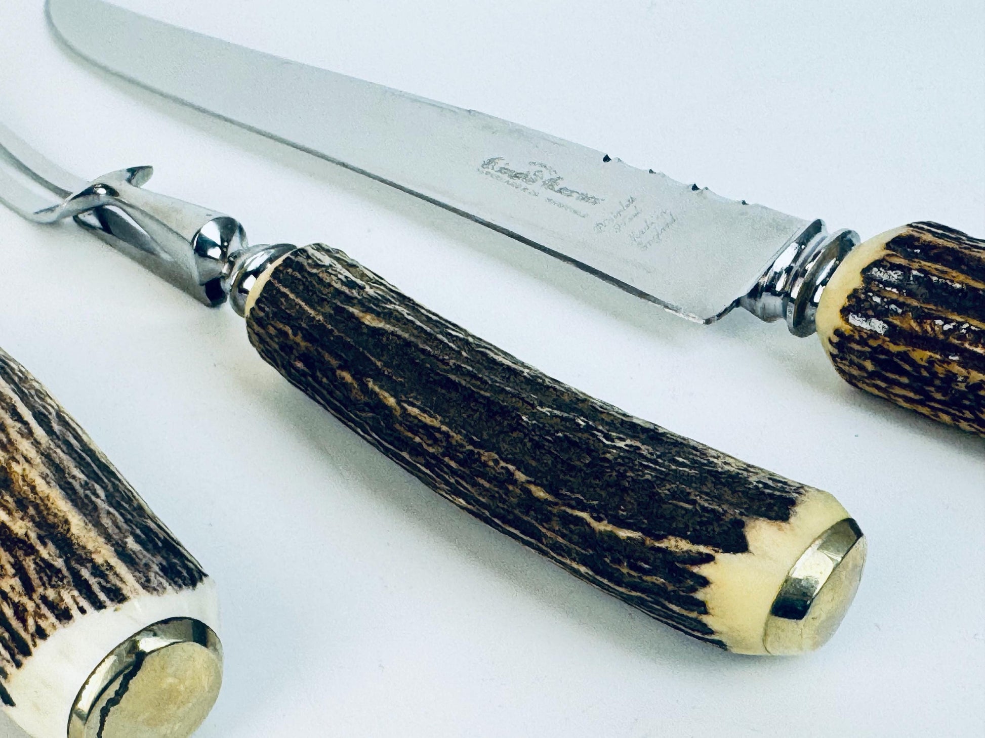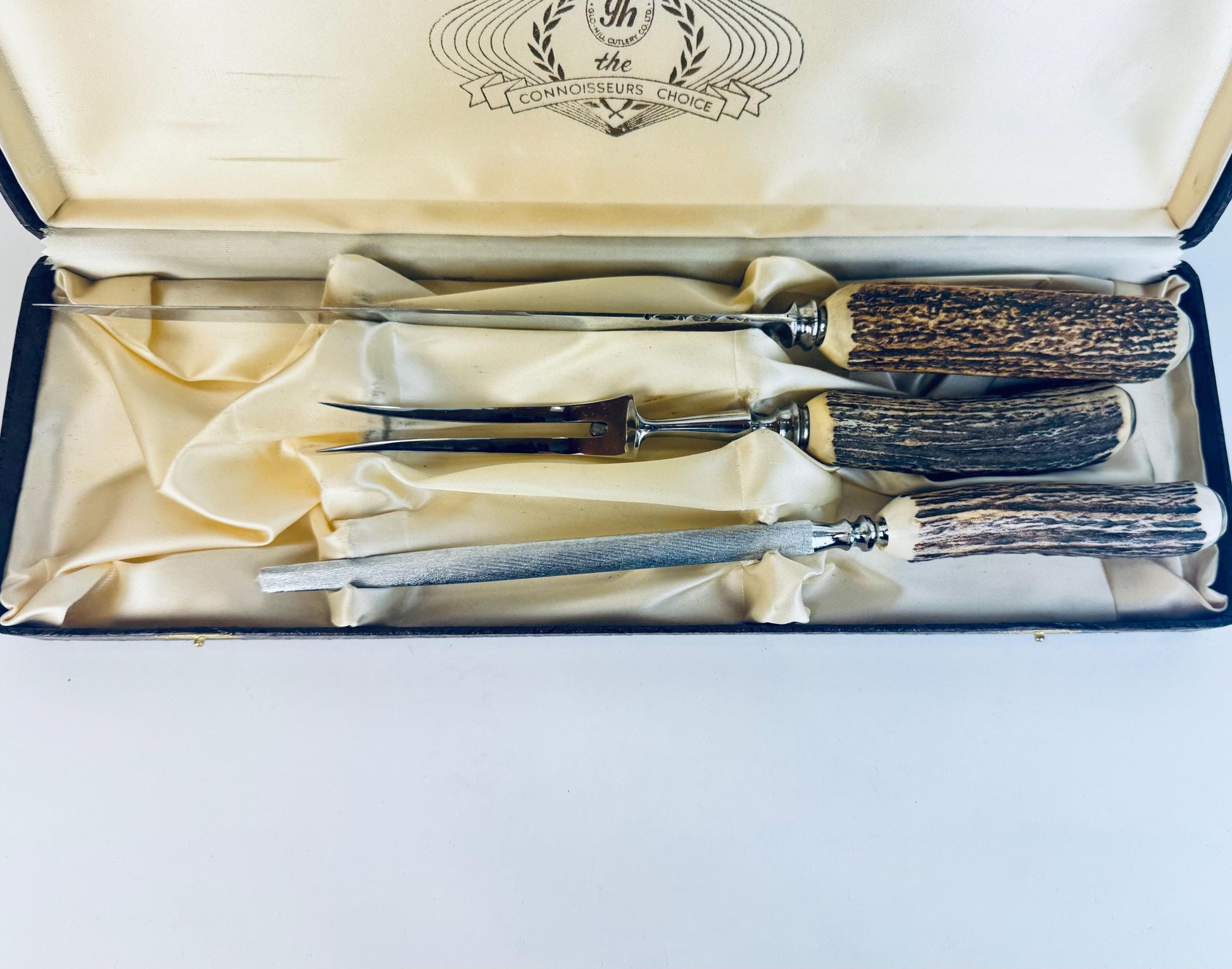 âHistory Behind The Pieceâ Founded in Montreal in 1945, Glo-Hill Cutlery Co. Ltd. became one of Canadaâs most respected names in mid-century tableware, known for collaborating with Sheffield makers such as M. Bernard & Co. under their âDuracutâ line. The Connoisseurs Choice branding marked their premium imports, blending English steelwork with Glo-Hillâs refined Canadian presentation. Production of these antler-handled carving sets peaked through the 1950sâ1960s, symbolising postwar craftsmanship and domestic elegance.