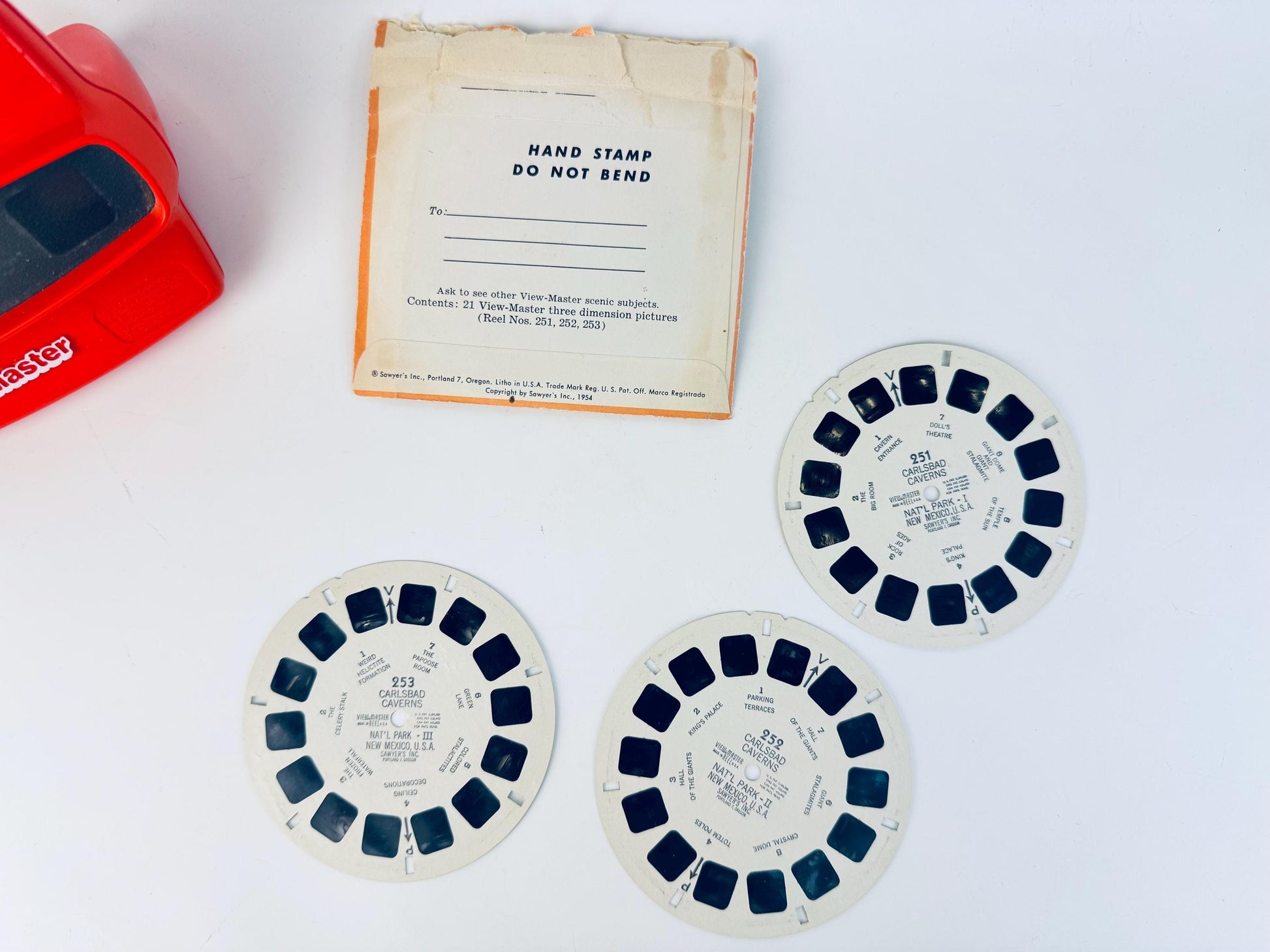 📸 A nostalgic 1950s travel set featuring original View-Master stereoscopic reels with their richly coloured paper sleeves—one showcasing Carlsbad Caverns National Park (New Mexico) and the other depicting Marine Studios in Florida. These mid-century reel sets offer distinctive typography, early Sawyer’s Inc. graphics, and immersive 3D scenes perfect for collectors, photography lovers, or display styling in a curated vintage home.