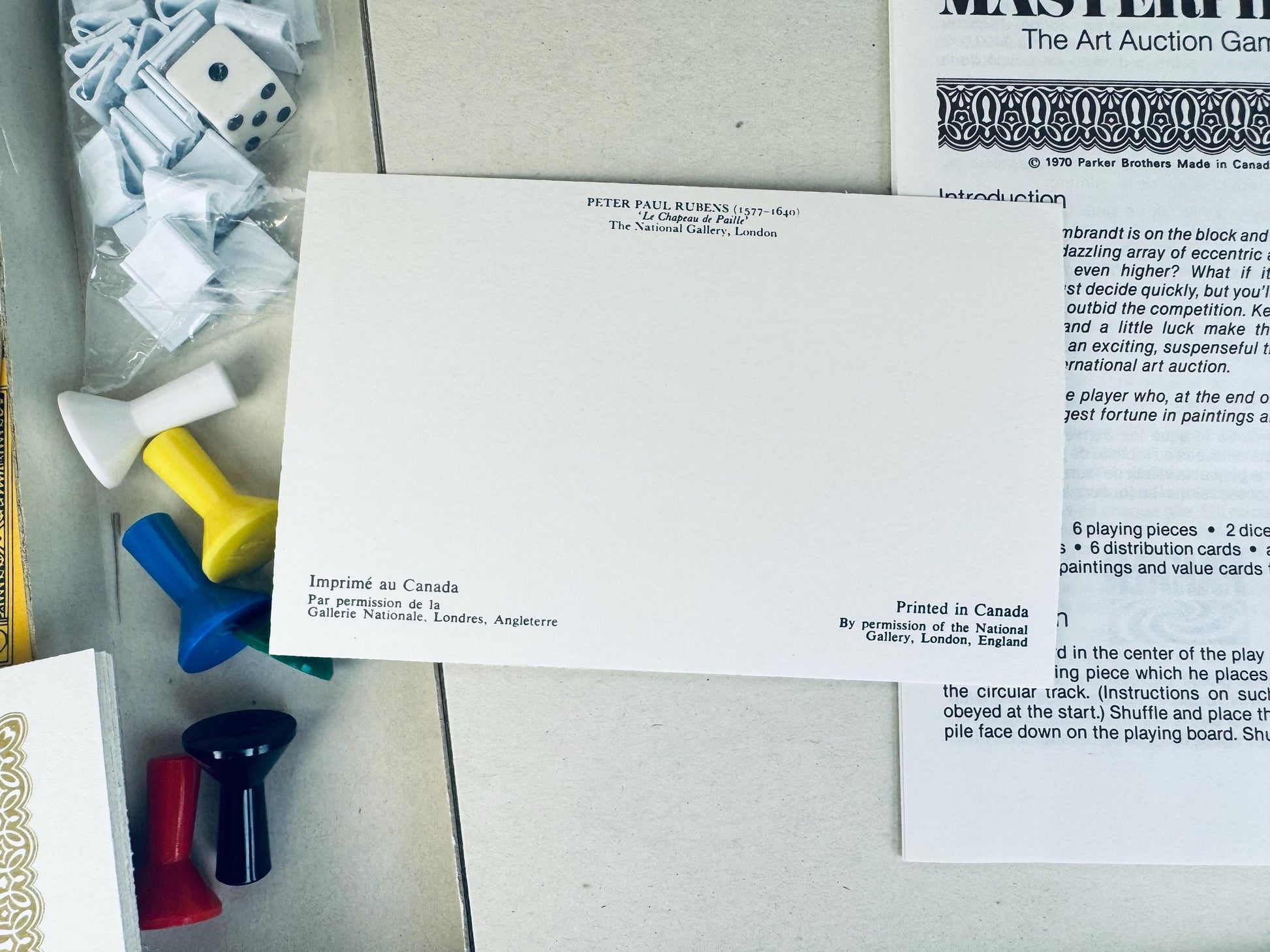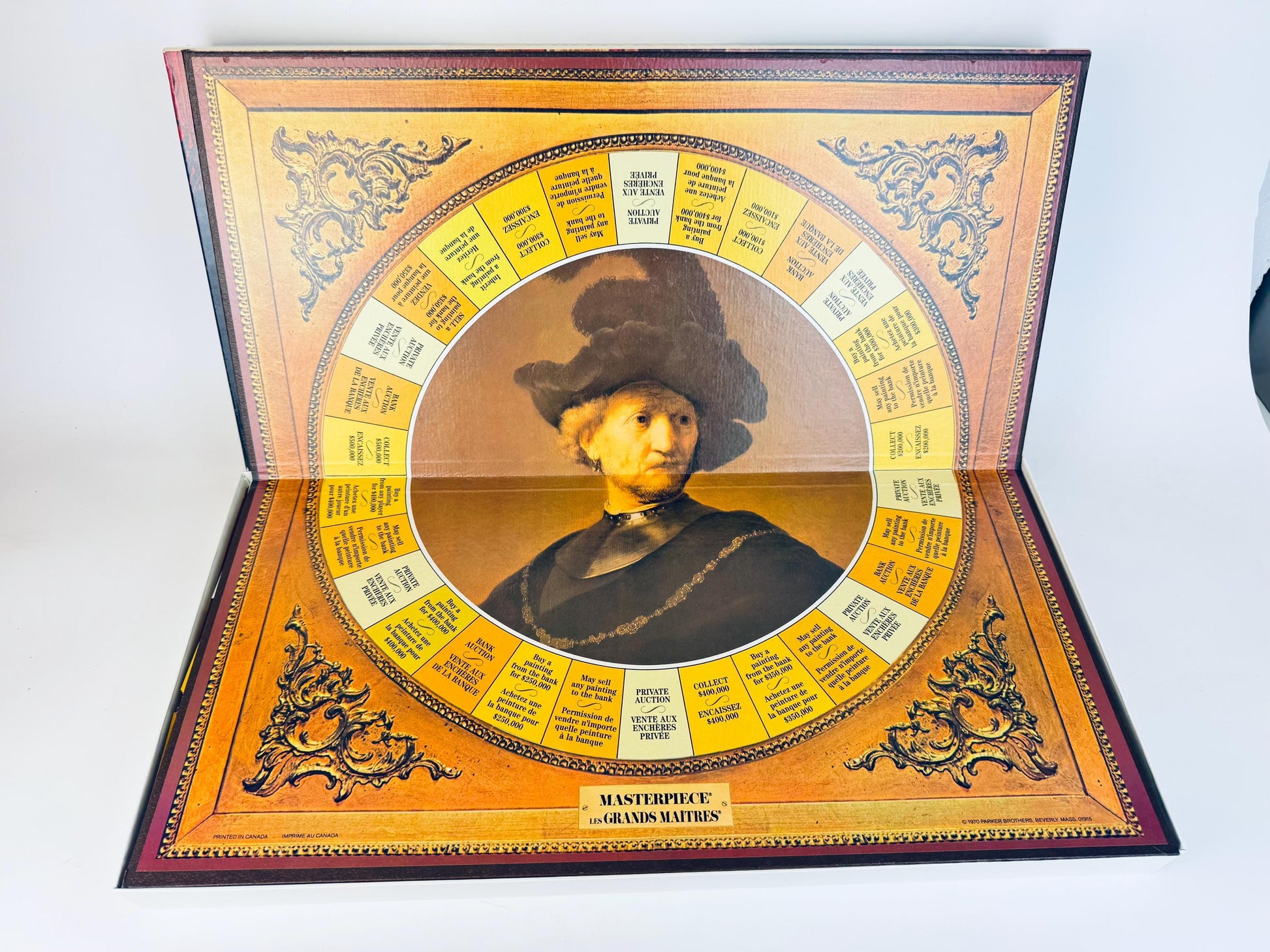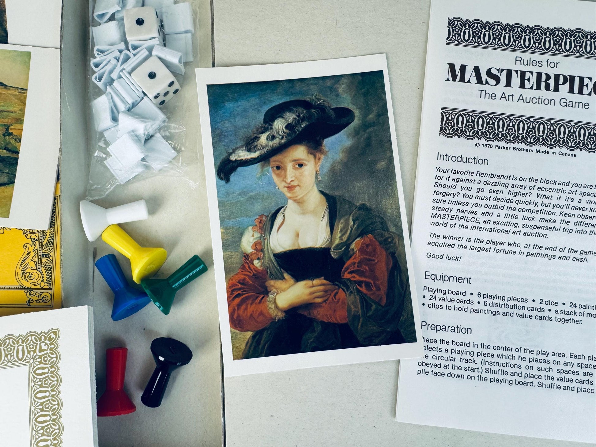 🎨 Step into the world of high-stakes art collecting with this vintage Masterpiece: The Art Auction Game by Parker Brothers. Produced in Canada in 1970, this bilingual English/French edition features richly printed currency, elegant auction cards, and a beautifully illustrated board centred around a Rembrandt portrait. A perfect choice for collectors, design lovers, or game enthusiasts looking to display or play a sophisticated slice of 1970s culture.
