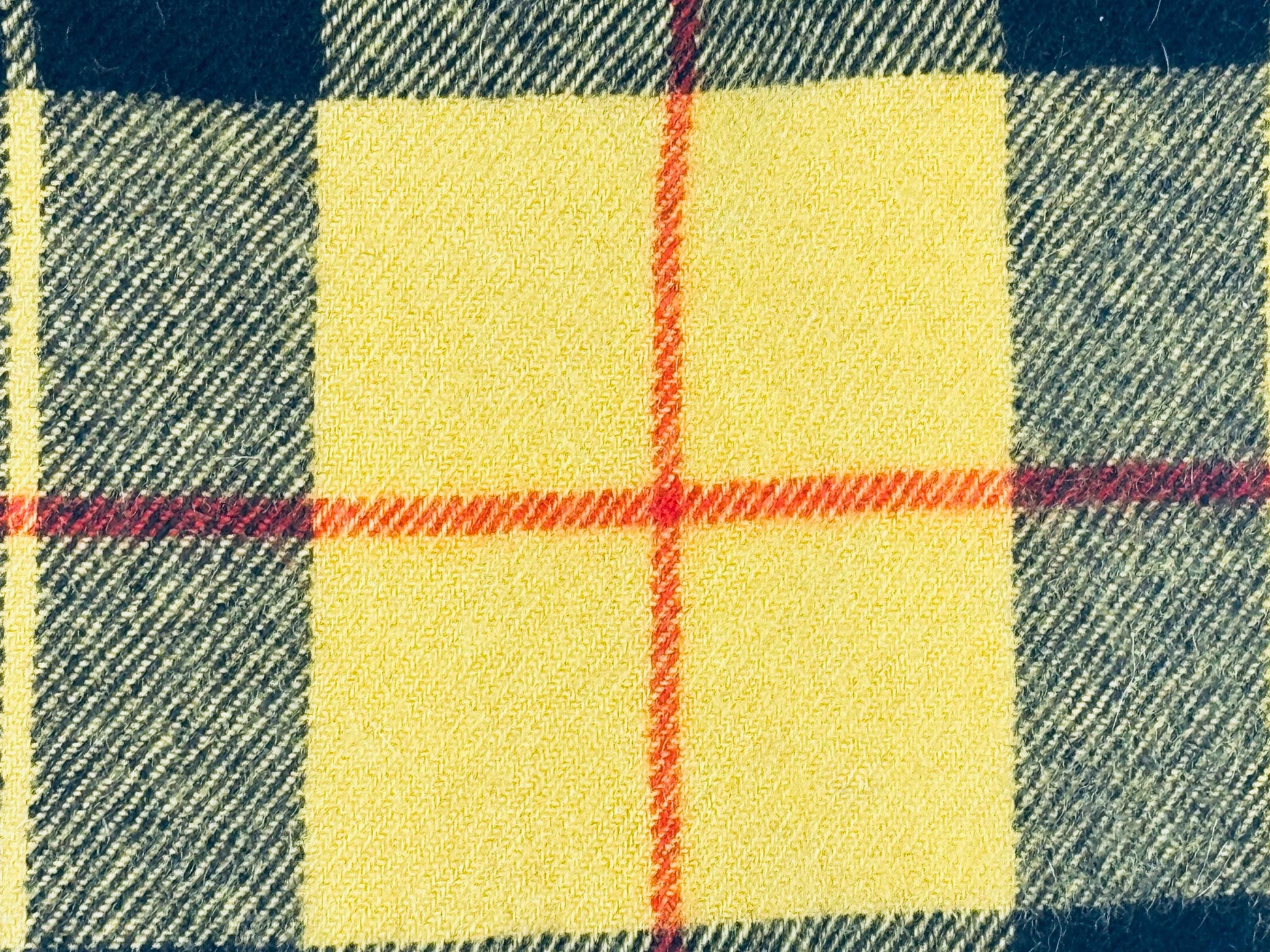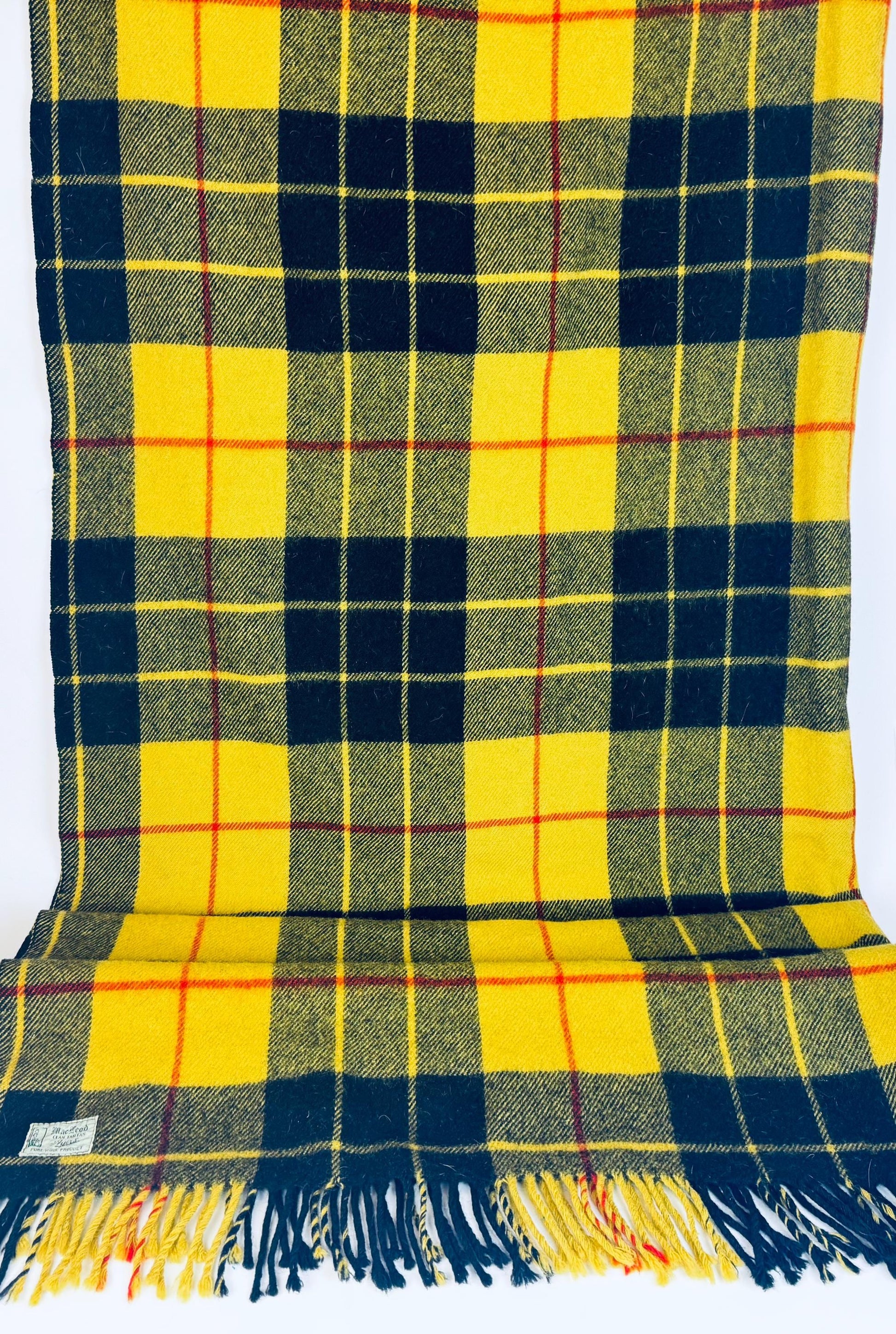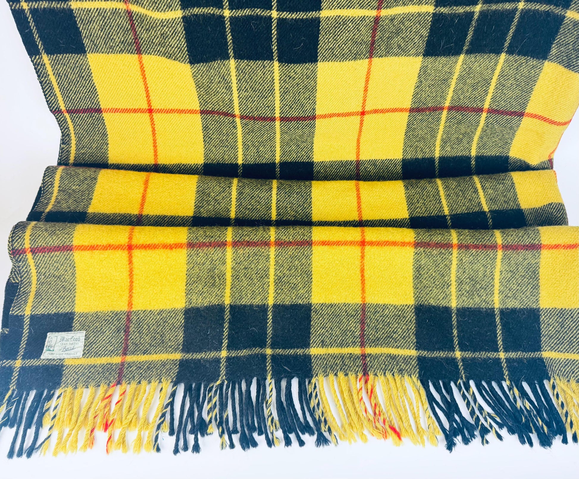 đšâŹ Sunlit and bold, this 1970s Ayers MacLeod Clan Tartan wool blanket glows with its signature golden yellow background framed by deep black and red accent stripes. Woven in pure wool with fringe ends, it serves beautifully as a sofa throw, bedspread accent, or layered textile in a luxe sitting room.