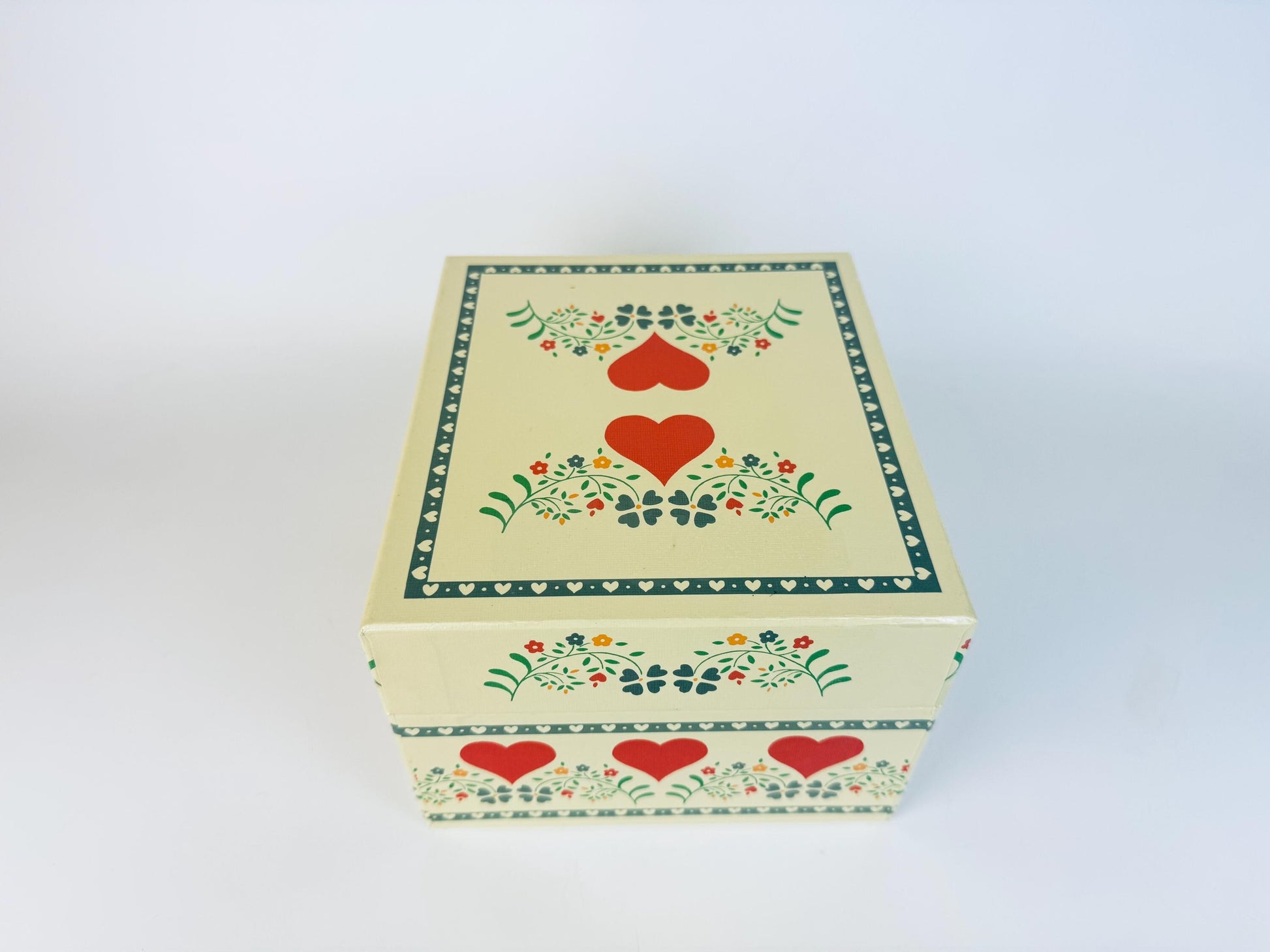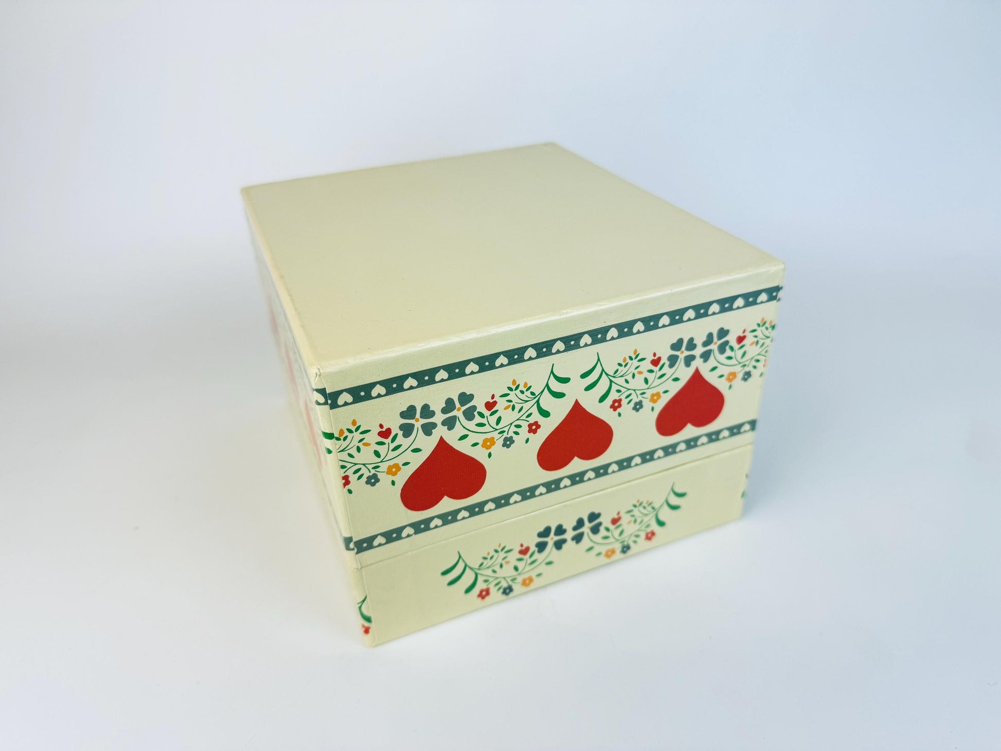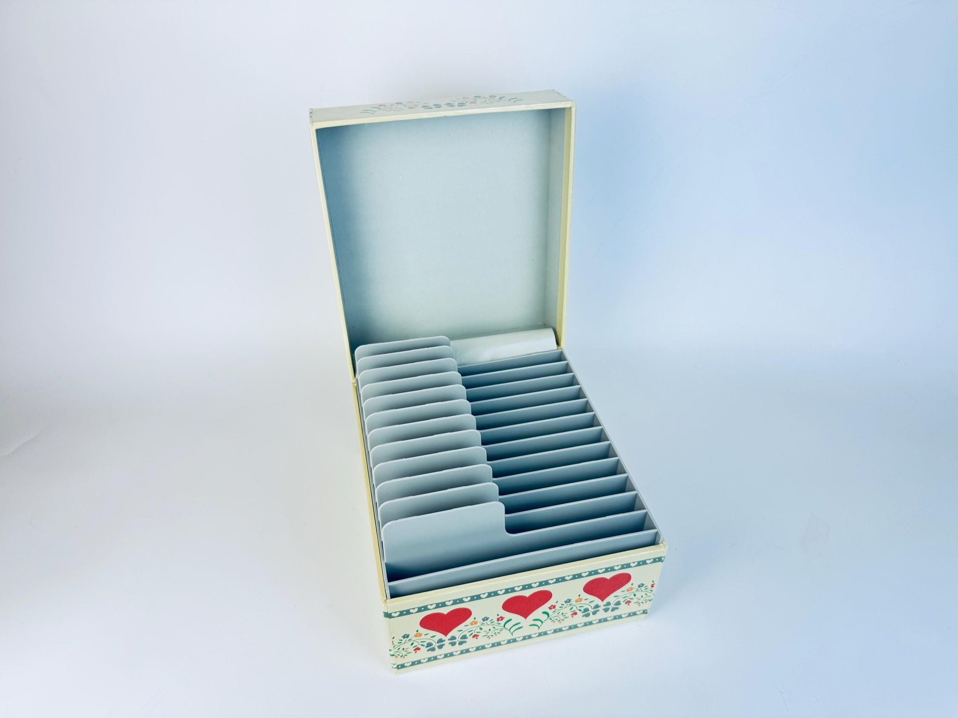 ❤️ A charming vintage recipe card box decorated with bold hearts and stylized florals in a classic folk-art motif. Designed with plastic tiered dividers to neatly hold recipes, index notes, or keepsakes, it brings both utility and nostalgic flair to kitchen counters or office shelves. A cheerful retro accent that captures the playful spirit of 1970s design.