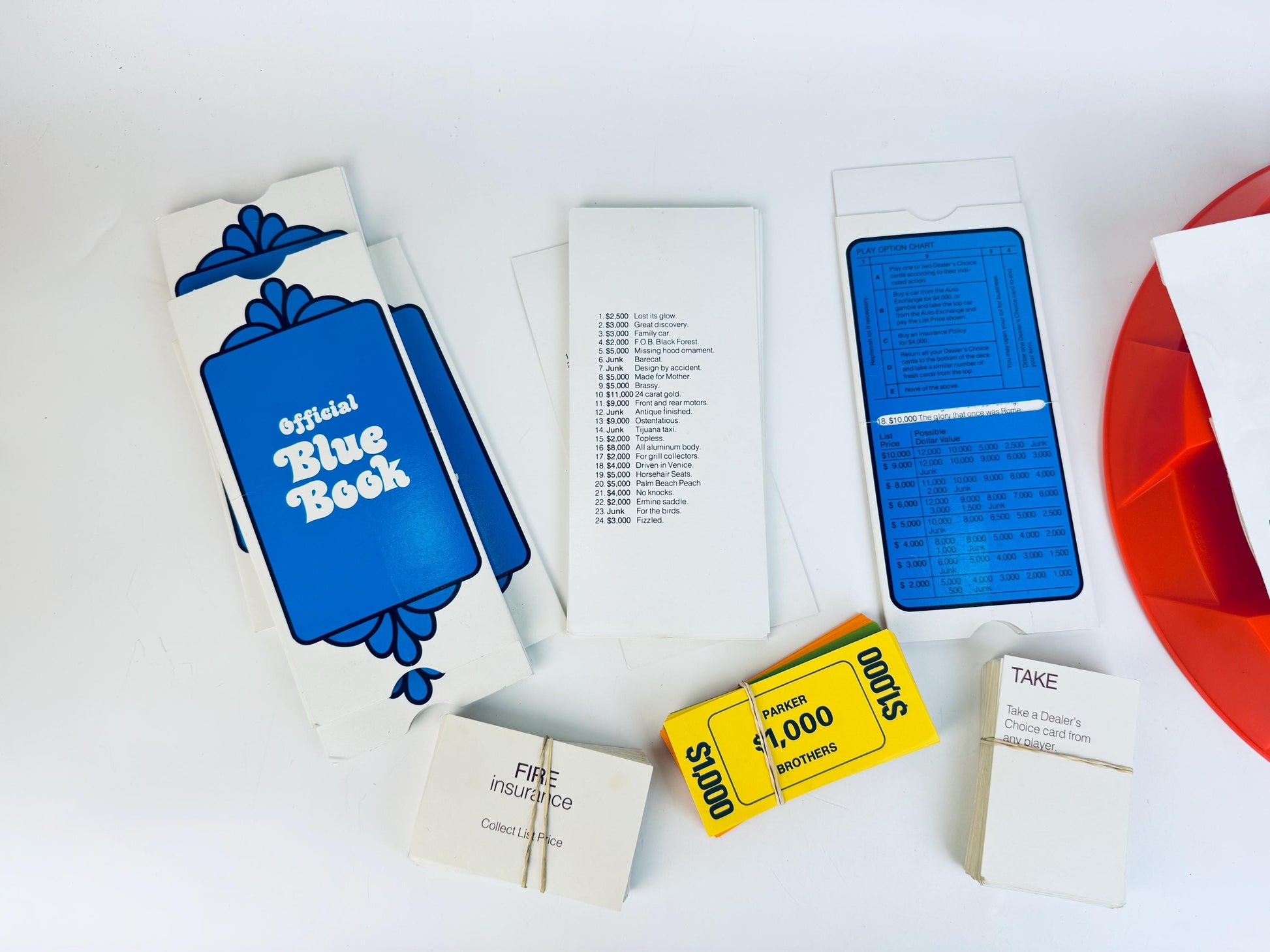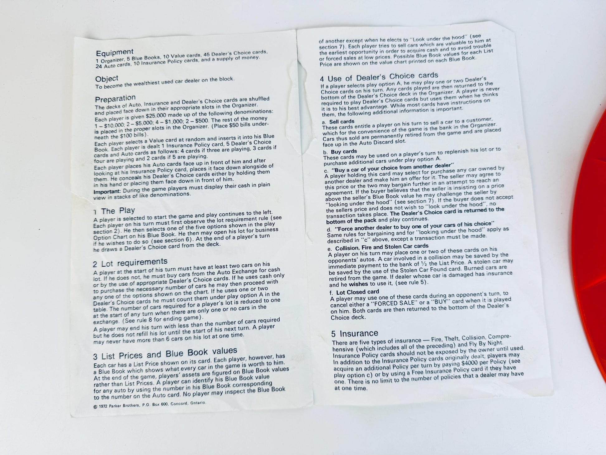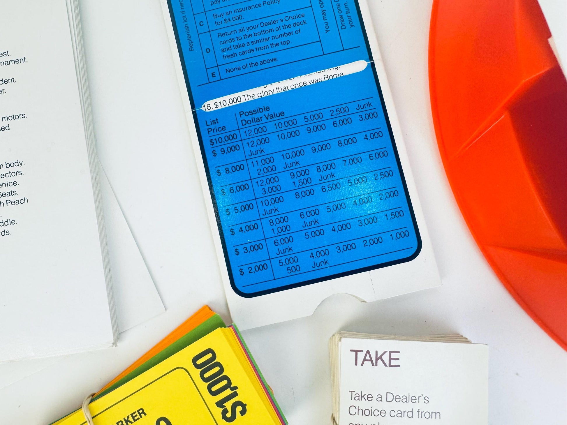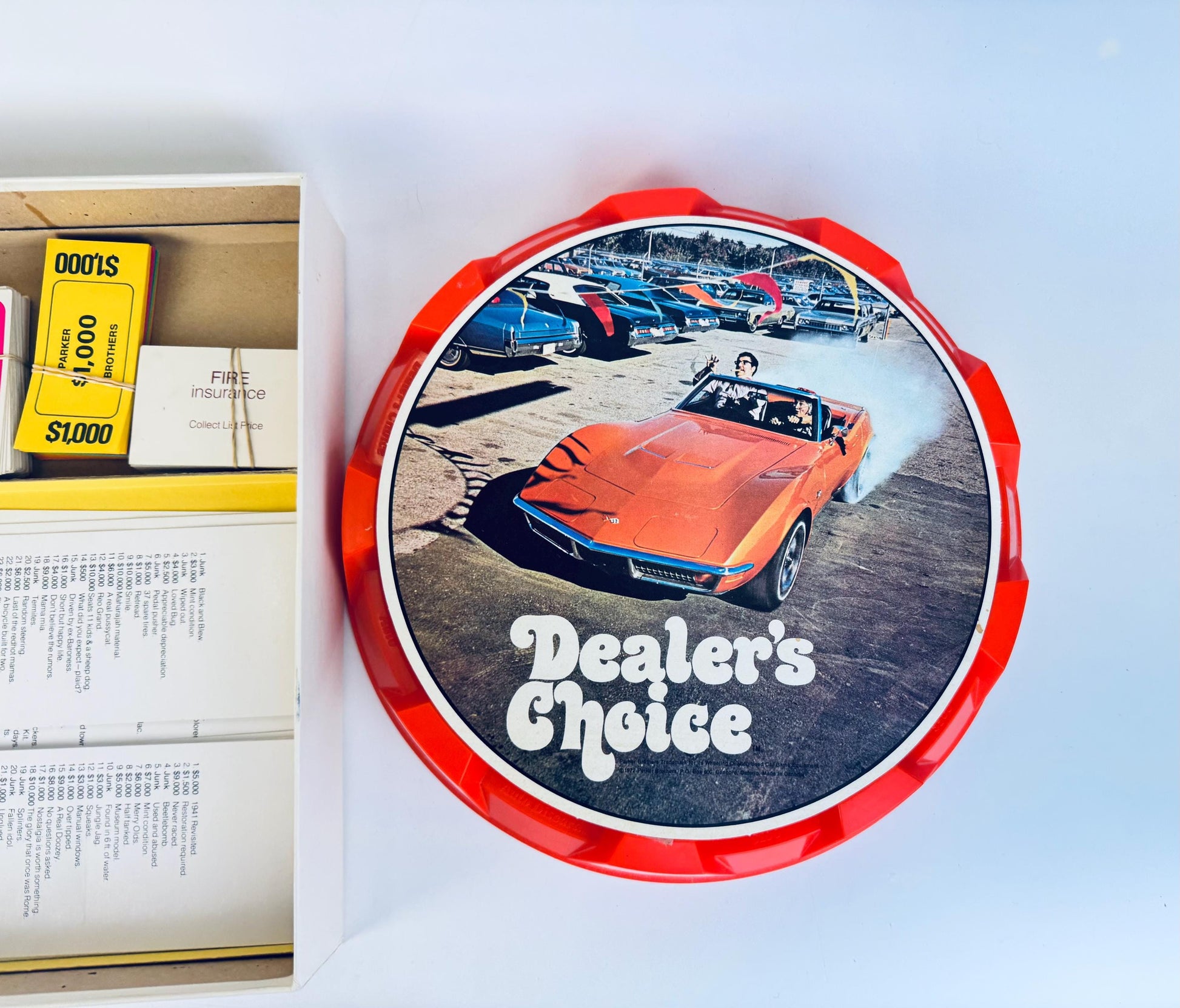 Parker Brothers, founded in the late 19th century, became one of the giants of American board gaming by the mid-20th century. In the 1970s they experimented with thematic economic gameplay tied to real-world motifs — Dealer’s Choice (copyright 1972) reflects that era’s fascination with car culture and negotiation.