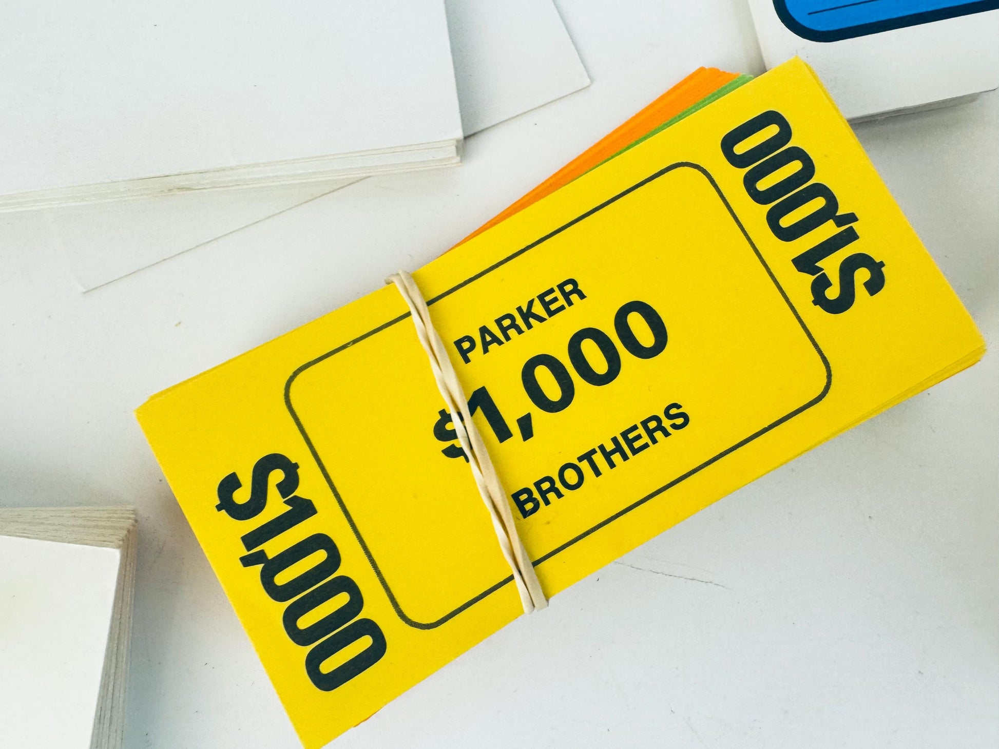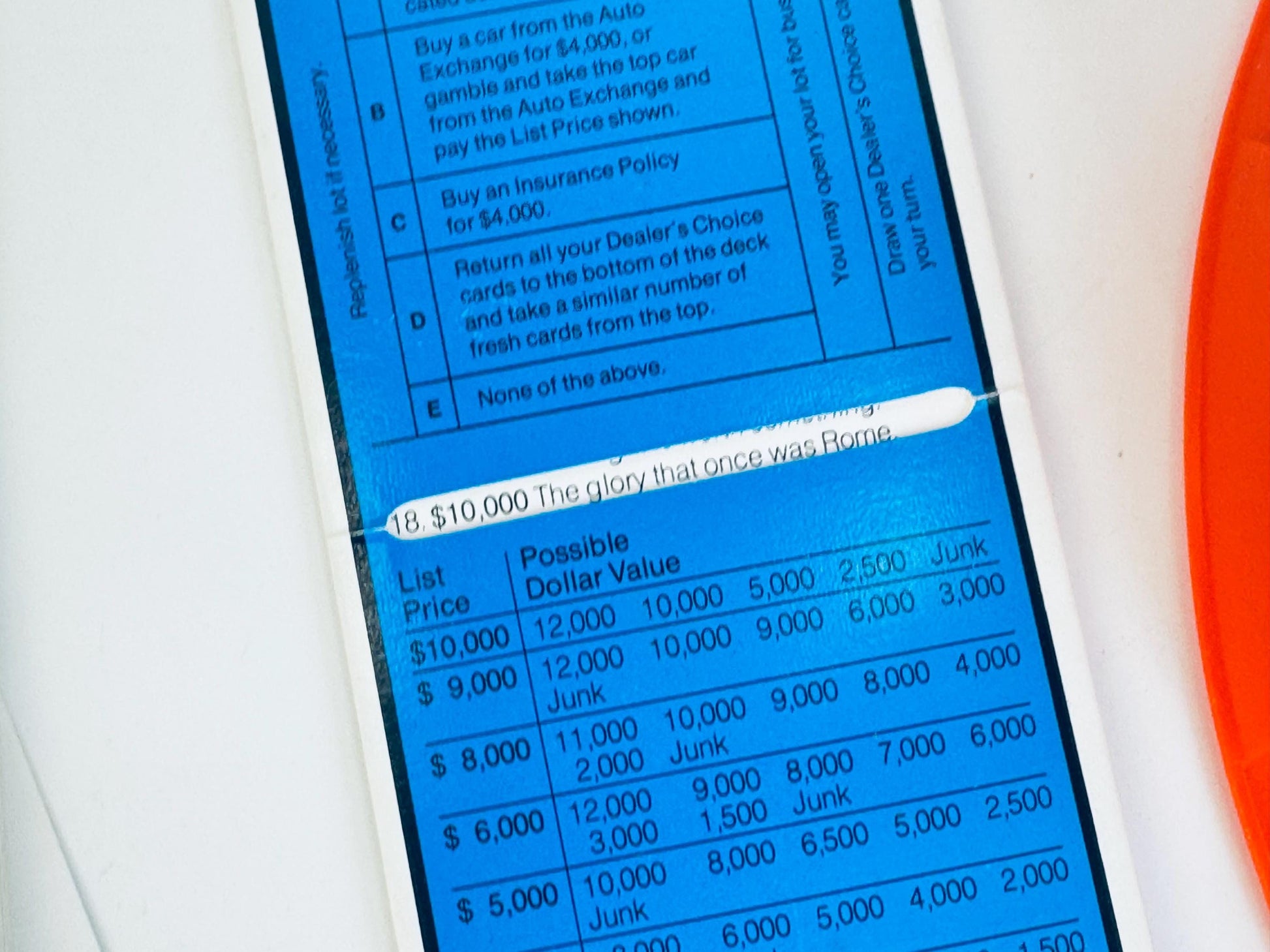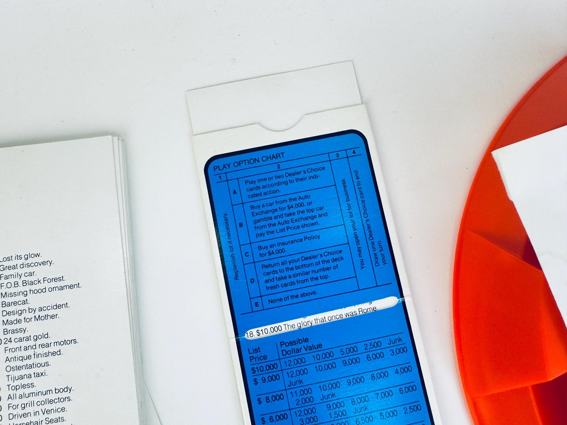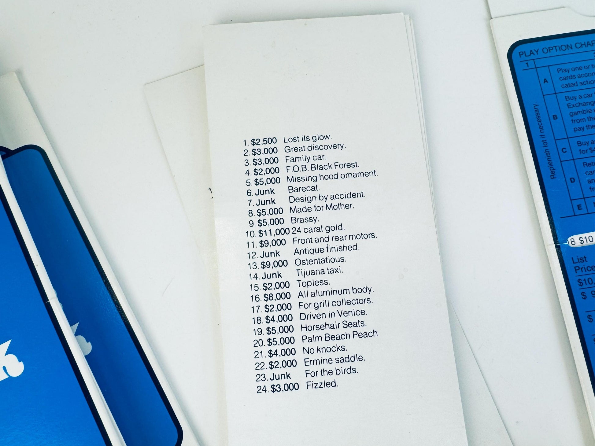 Parker Brothers, founded in the late 19th century, became one of the giants of American board gaming by the mid-20th century. In the 1970s they experimented with thematic economic gameplay tied to real-world motifs — Dealer’s Choice (copyright 1972) reflects that era’s fascination with car culture and negotiation.