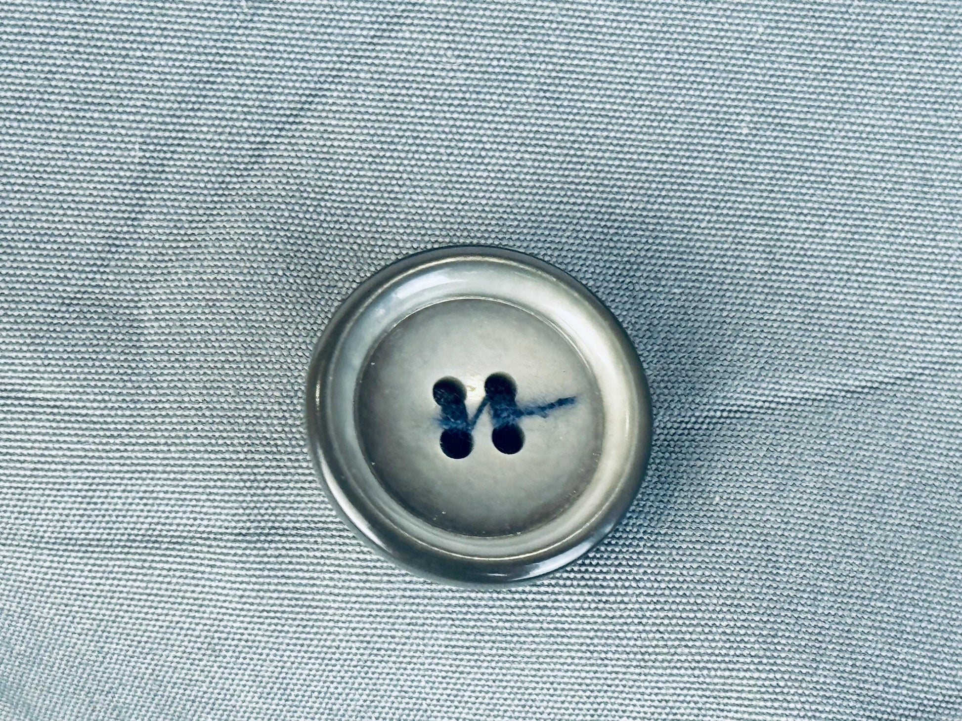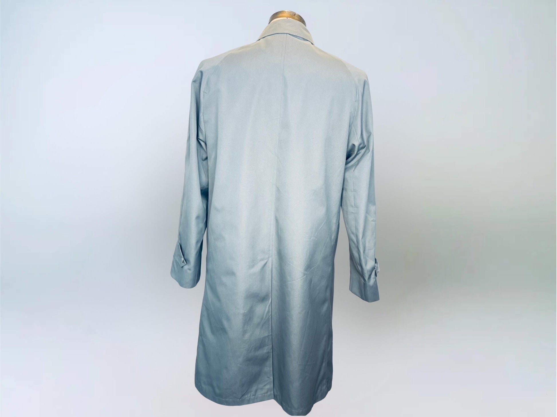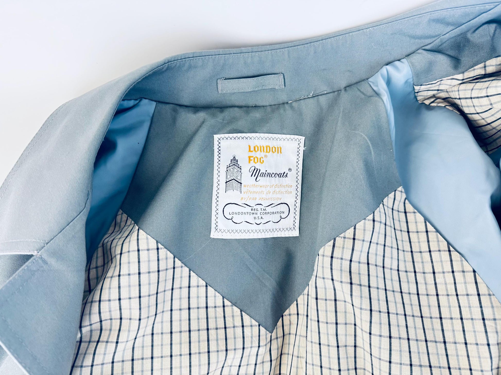 🧥 🌦️ A sophisticated 1970s London Fog Maincoats raincoat in a pale blue-grey cotton-poly blend, tailored with a minimalist fly-front concealed placket and a smooth plaid lining. Made in Canada under licence for the Londontown Corporation, it balances crisp structure with easy movement — a refined, weather-resistant layer ideal for spring and autumn wear.