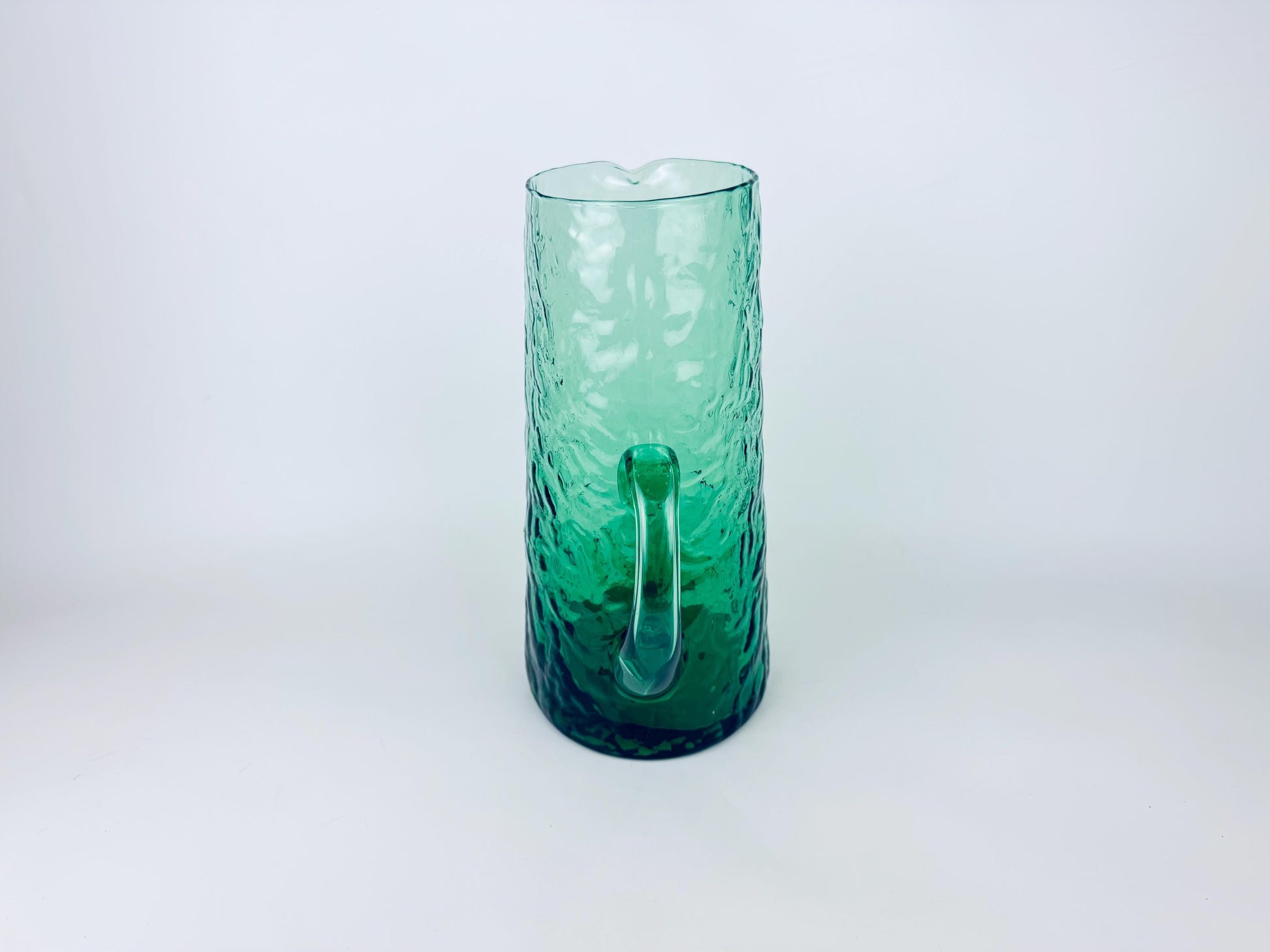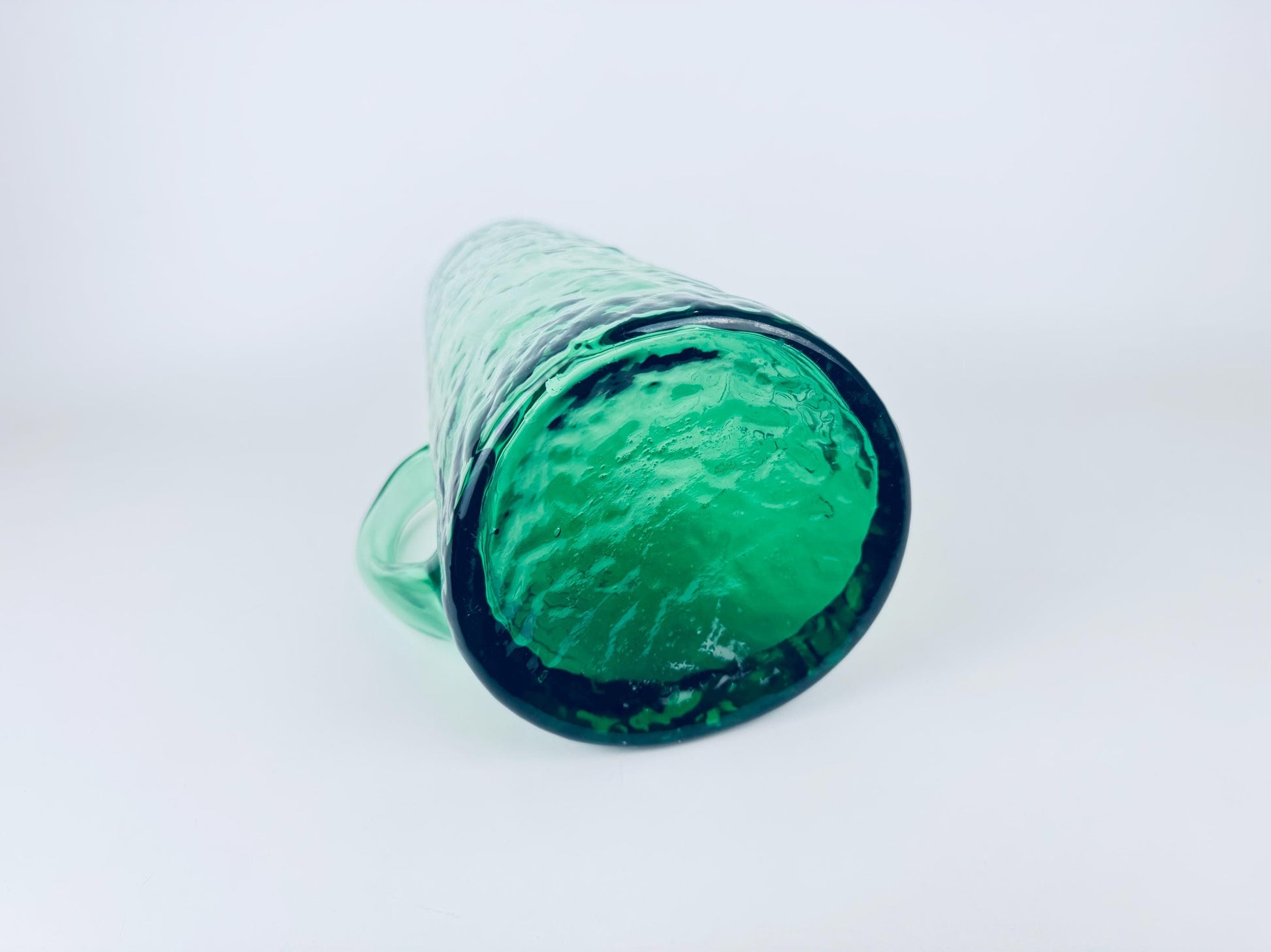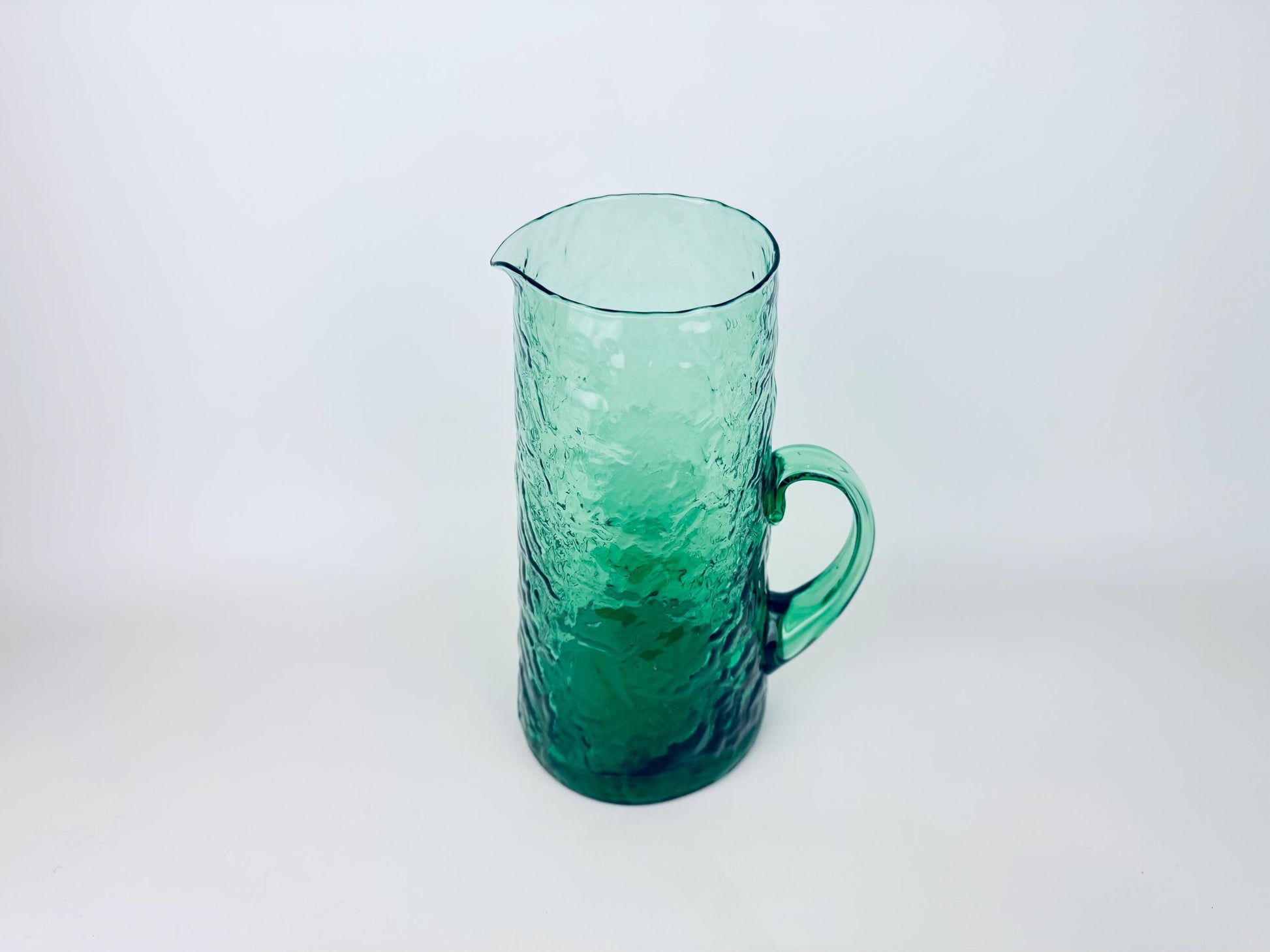 🌲 A striking forest-green 1970s textured glass pitcher crafted with a tall cylindrical silhouette, an applied pulled handle, and a subtle ice-crackle surface that catches the light beautifully. Its generous capacity and refined mid-century styling make it perfect for serving water, iced tea, or cocktails on a curated table.
