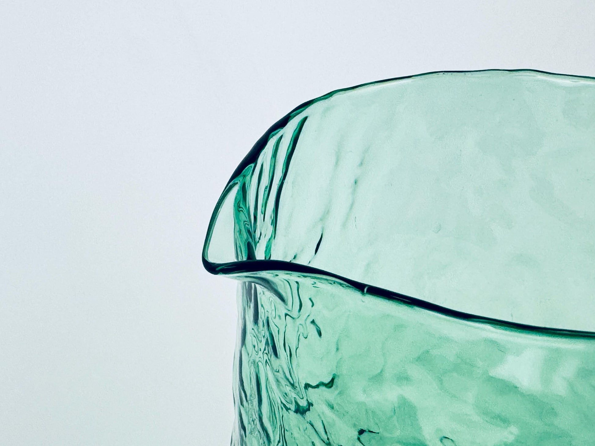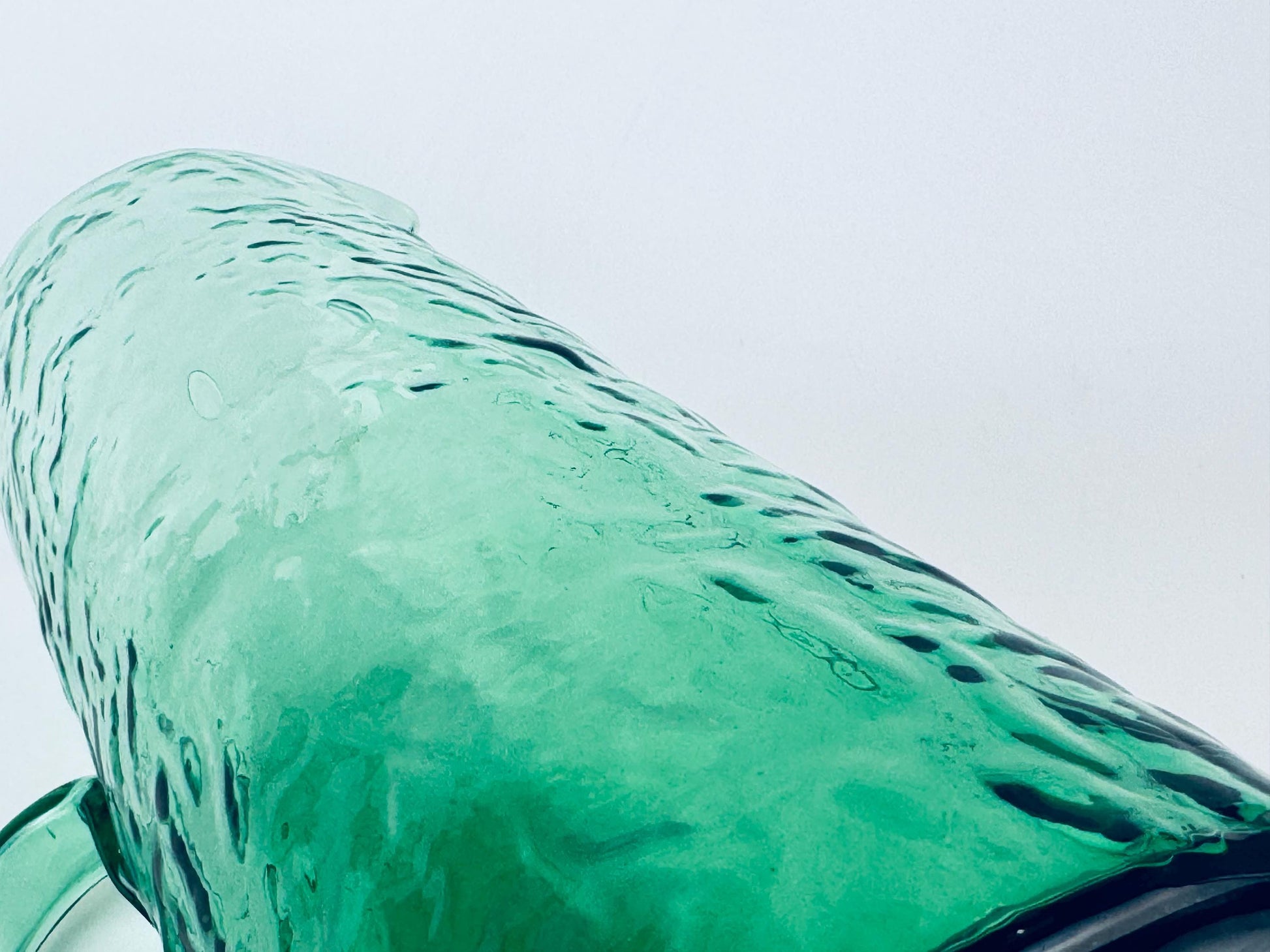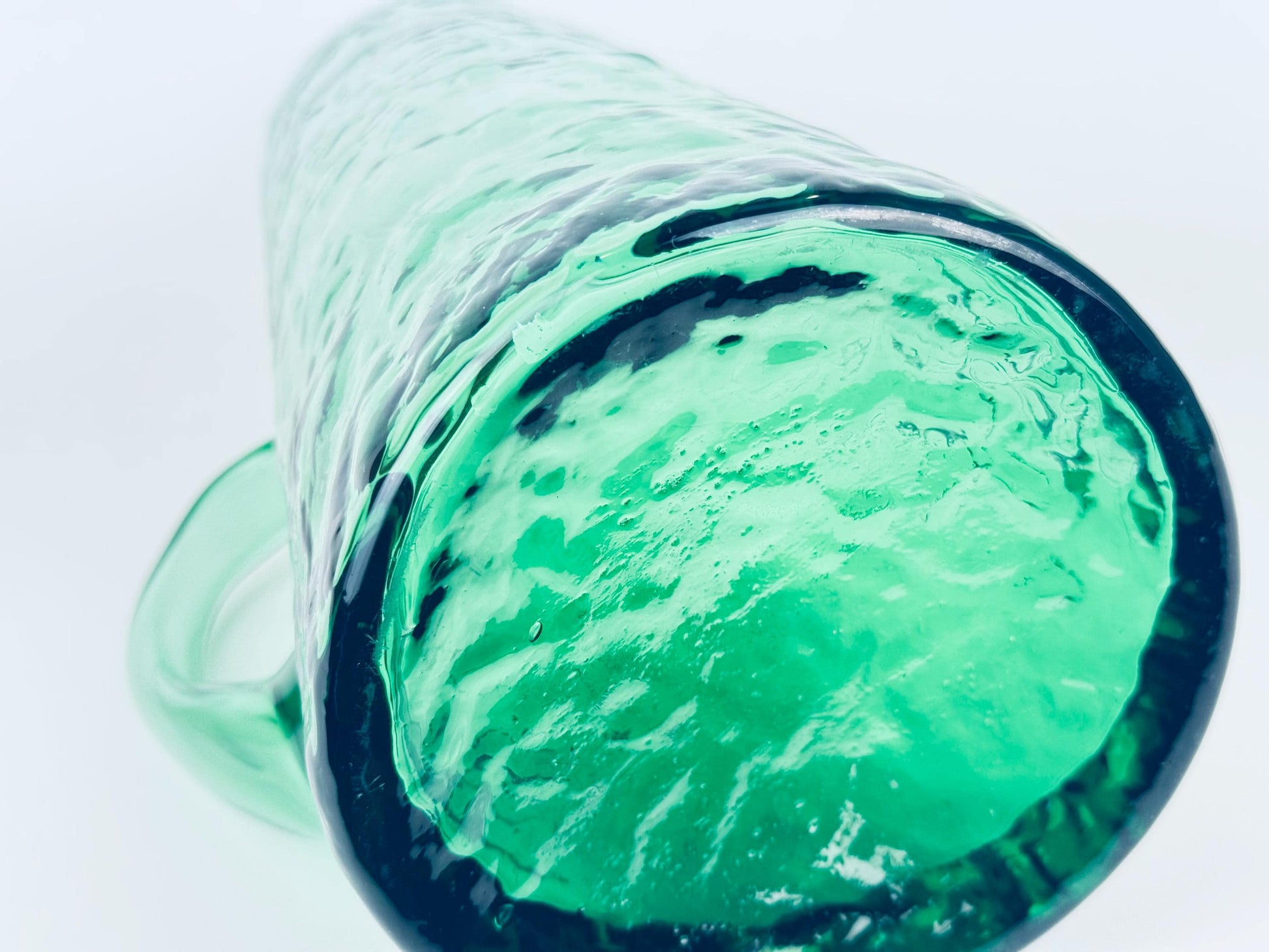 🌲 A striking forest-green 1970s textured glass pitcher crafted with a tall cylindrical silhouette, an applied pulled handle, and a subtle ice-crackle surface that catches the light beautifully. Its generous capacity and refined mid-century styling make it perfect for serving water, iced tea, or cocktails on a curated table.