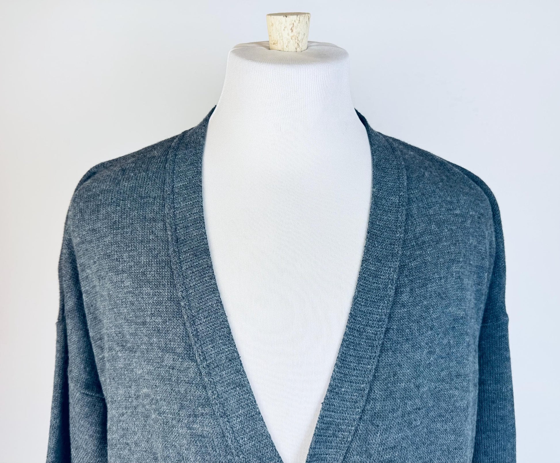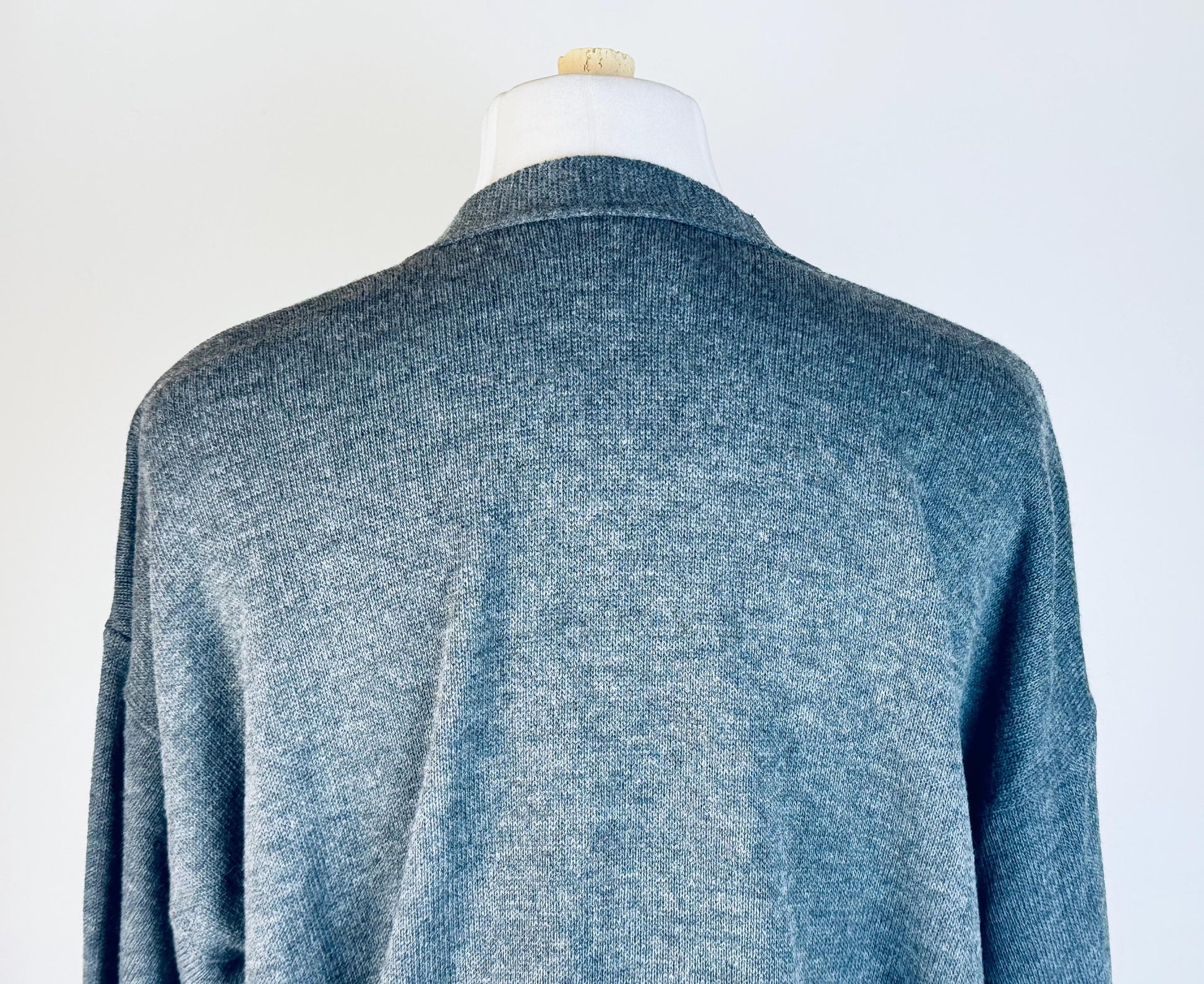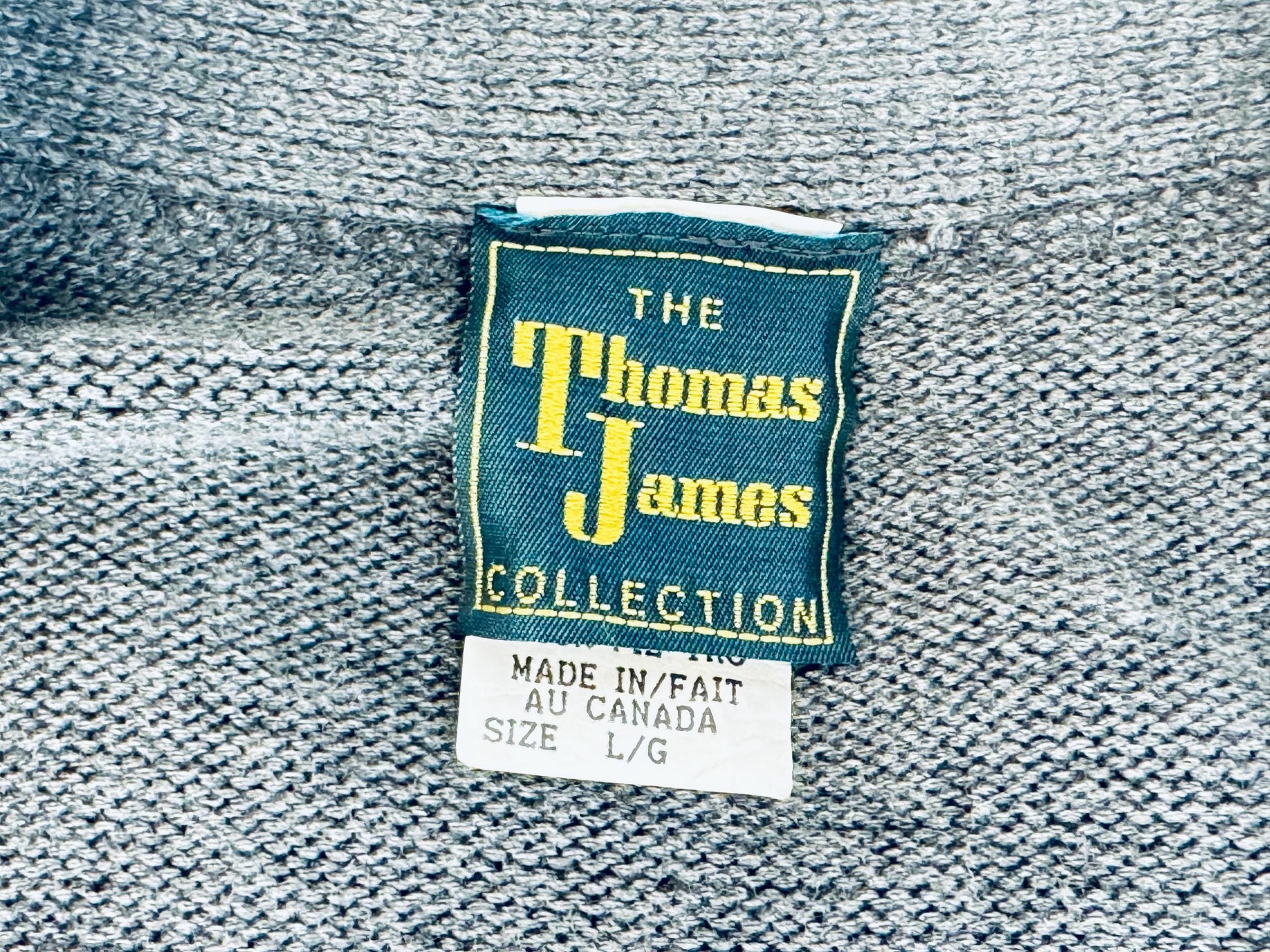 đ A serene grey Thomas James cardigan from the 1970s, cut in a lightweight acrylic knit with a deep V-neck and marble-tone buttonsâan effortless layering piece that elegantly bridges retro comfort and modern minimalism. Perfect for draping over a shirt or tee, ideal for commute, weekend brunch, or cozy evenings by the fire. Subtle drip-hem detail and generous pockets add texture and function to this vintage wardrobe staple.