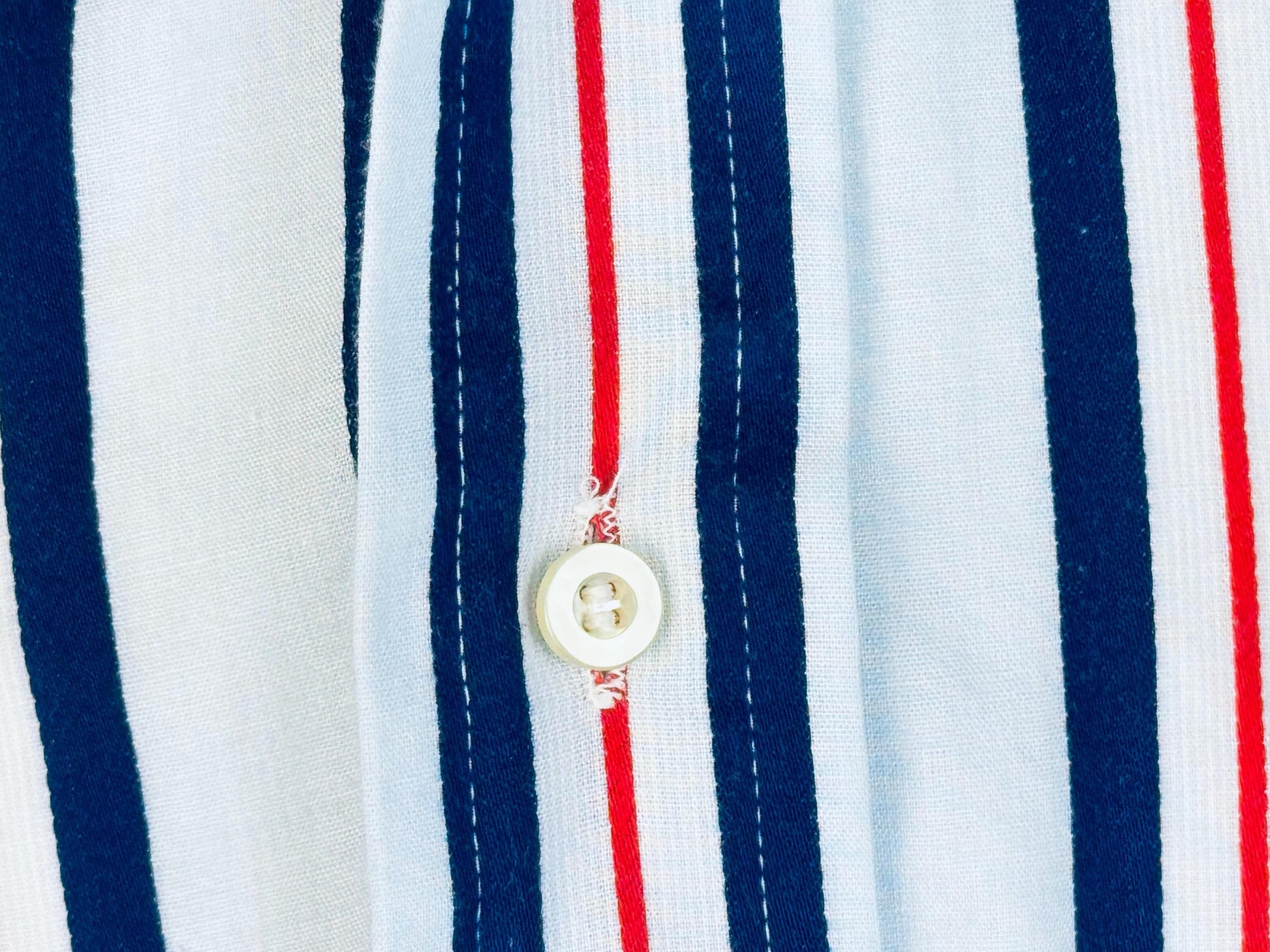 đșđžA striking red, white, and navy striped shirt that channels timeless mid-century flair. This Towncraft tapered-fit button-down, marked Size L (16â16œ), is made from a practical 65% polyester and 35% cotton blend, designed as a âno ironâ style for effortless wear. Its bold vertical stripes and lightweight feel make it ideal for casual layering, vintage styling, or Americana-inspired looks.