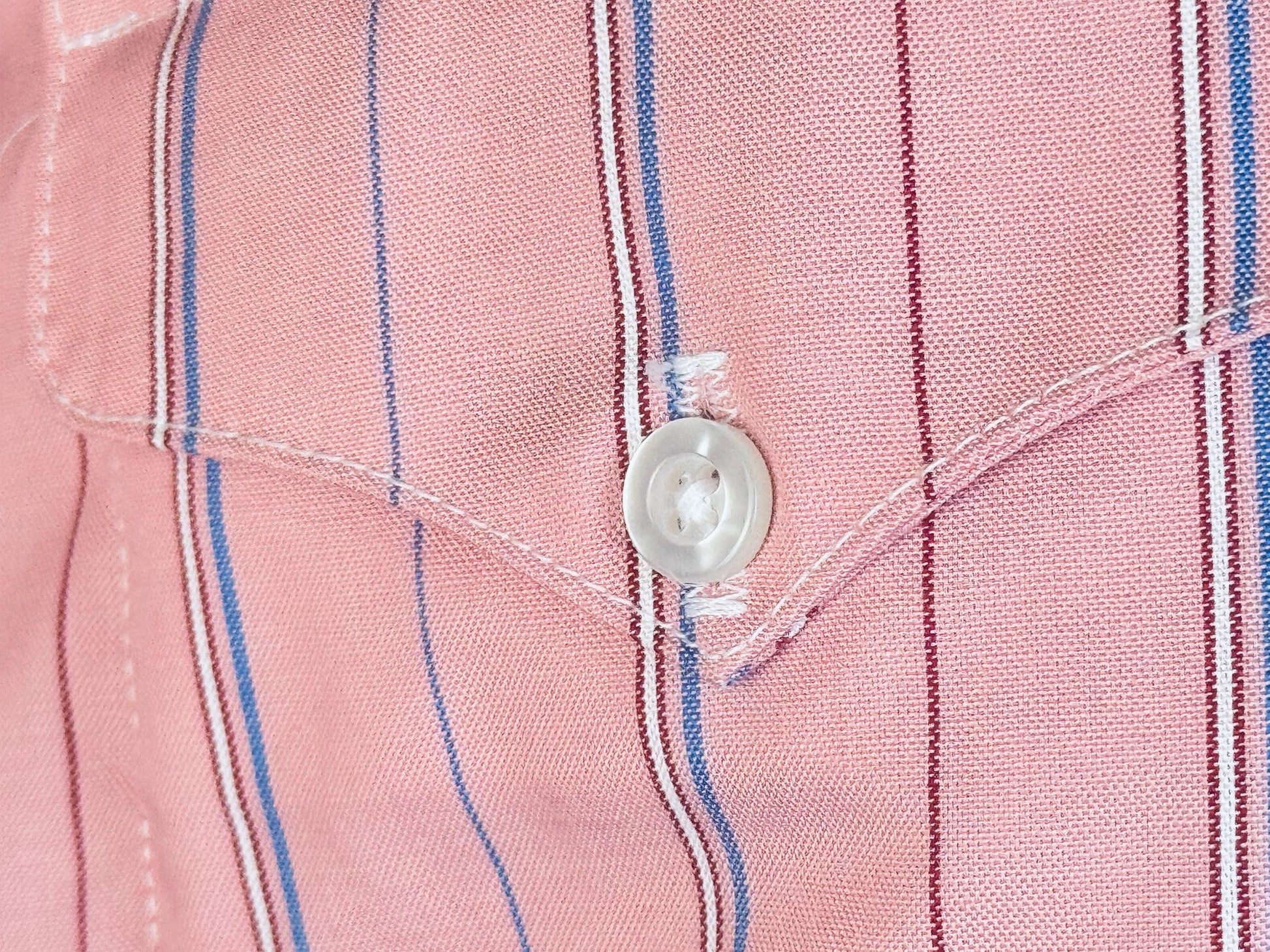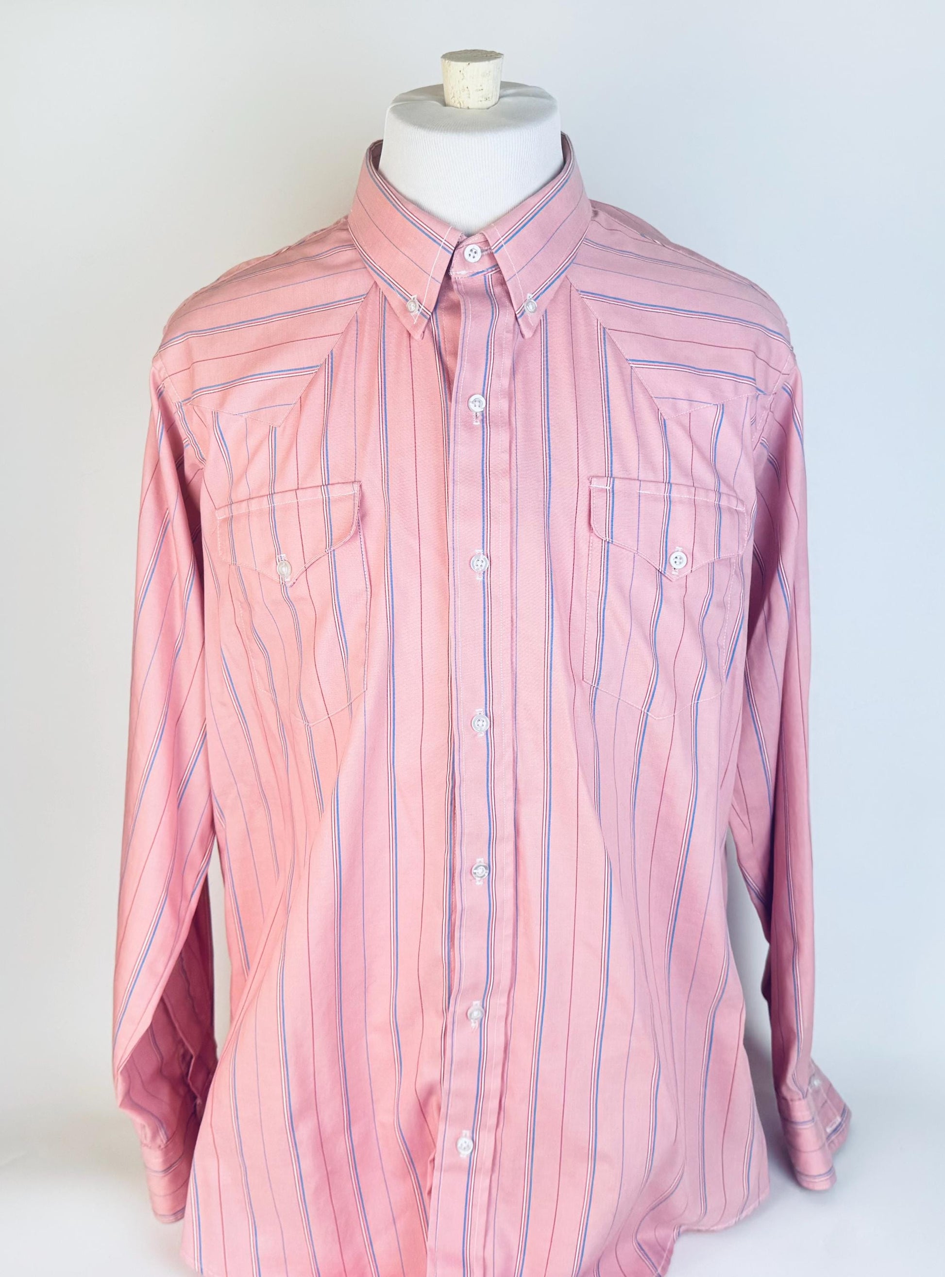 đ„Ÿ Subtle elegance with a western twist: this vintage 1980s Ruddock Bros pink stripe shirt features bold angled yokes, twin chest pockets, and a soft cotton-poly blend thatâs perfect for nights out or relaxed day wear. Cut in Size Large and finished in warm pastel stripes with contrast piping, it pairs beautifully with denim or chinos for style that feels both retro and refined. Offered in very good condition with intact buttons and crisp tags, this shirt lives in that sweet spot of vintage casual meets western heritage. đ„Ÿ