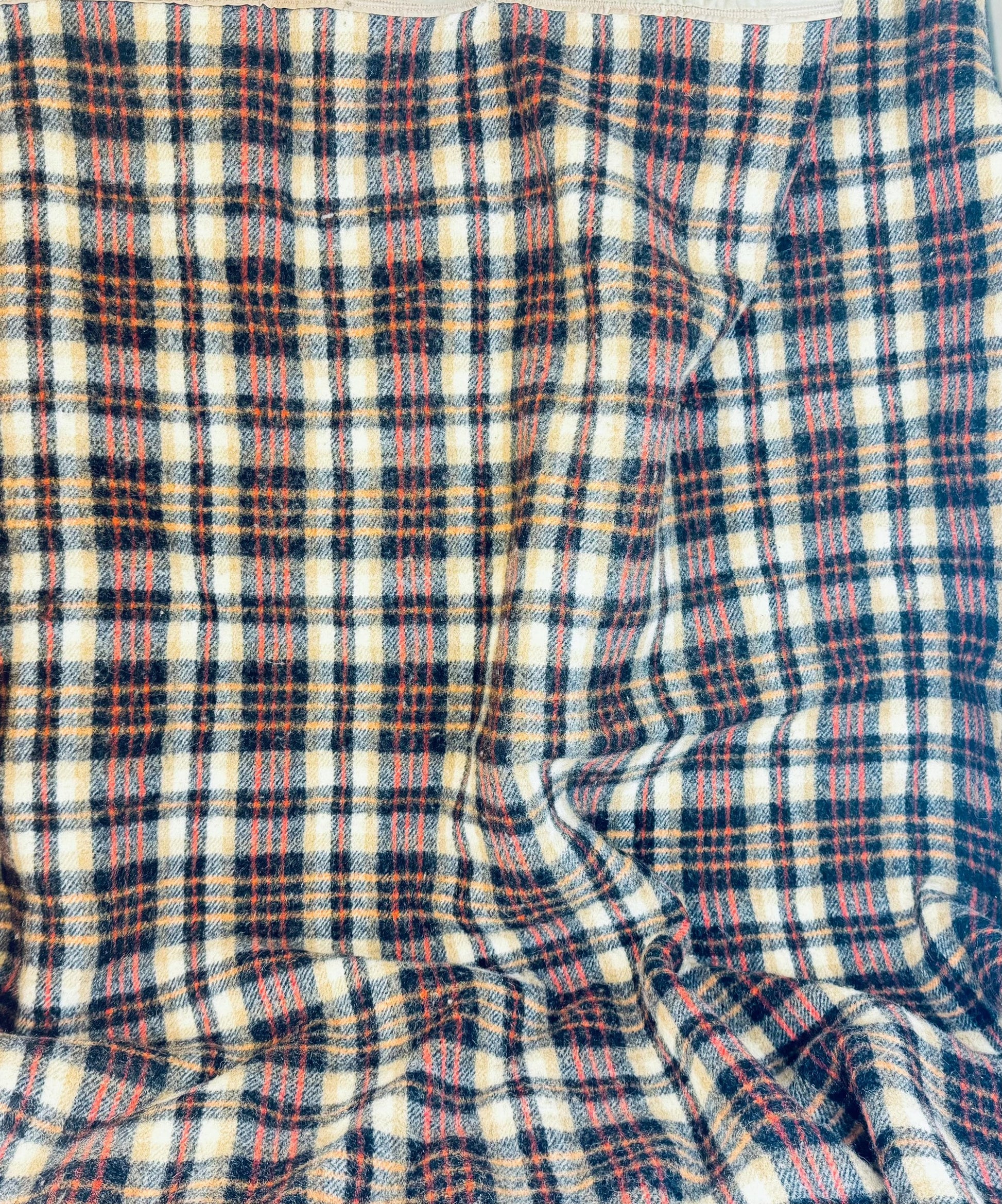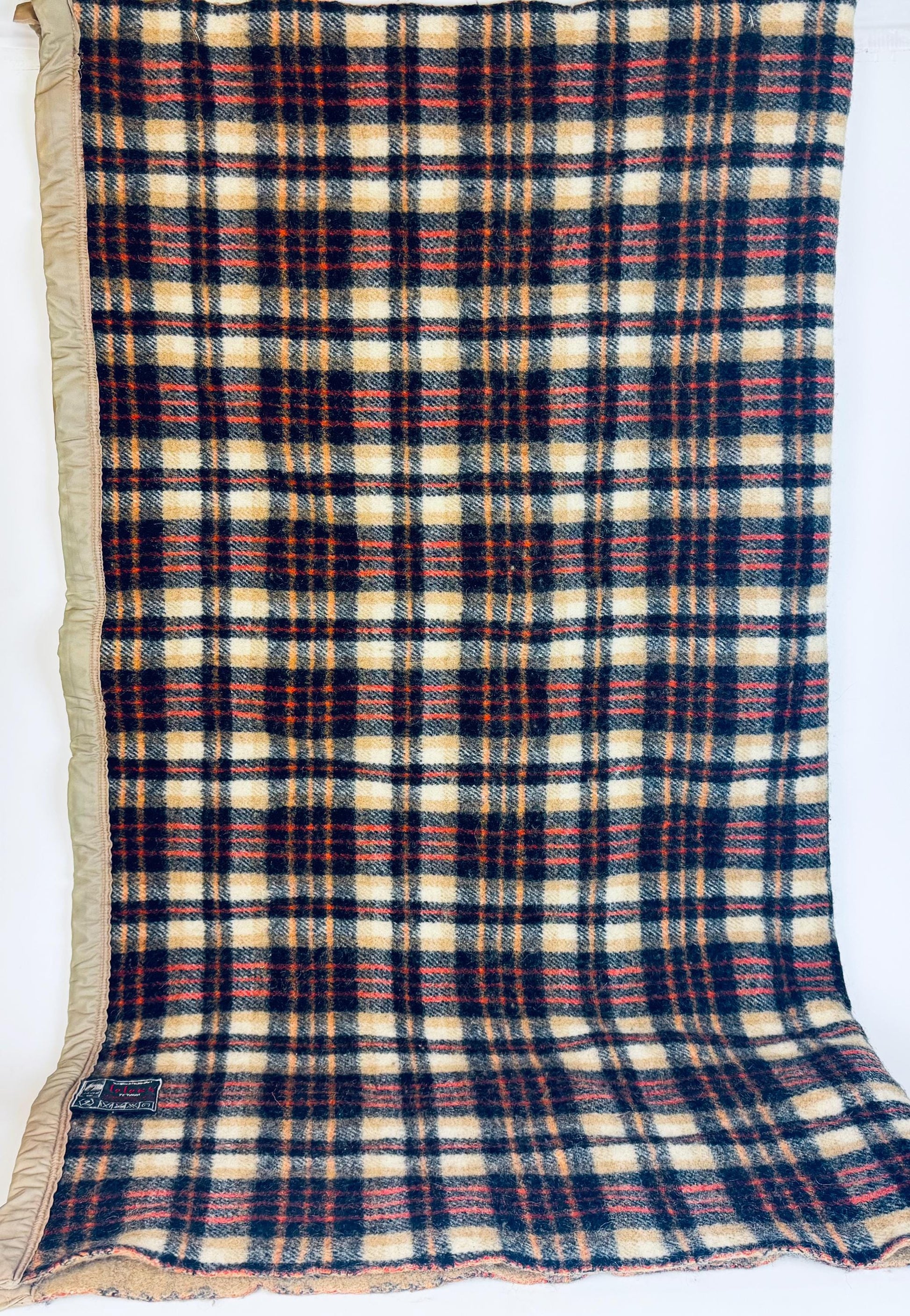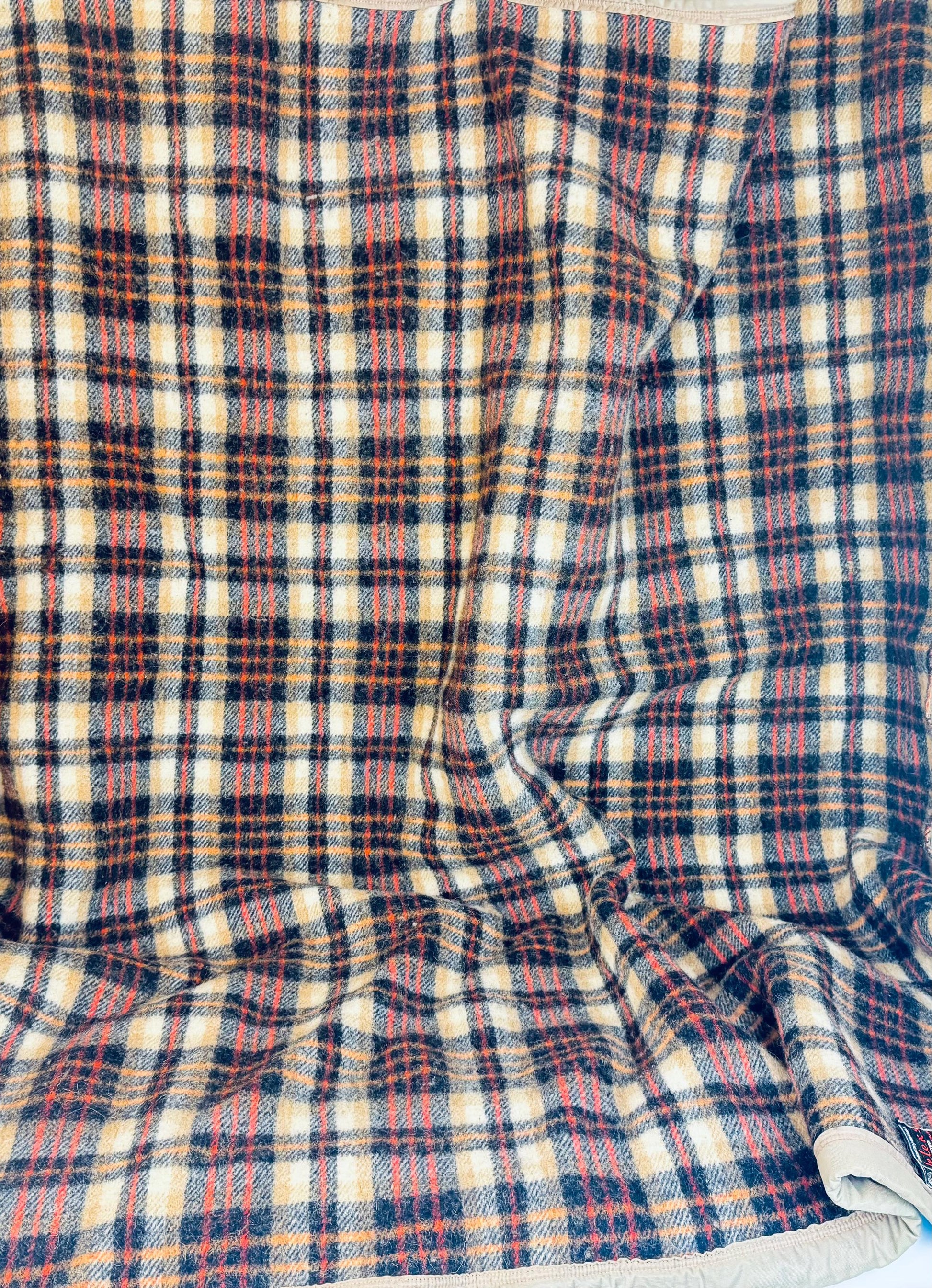 🐑 🛋️ A striking plaid wool-blend throw from the 1980s, beautifully crafted in rich tan and black with subtle rust highlights—perfect for elevating a mid-century lounge or layering over your reading chair. This circa 1980s wool-rich lining-trimmed blanket offers both retro style and comforting utility for your living space.