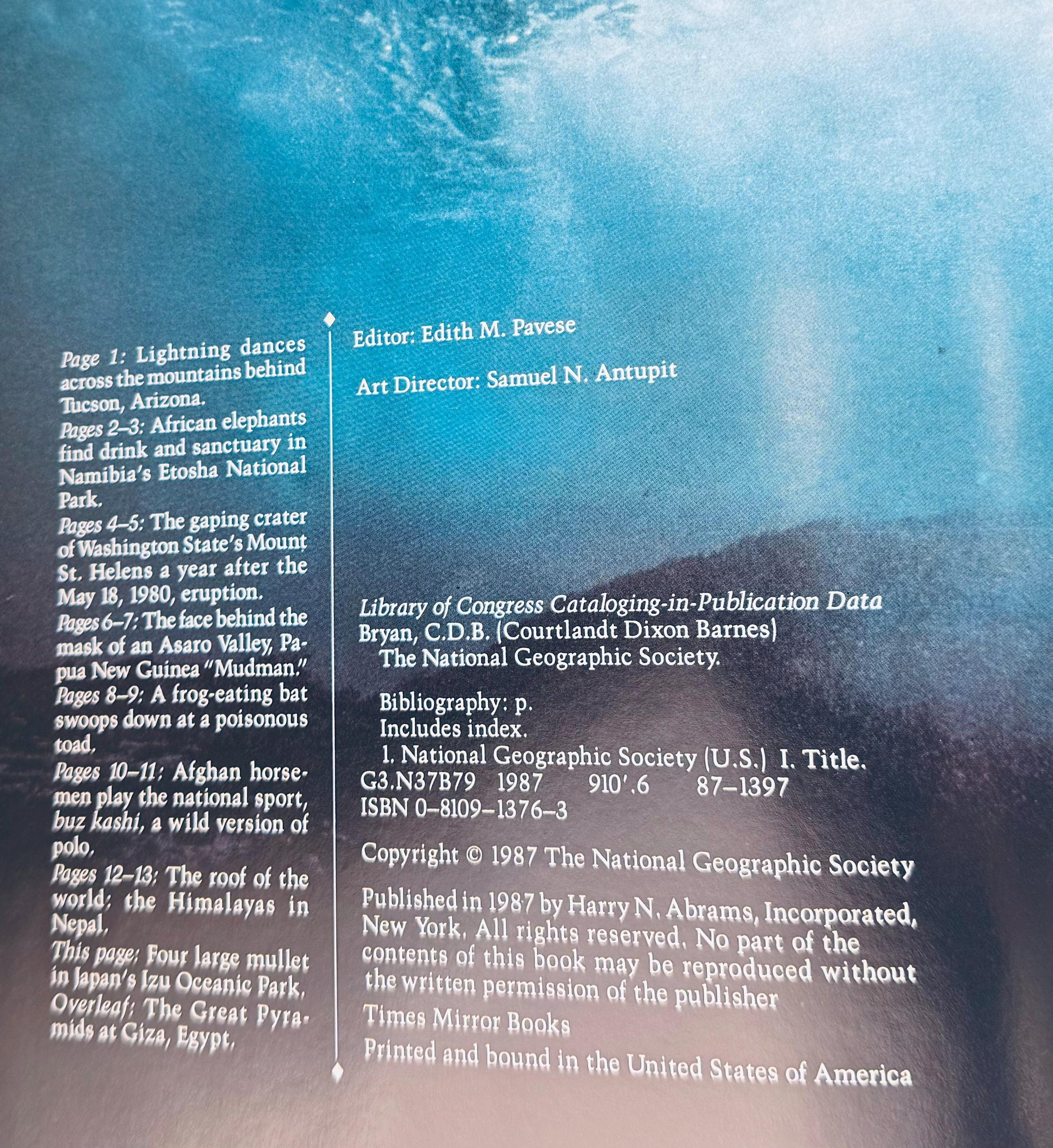 Published in 1987 by Harry N. Abrams for National Geographic Society, this richly illustrated volume commemorates the Society’s first 100 years of documenting global adventure, discovery, and scientific curiosity.
