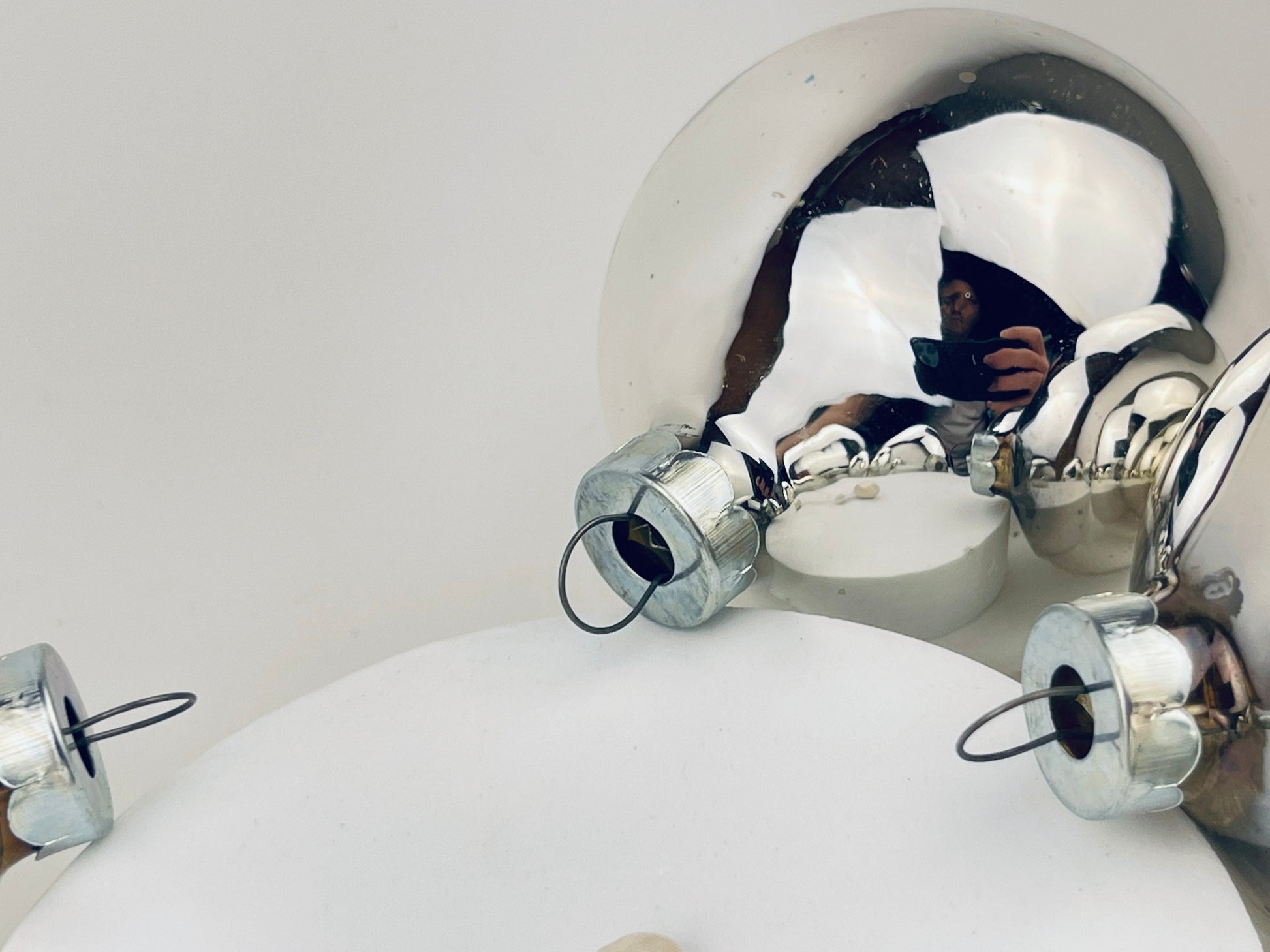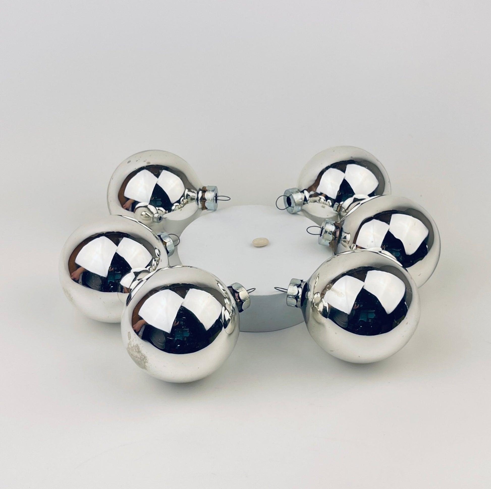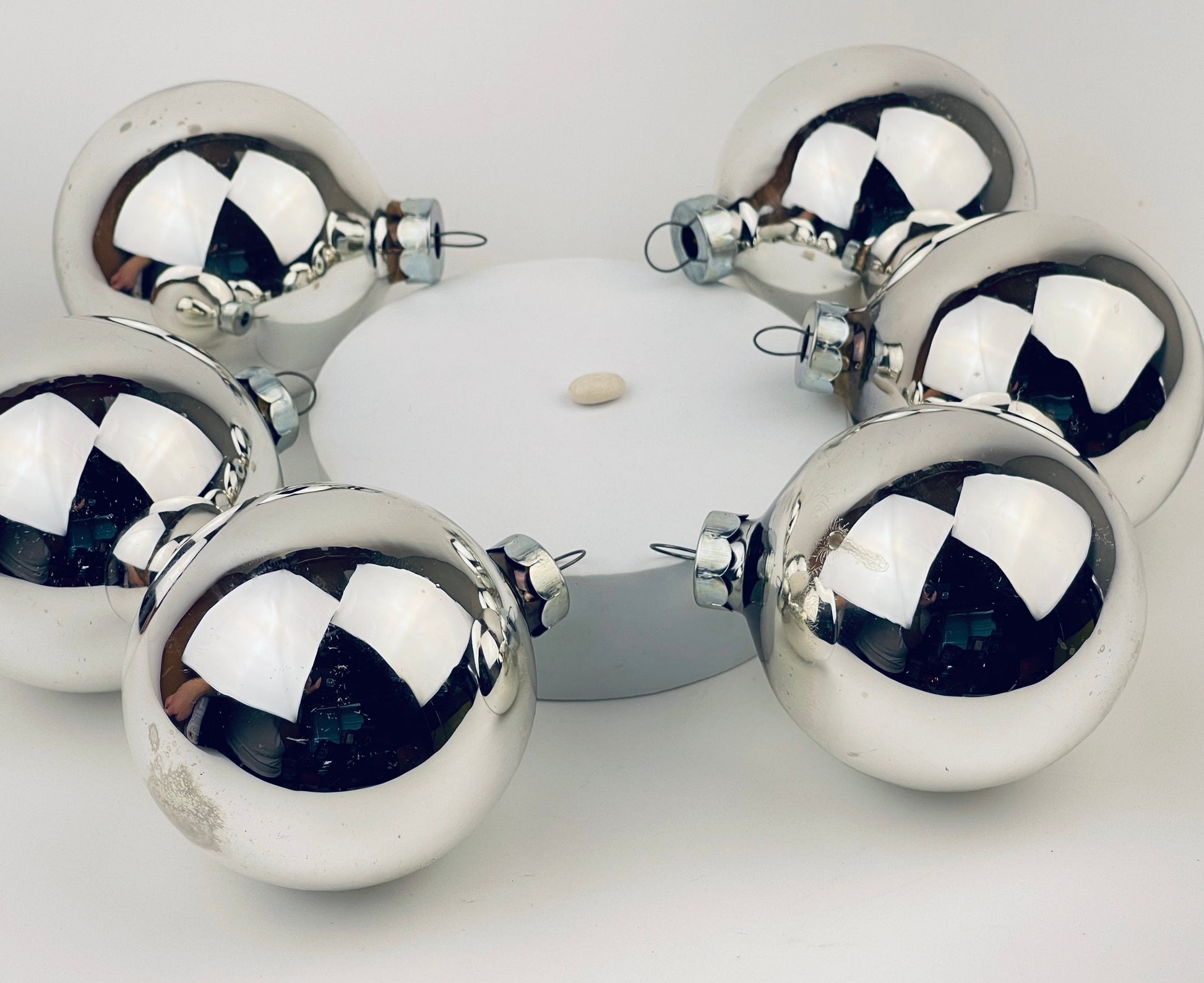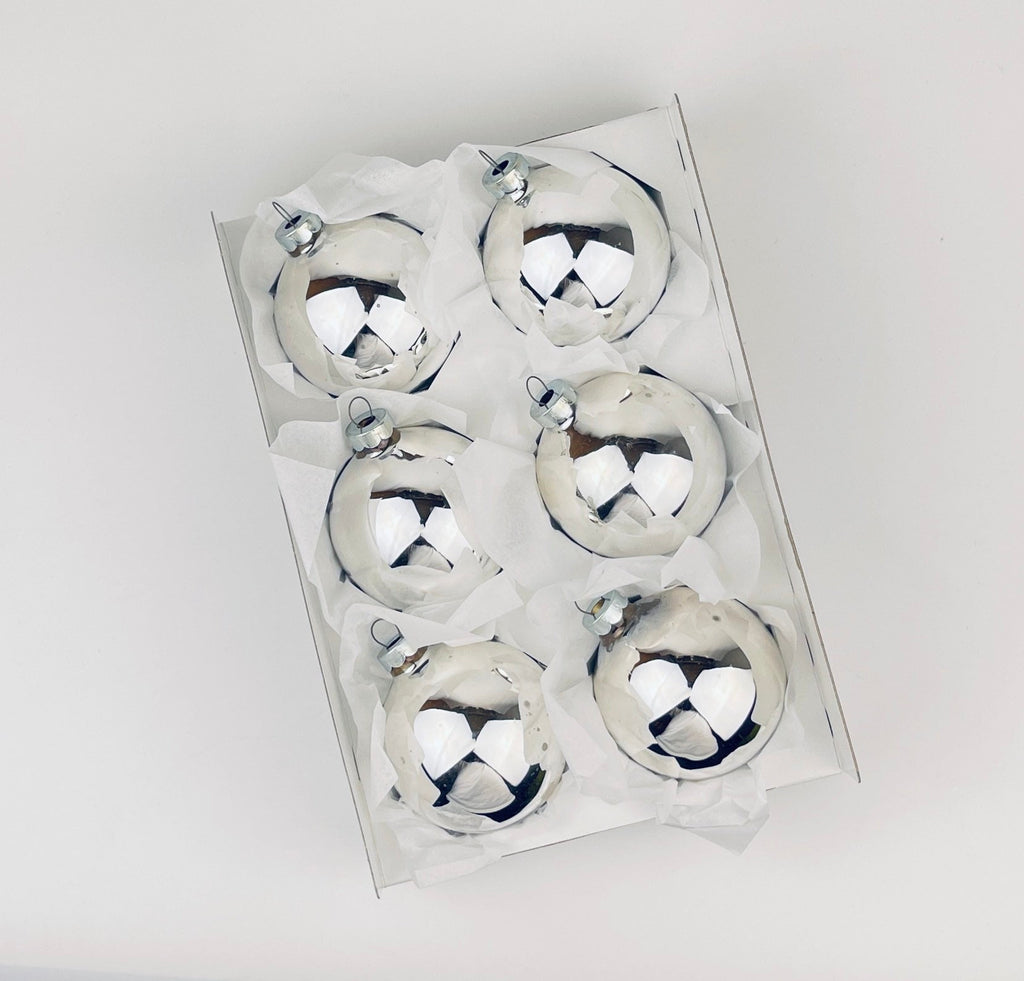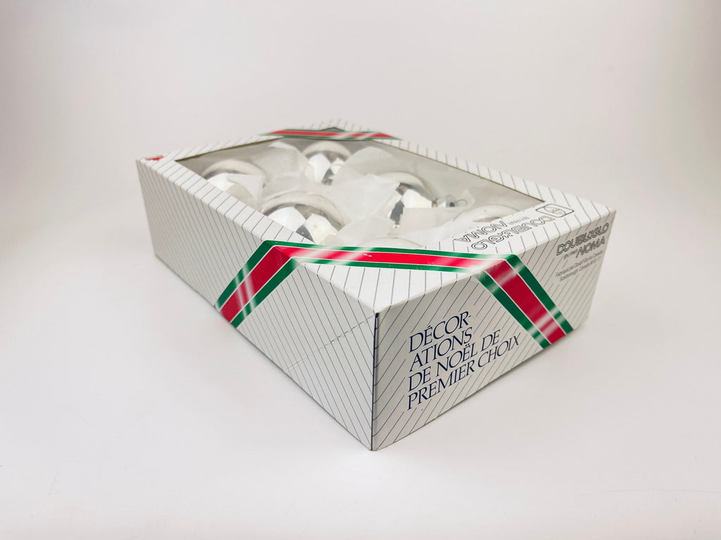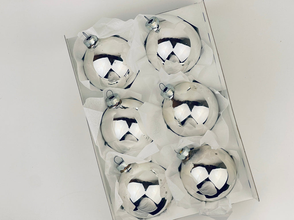 đâš This boxed set of six silver glass Christmas ornaments by Doubl*Glo for NOMA features a high-shine mirror finish that captures the glow of twinkling lights and tree branches alike. Made in Canada in the 1990s, these minimalist glass baubles are perfect for a modern winter palette or retro tree styling. A striking addition to any curated ornament collection.
