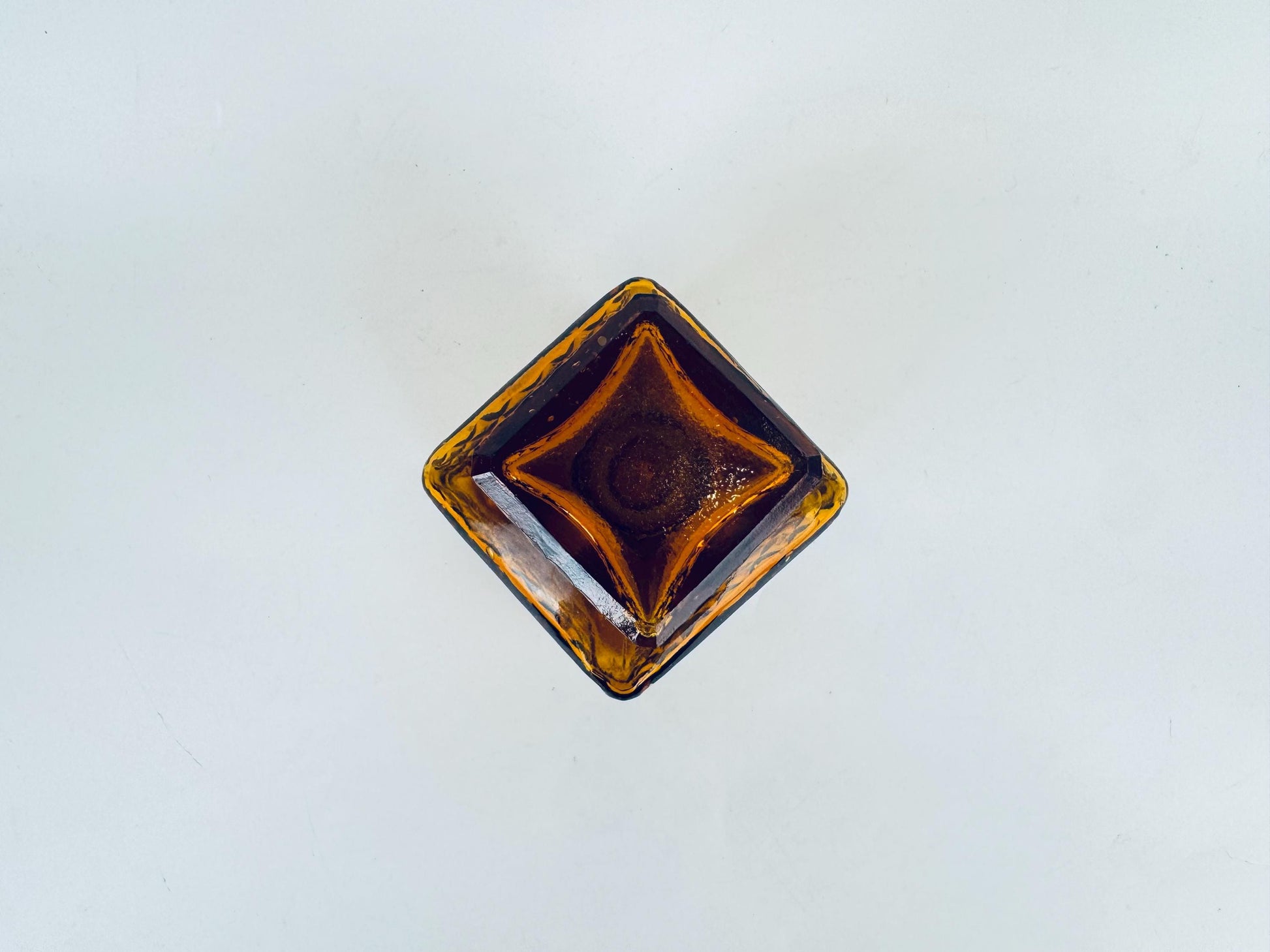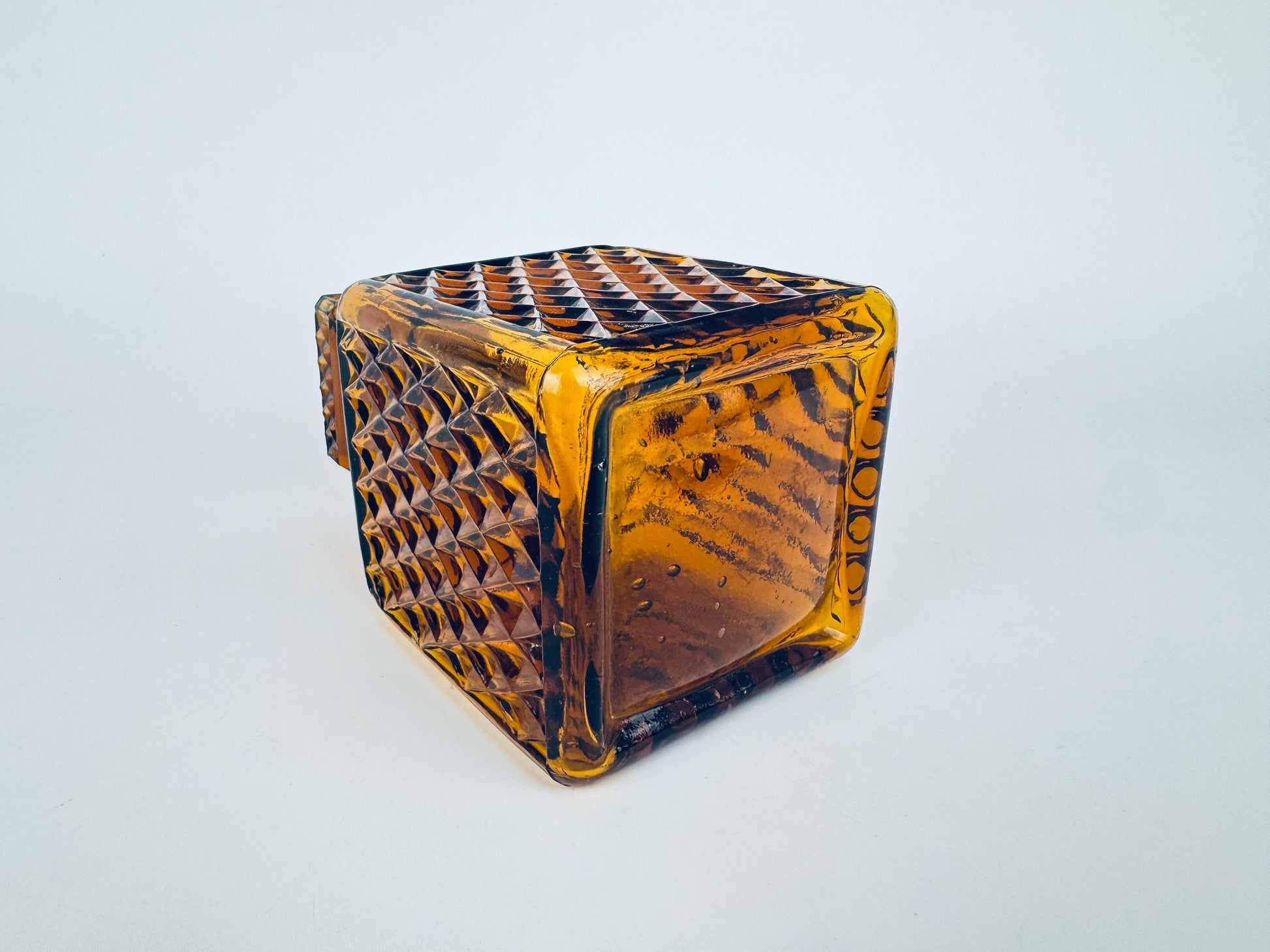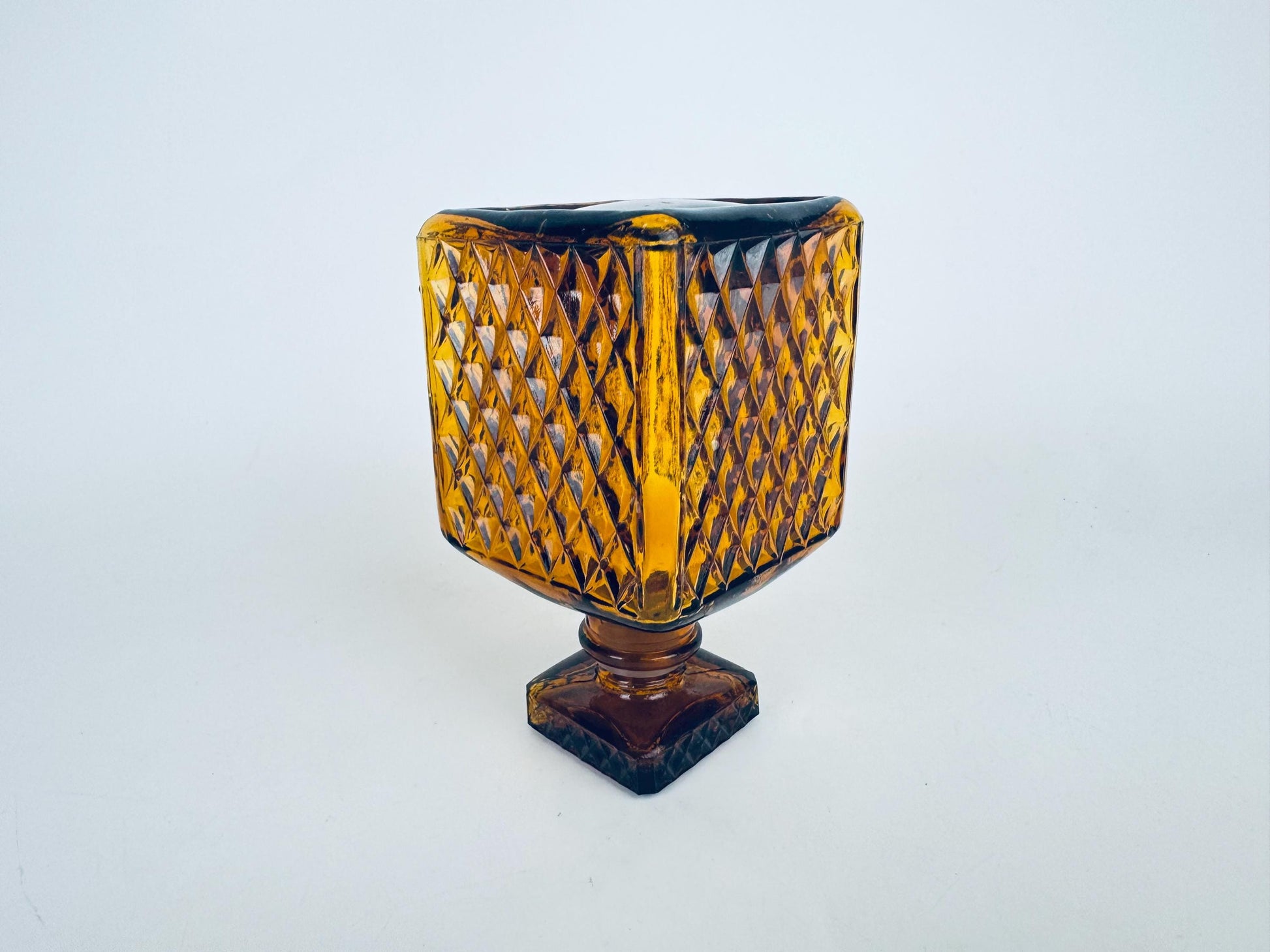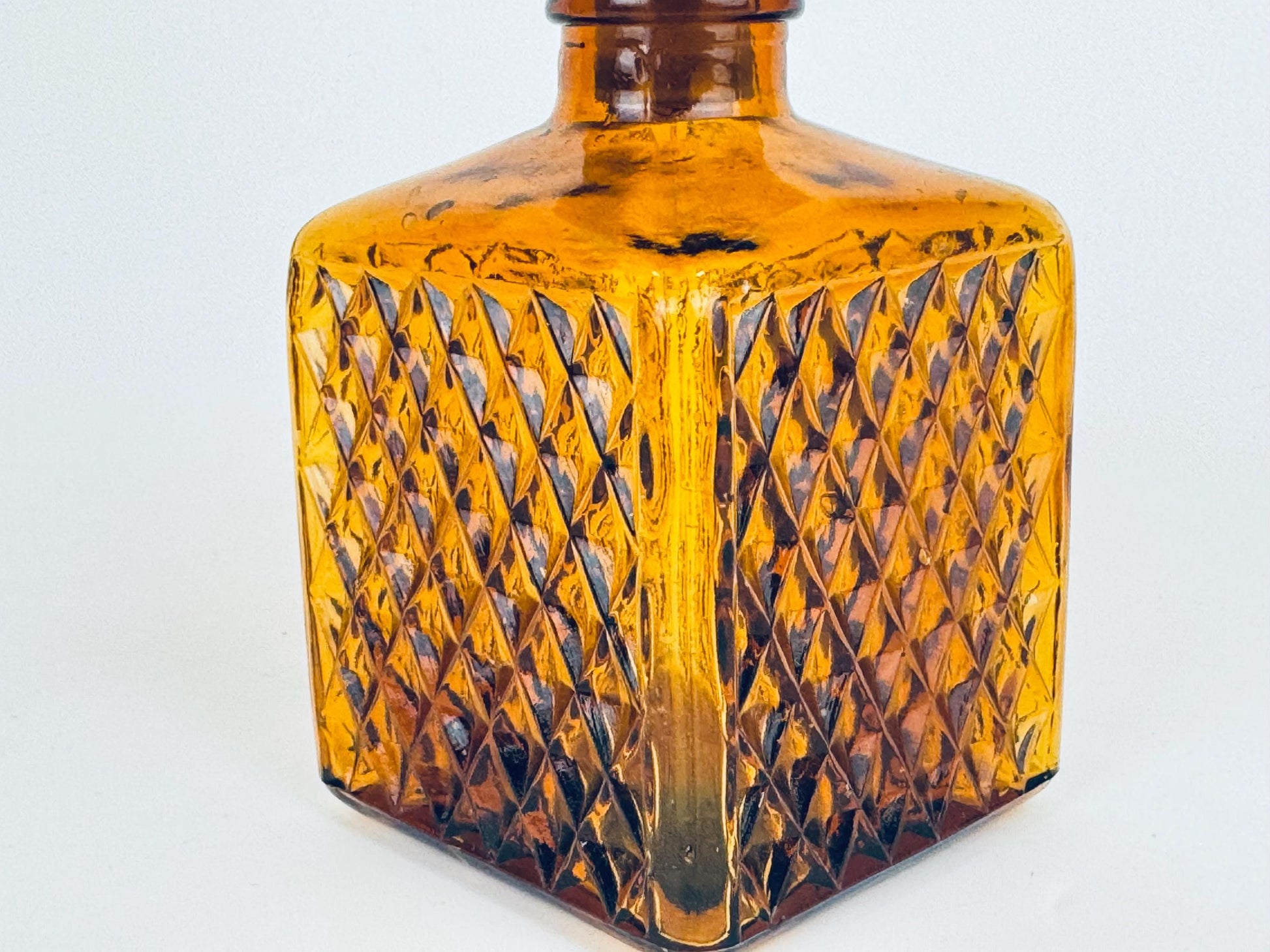 🥃 A richly textured amber glass decanter from the 1950s–1960s, this diamond-pressed piece pairs warm mid-century colour with sculptural geometry that feels timeless on a bar cart or styled shelf. Its substantial ground-glass stopper and square form make it ideal for whiskey, liqueurs, or as a striking decorative accent in a curated home.