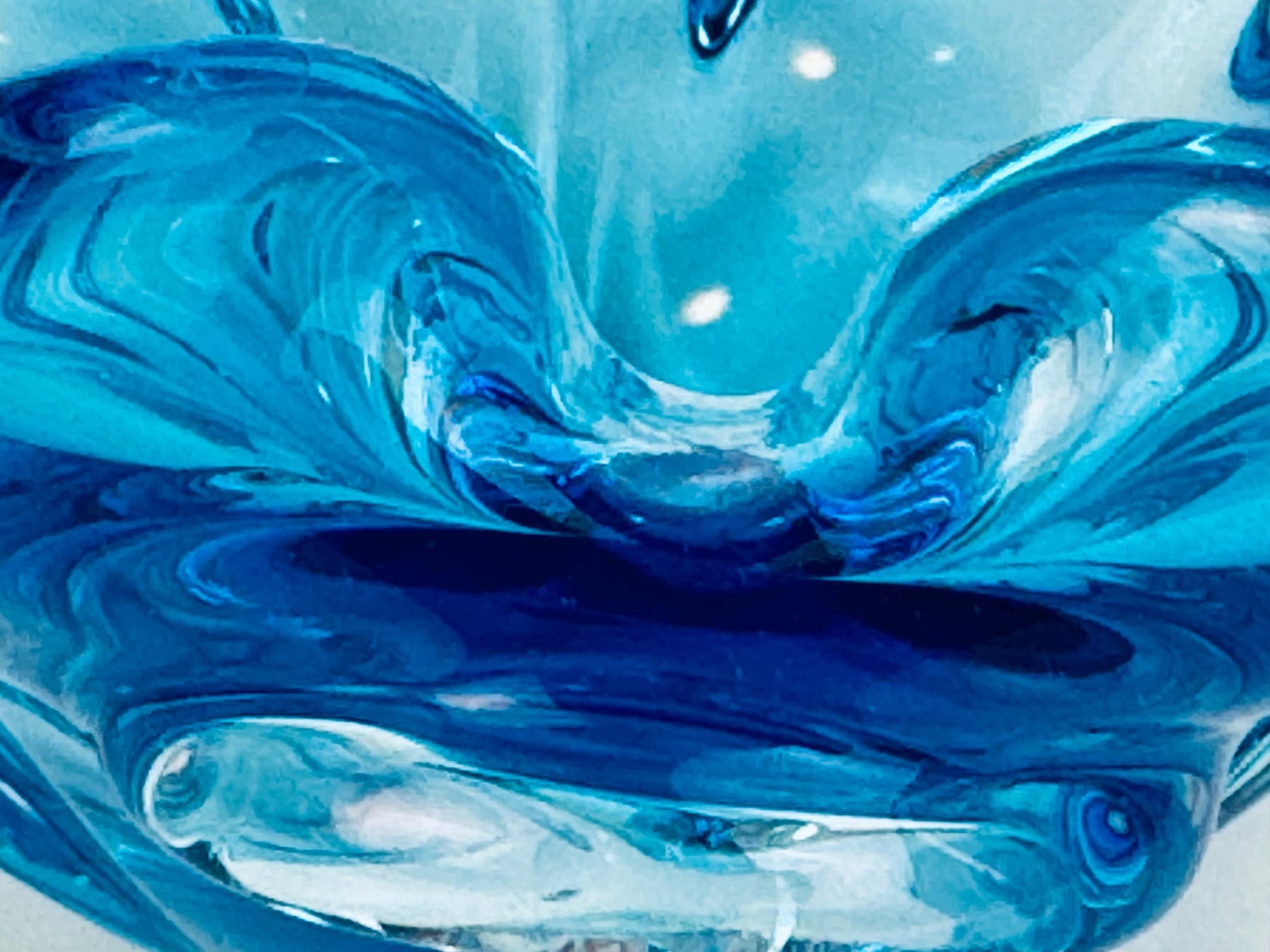 💎 A striking wave of Canadian art glass history — this 1960s aqua blue freeform bowl captures the sculptural elegance that defined Chalet’s hand-blown creations. Its sweeping ruffled edges and thick crystal base catch the light beautifully, making it a refined statement piece for coffee tables, vanities, or display shelves. Each curve reflects the artistry of mid-century glassmakers who turned molten glass into fluid motion.