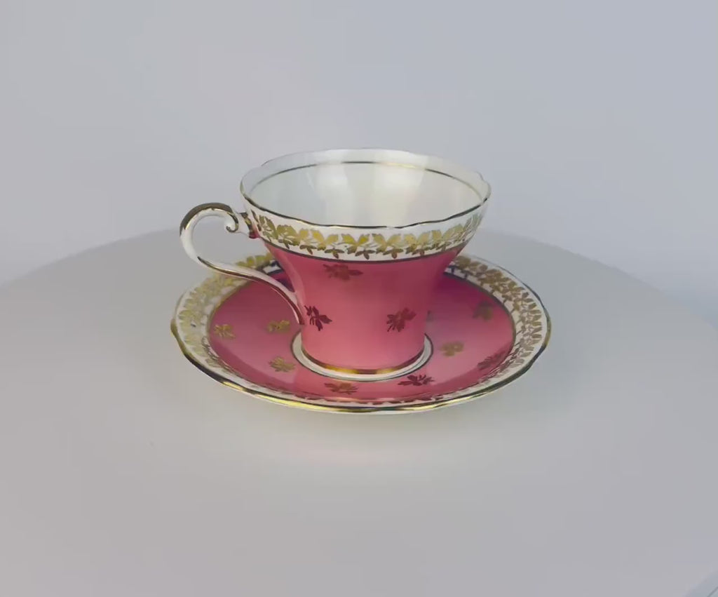 đž A richly hued Aynsley bone china teacup and saucer in a deep pink glaze, adorned with gilt leaf motifs and finished in 22k gold trim. Crafted in the 1950s, its footed base and scalloped edges bring refined elegance to afternoon tea or display. A striking addition for collectors or anyone curating a sophisticated china cabinet.
