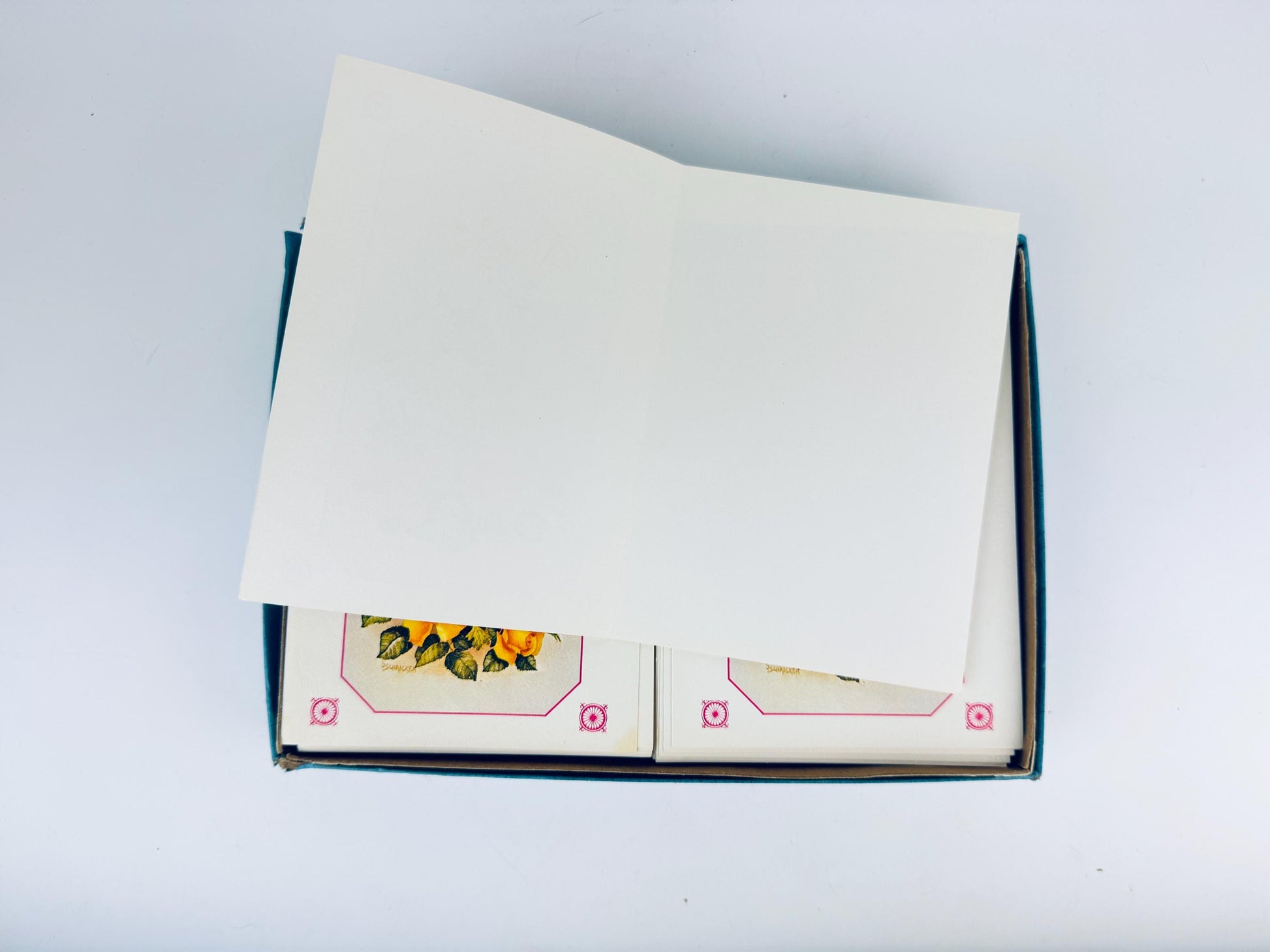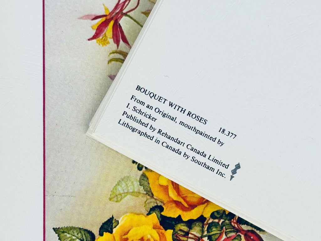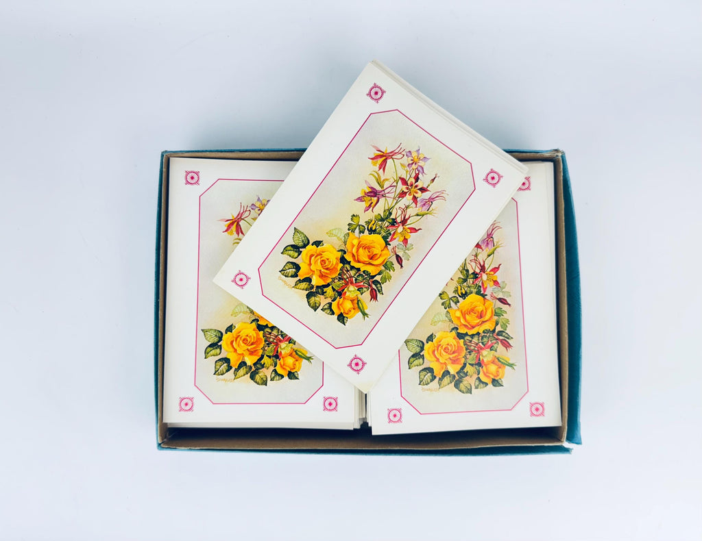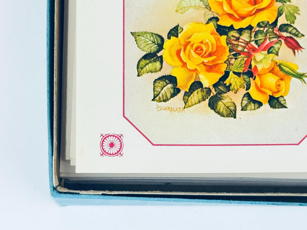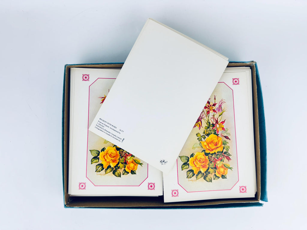 đâïž A striking mid-century boxed set of 55 vibrant floral note cards, each featuring a richly detailed bouquet of yellow roses and fuchsia blooms by mouthpainting artist I. Schricker. Lithographed in Canada by Southam Inc. for Rehandart Canada Limited, this 1960sâ70s stationery collection pairs vivid imagery with lightly textured cardstock and coordinating envelopes. Perfect for thank-you notes, short correspondence, or display in a vintage-inspired writing desk or gift drawer. Sealed in its original turquoise faux-leather box.