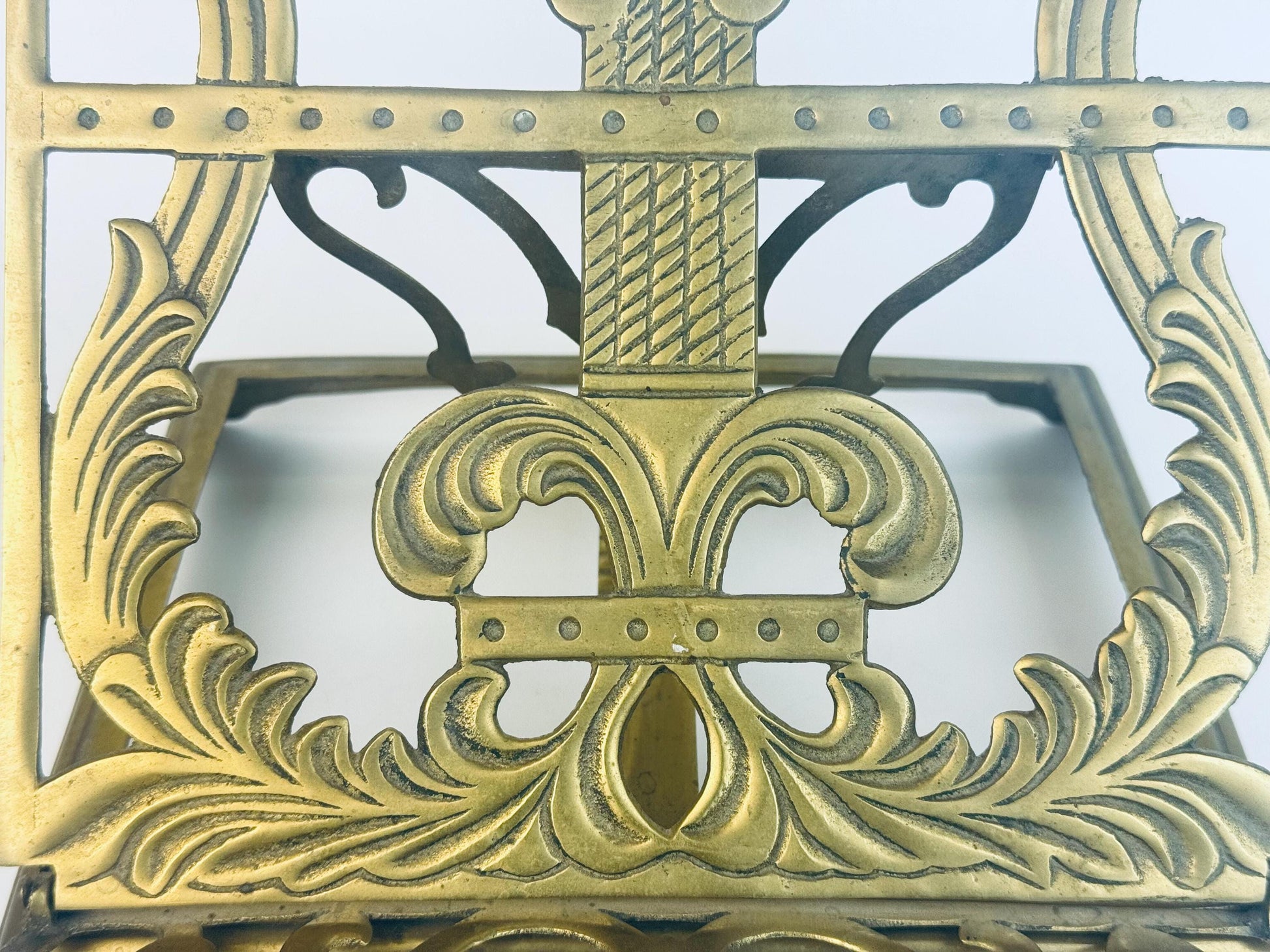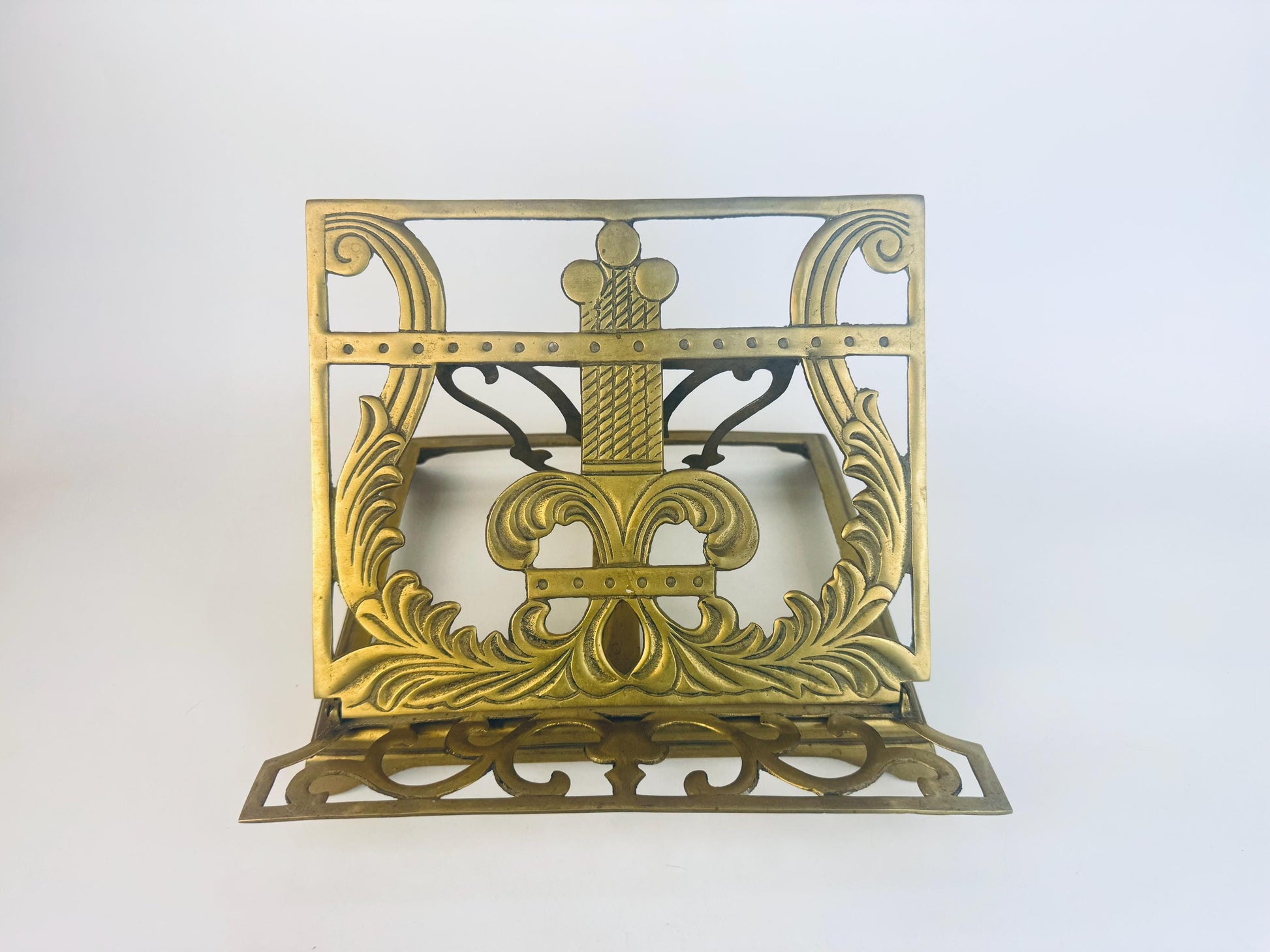 📖 A sculptural brass book stand with striking acanthus-leaf scrolls and a regal central motif, this 1960s design blends classical ornament with mid-century craftsmanship. The pierced brass framework, rivet detailing, and adjustable tilt make it ideal for displaying a cherished cookbook, art volume, or music score. Its richly aged patina and gilded tones lend warmth and old-world charm to any tabletop vignette or library setting.