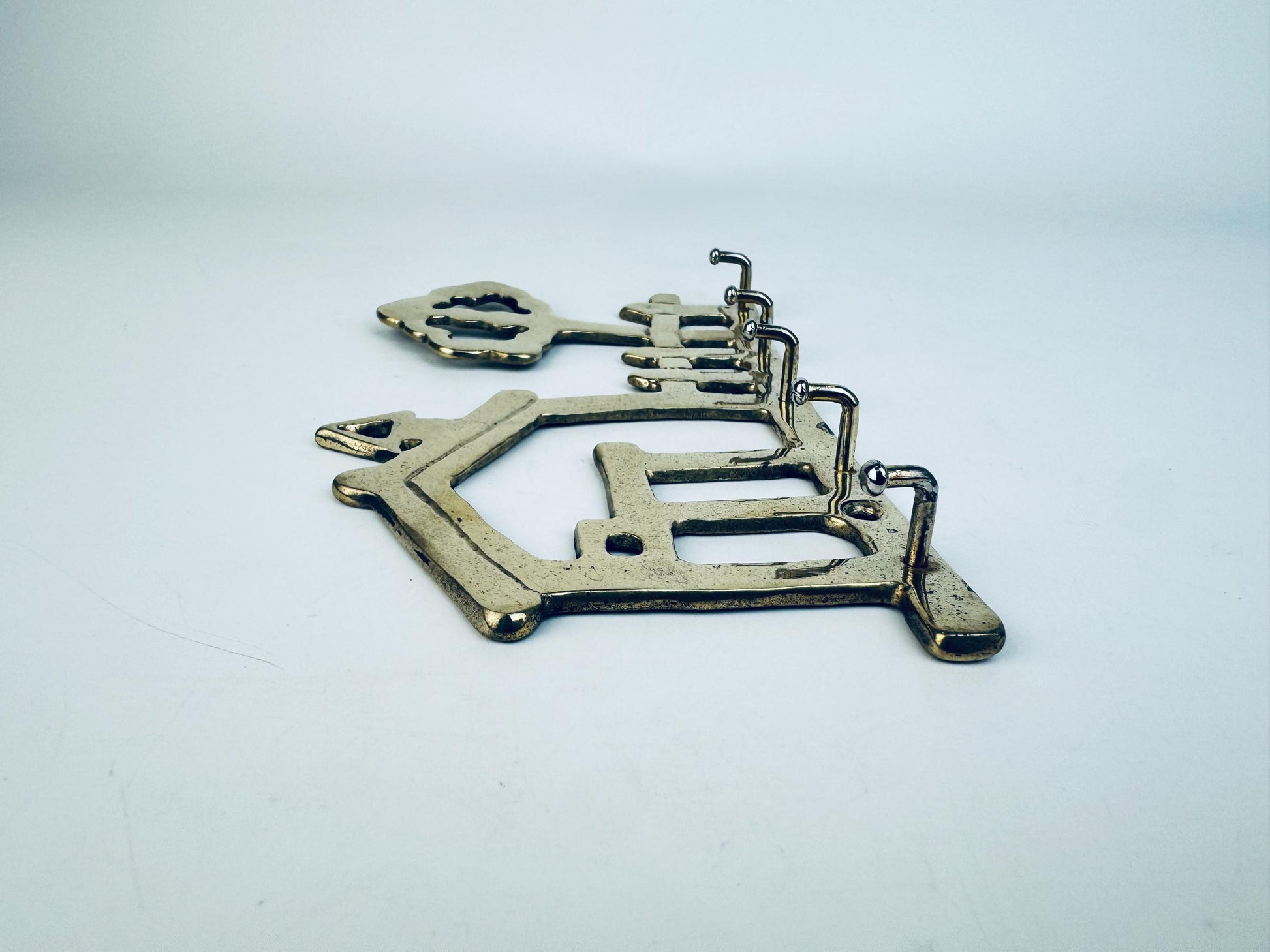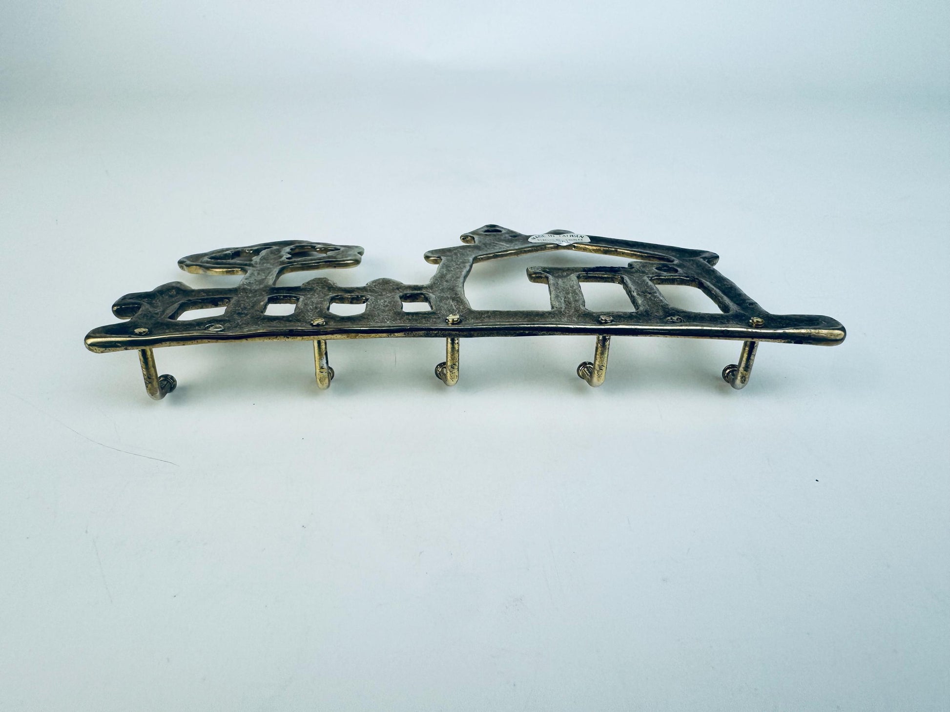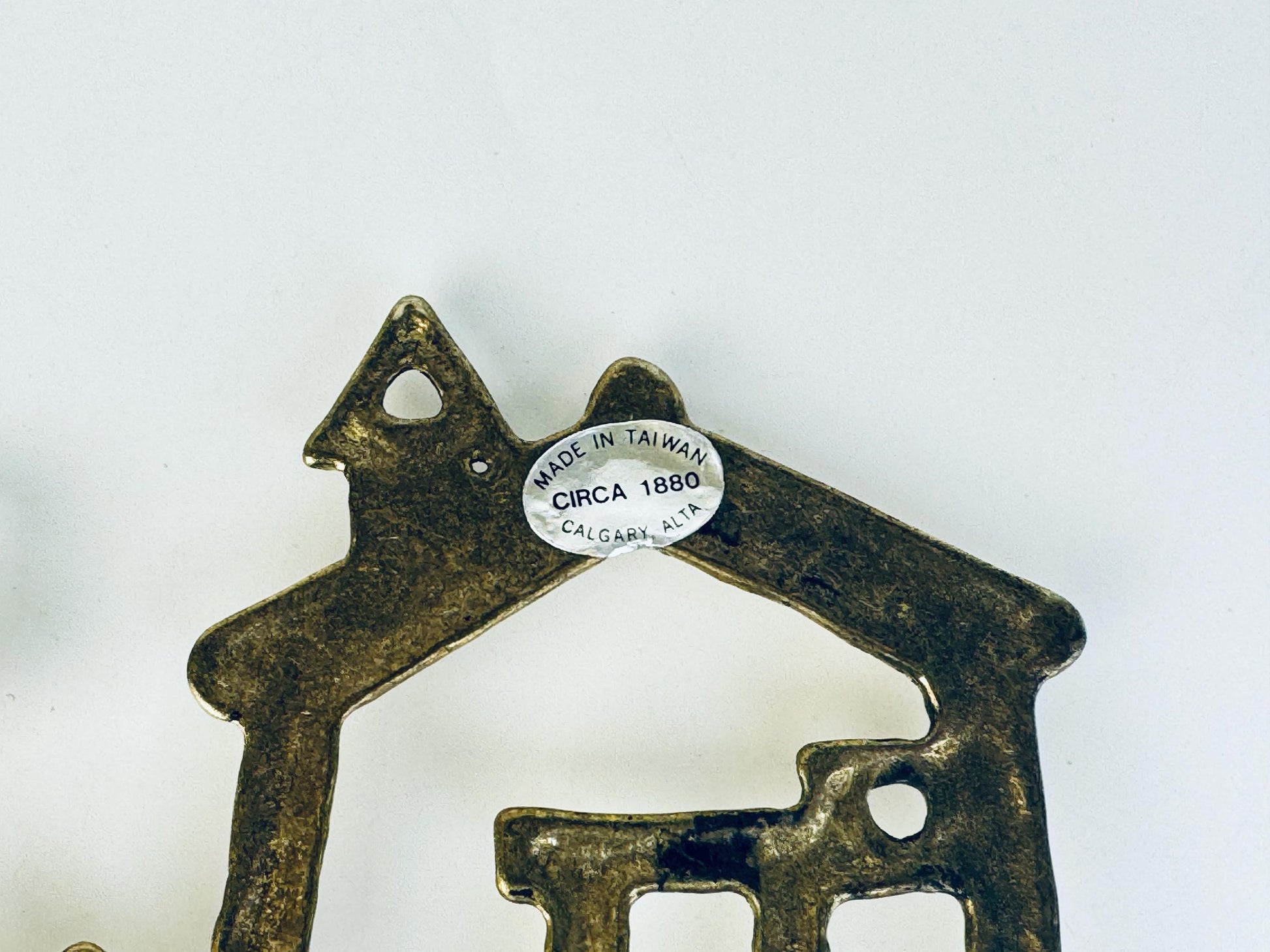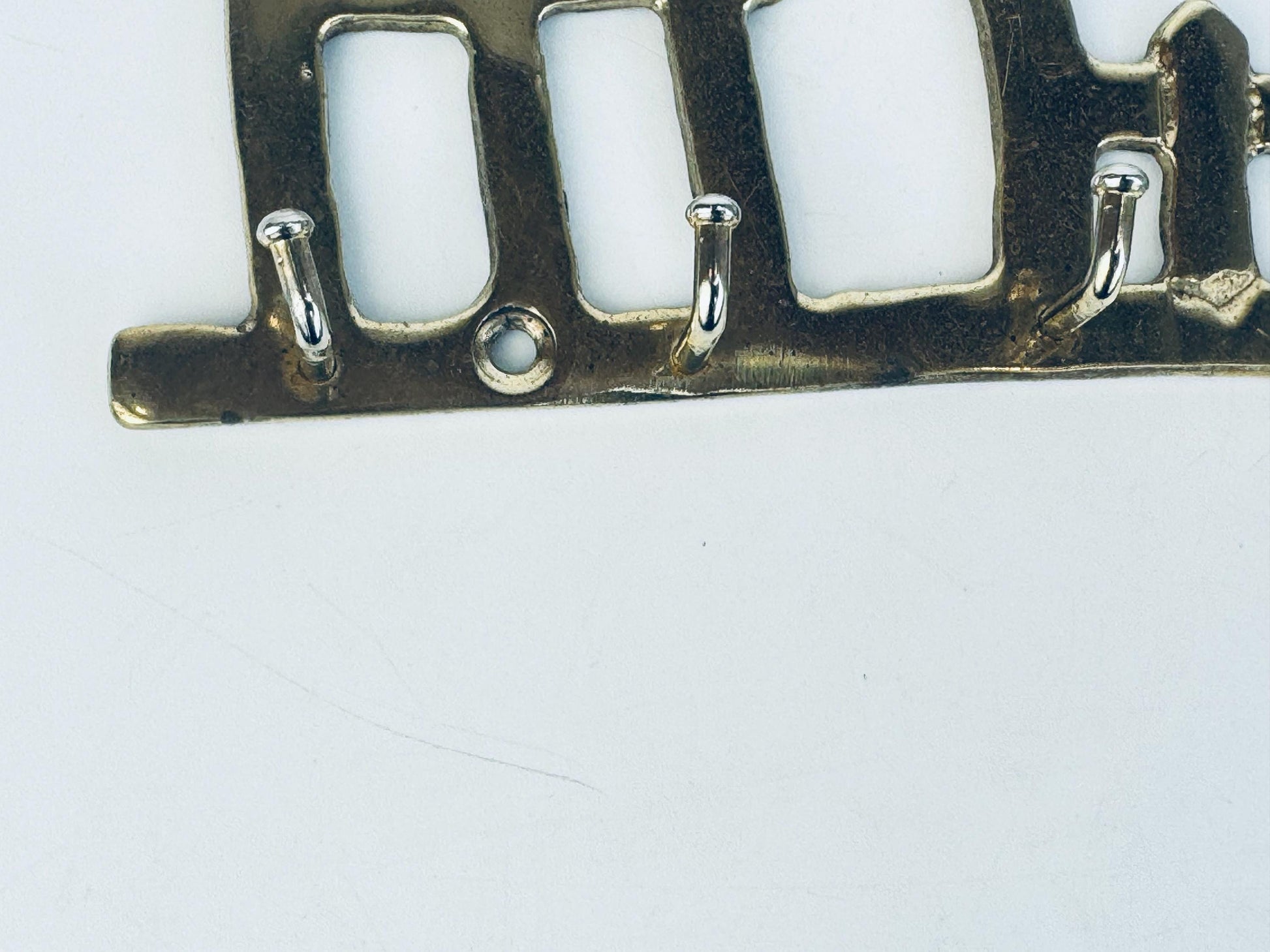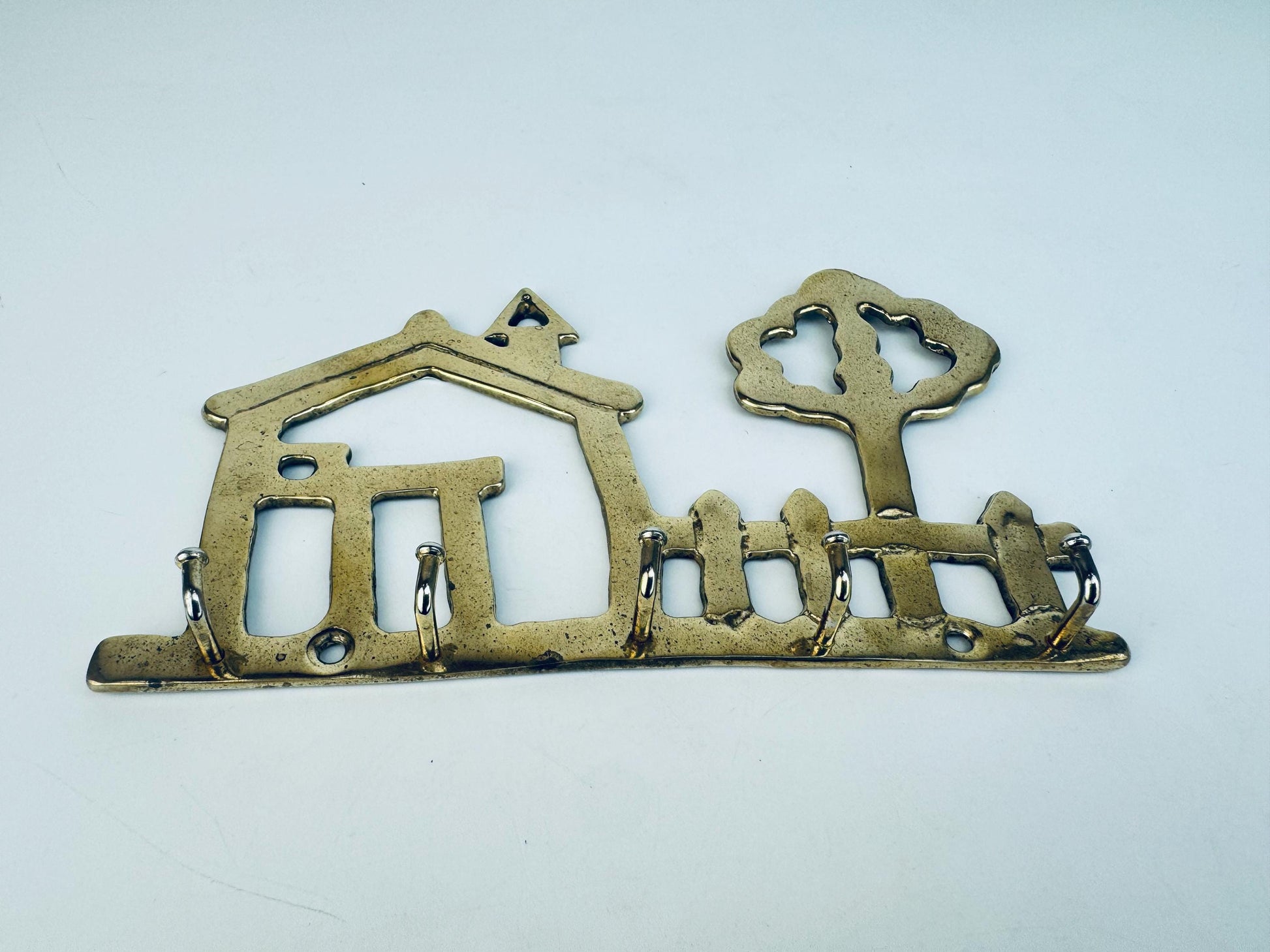 🏡 A striking circa-1970s solid brass wall rack in the shape of a charming house, picket fence and tree—this sculptural key holder pairs whimsical cottage style with pragmatic utility, making it perfect for any entryway, mudroom or kitchen wall. Crafted from warm antiqued brass, the detailed cut-out scene and five curved hooks add vintage flair while keeping your keys, dog leash or neighbour’s borrowals elegantly organized. A tasteful and functional home accessory that delivers both form and function.