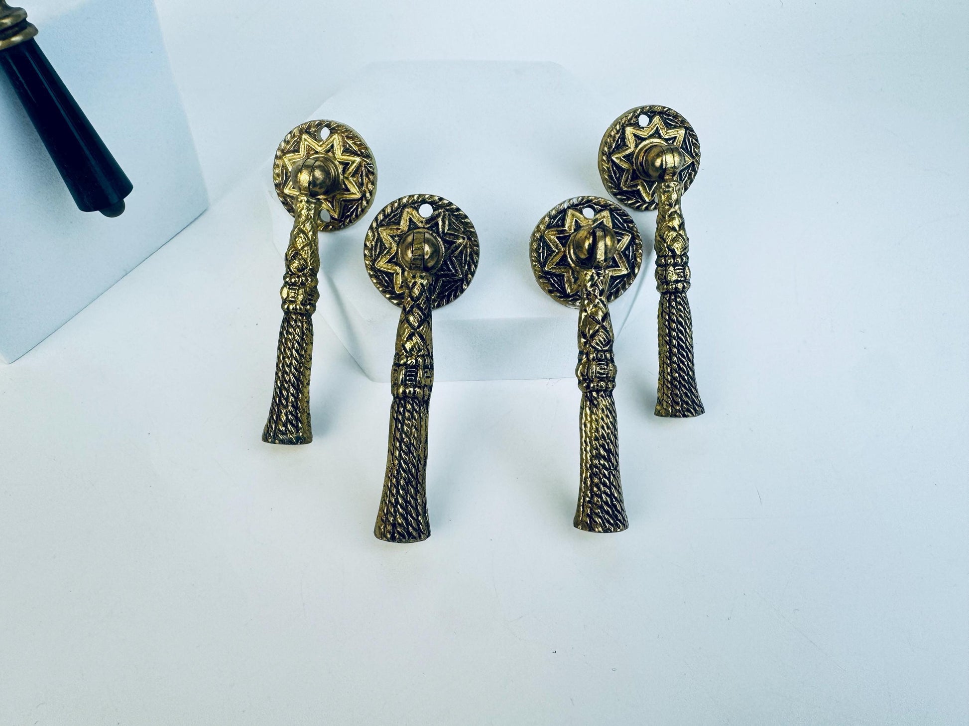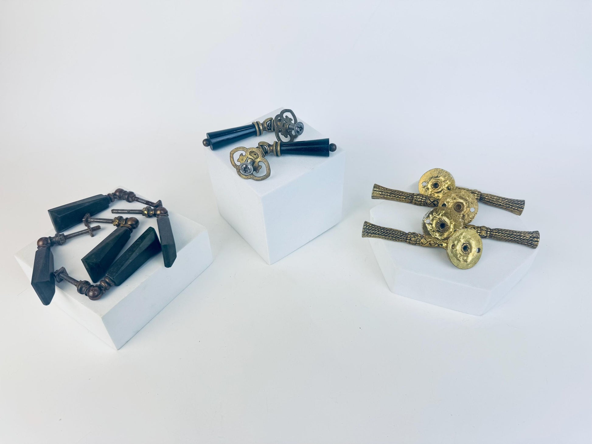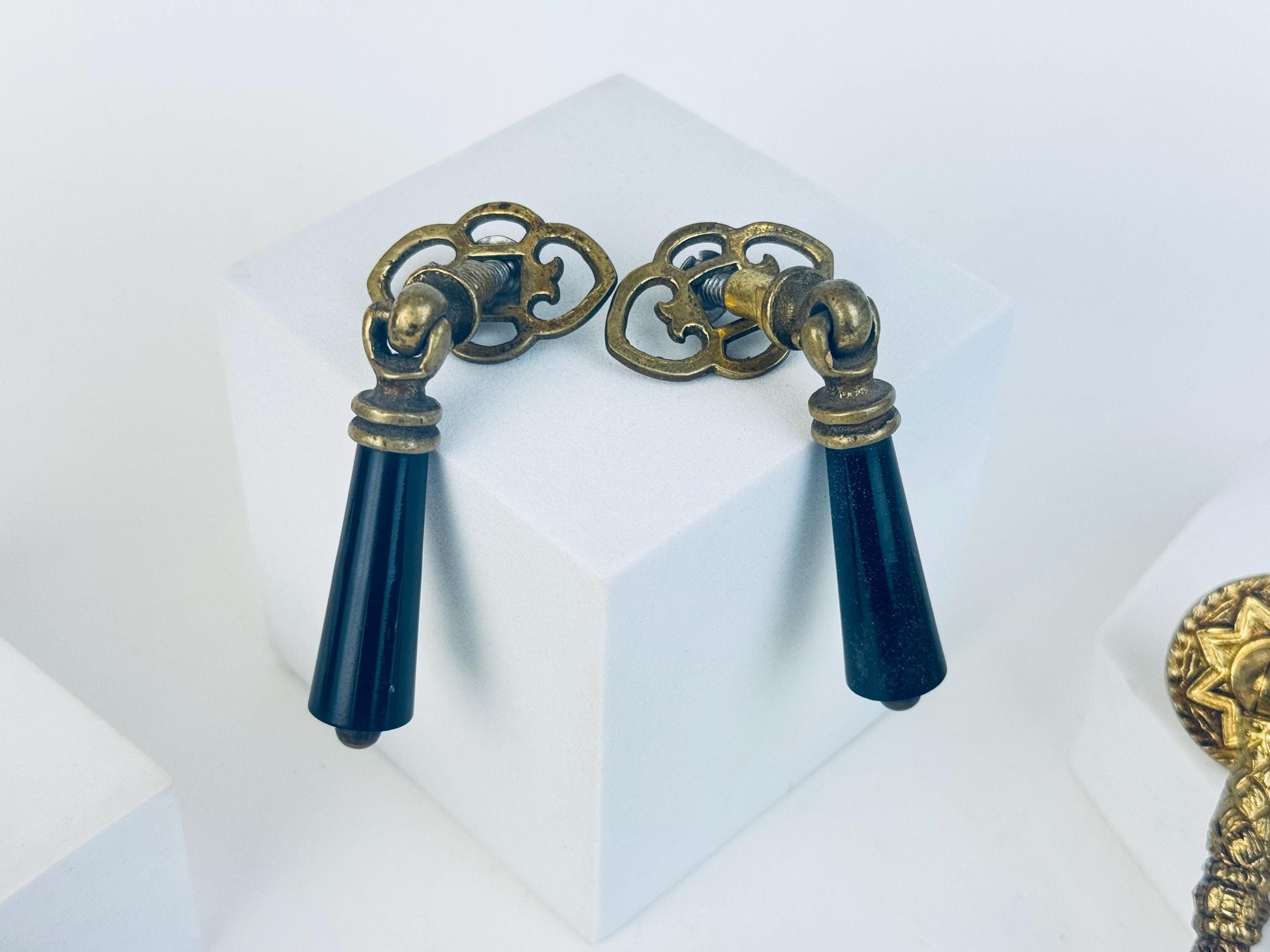 🟩 ⬛ 🟨A sophisticated trio of vintage hardware from the 1960s–1970s era, each crafted with sculptural precision and timeless charm. Choose from faceted green marble pulls with natural veining and aged brass fittings that lend quiet luxury to cabinetry; glossy black conical drops finished in deep lacquered resin with warm patinaed brass collars; or ornate tassel-shaped pulls cast entirely in solid brass, detailed with rope-textured stems and starburst medallions. Each piece is sold individually within the same listing—ideal for furniture restoration, statement dressers, or bespoke interior projects.