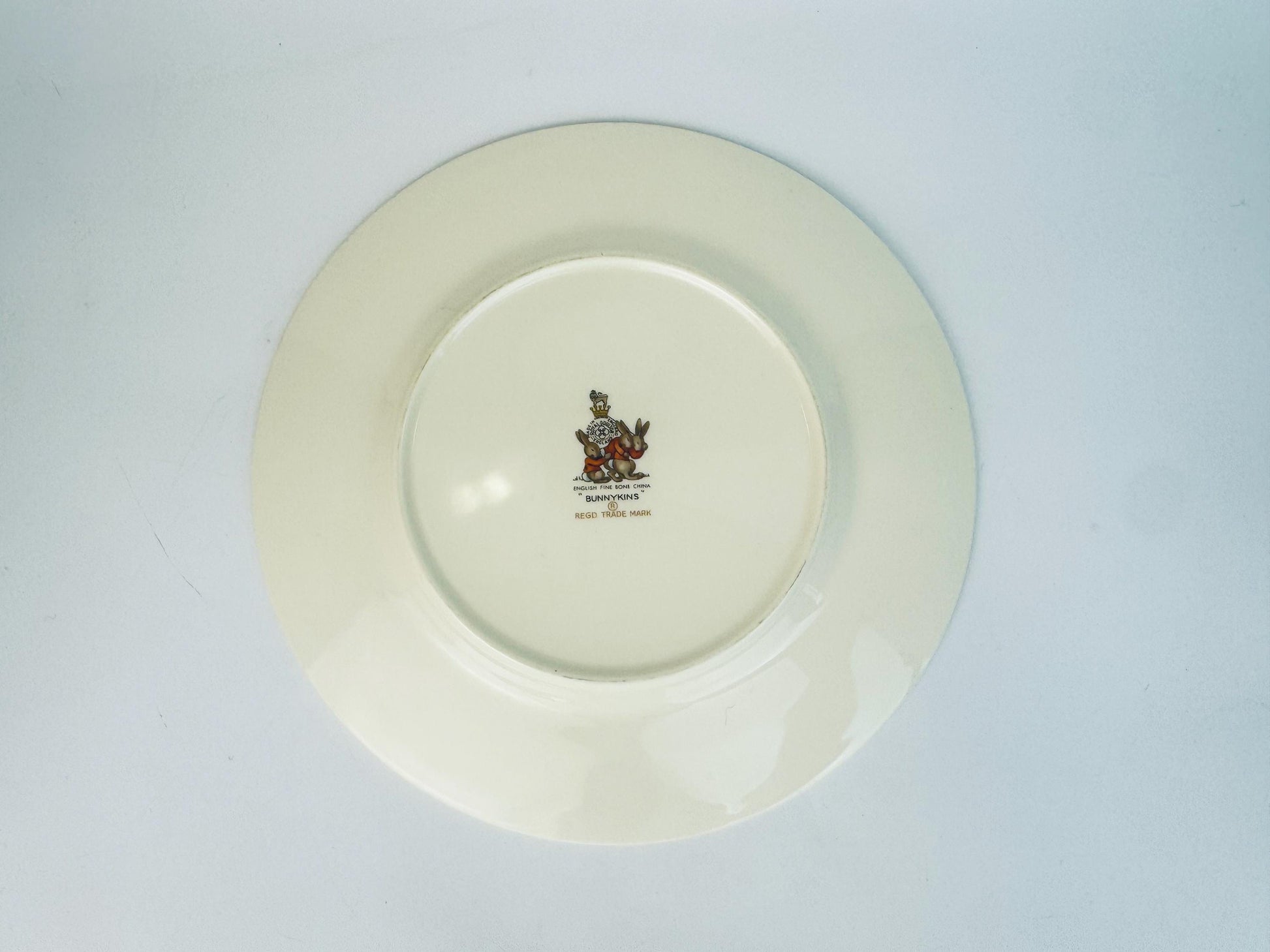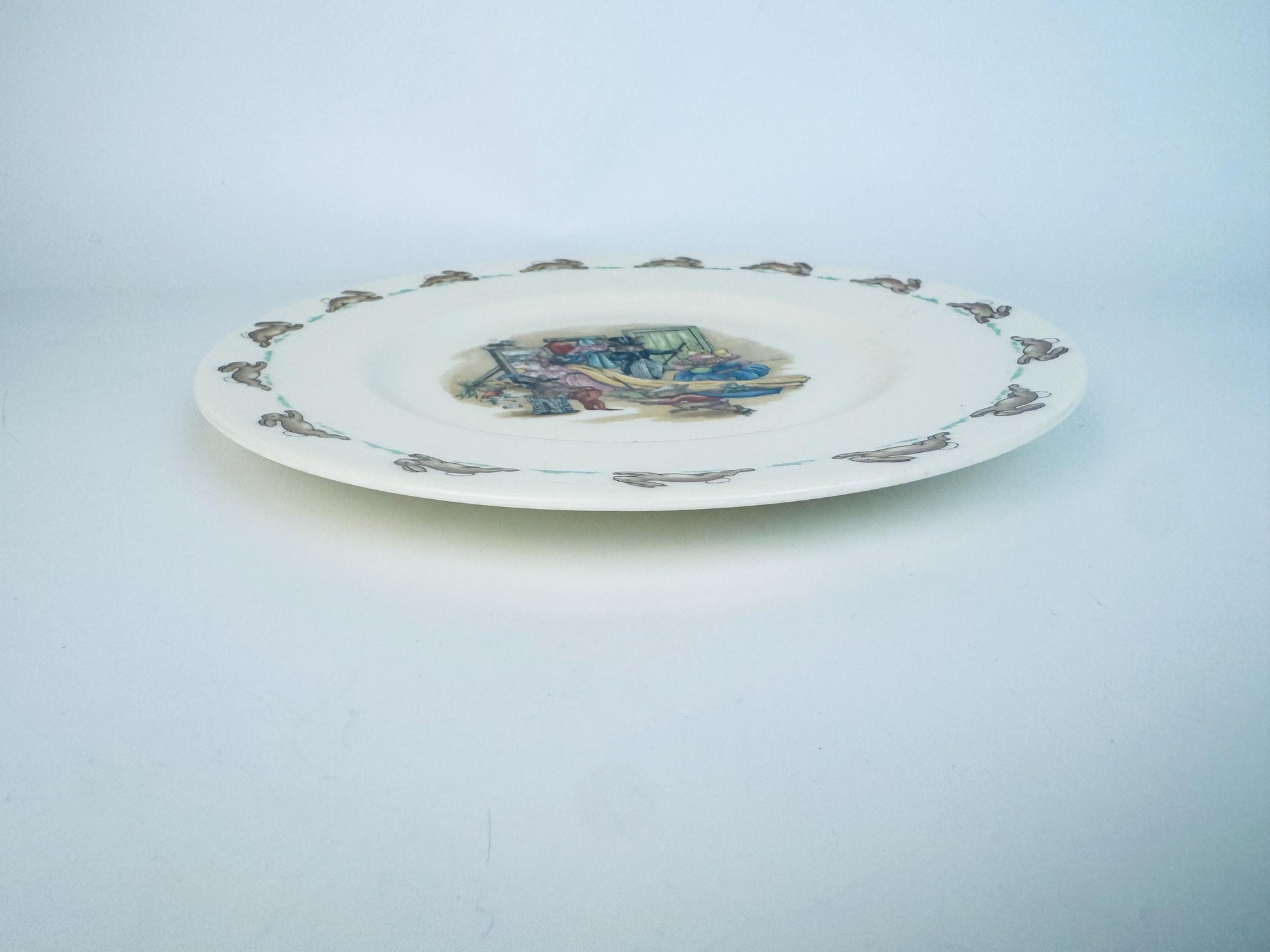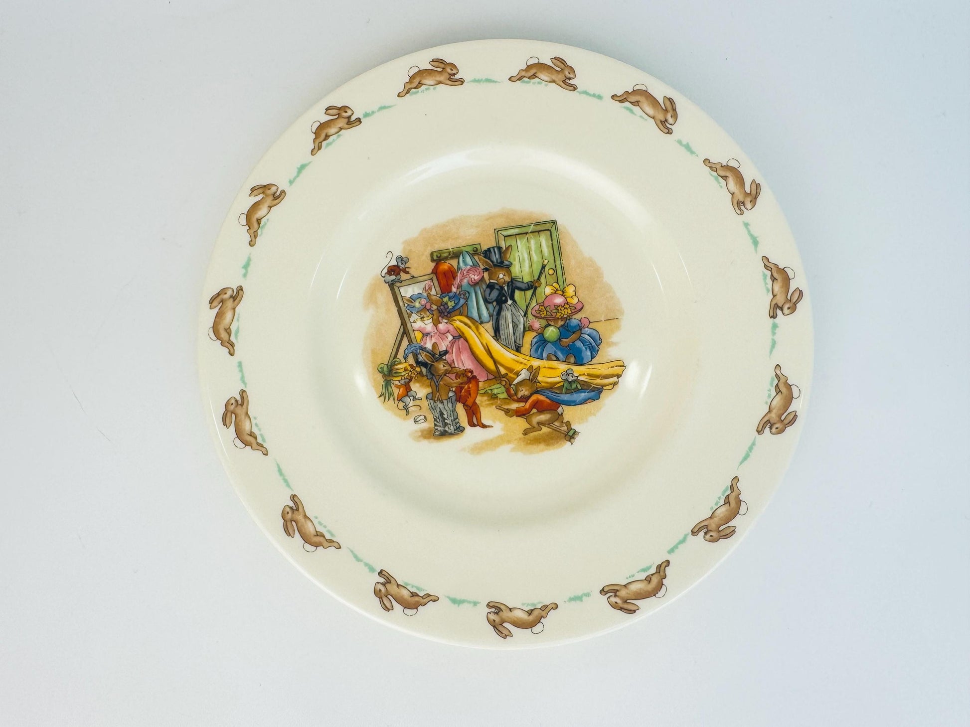 đ A whimsical touch of nostalgia, this Royal Doulton Bunnykins fine bone china plate features lively rabbits in a charming dressing scene, framed by a border of playful bunnies. Produced in the 1970s, its warm ivory tone and detailed transferware illustration make it a delightful collectible or a storybook accent for a childâs room. Ideal for display, gifting, or adding a touch of English heritage to your china collection.