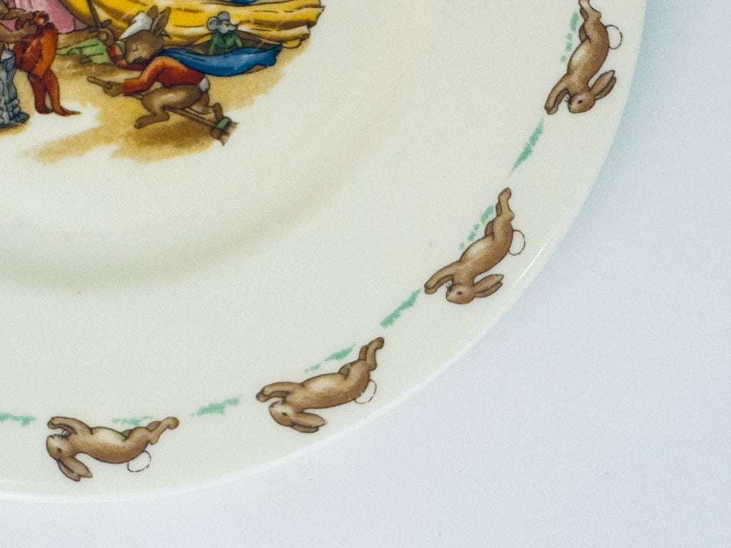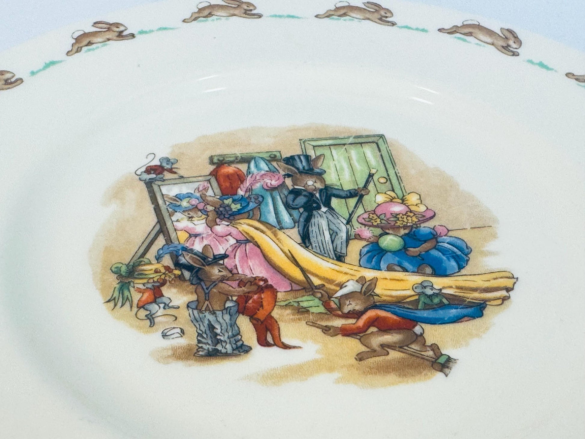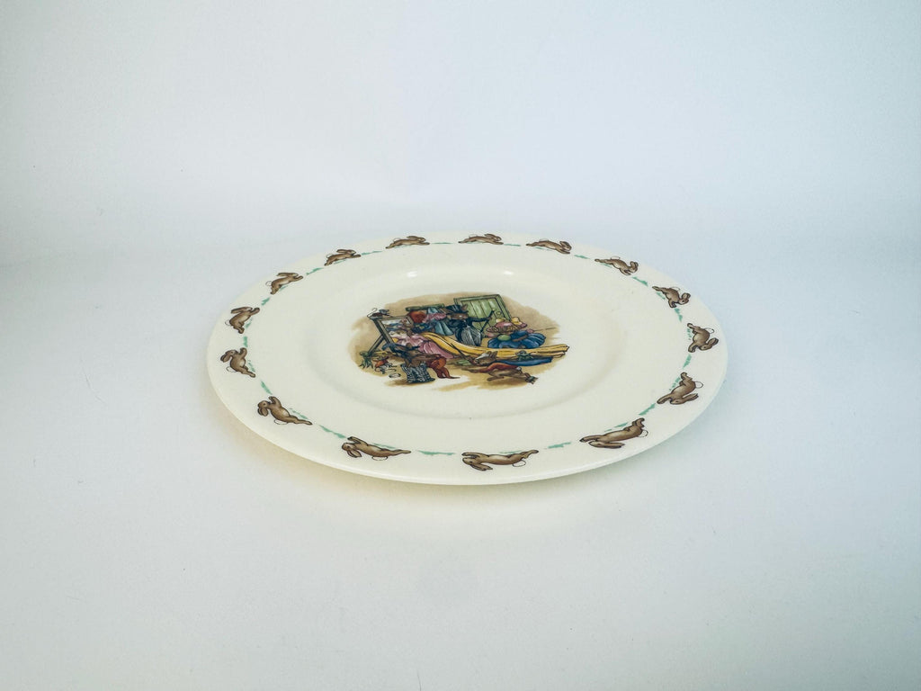 đ A whimsical touch of nostalgia, this Royal Doulton Bunnykins fine bone china plate features lively rabbits in a charming dressing scene, framed by a border of playful bunnies. Produced in the 1970s, its warm ivory tone and detailed transferware illustration make it a delightful collectible or a storybook accent for a childâs room. Ideal for display, gifting, or adding a touch of English heritage to your china collection.