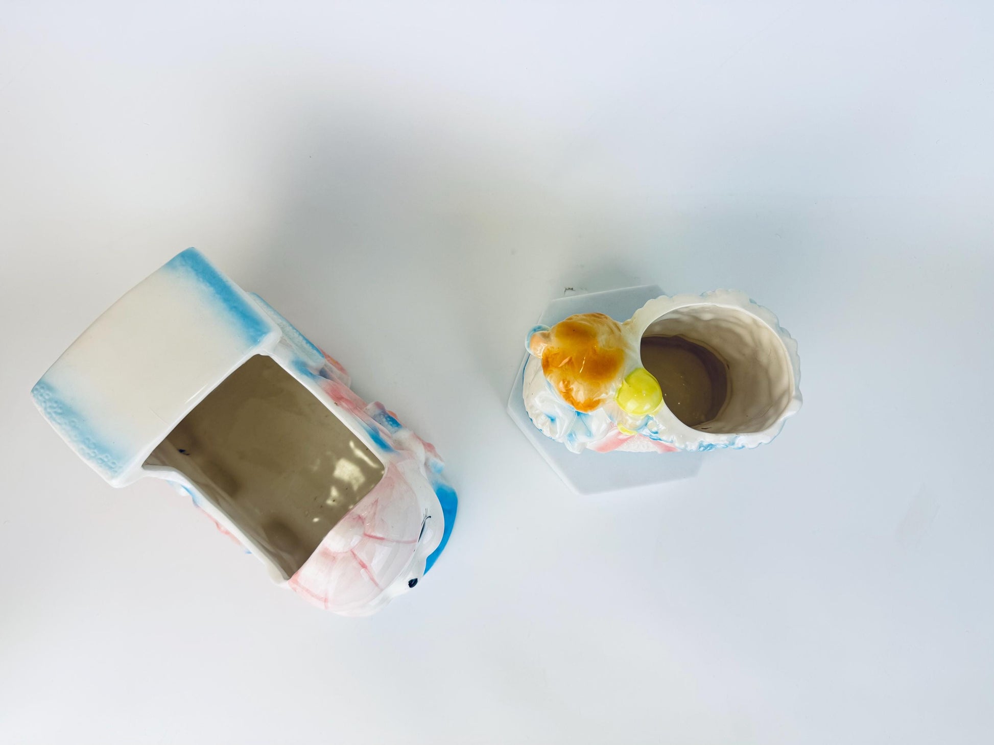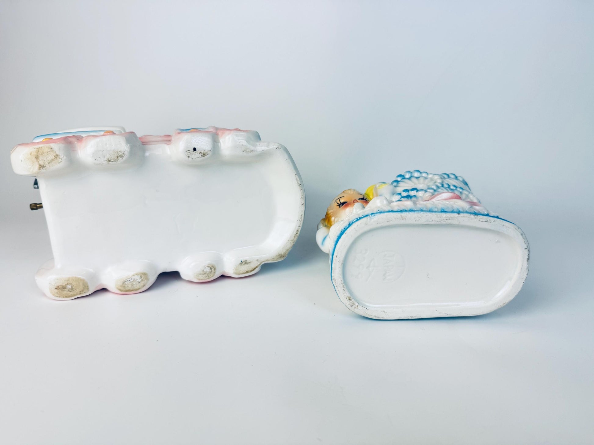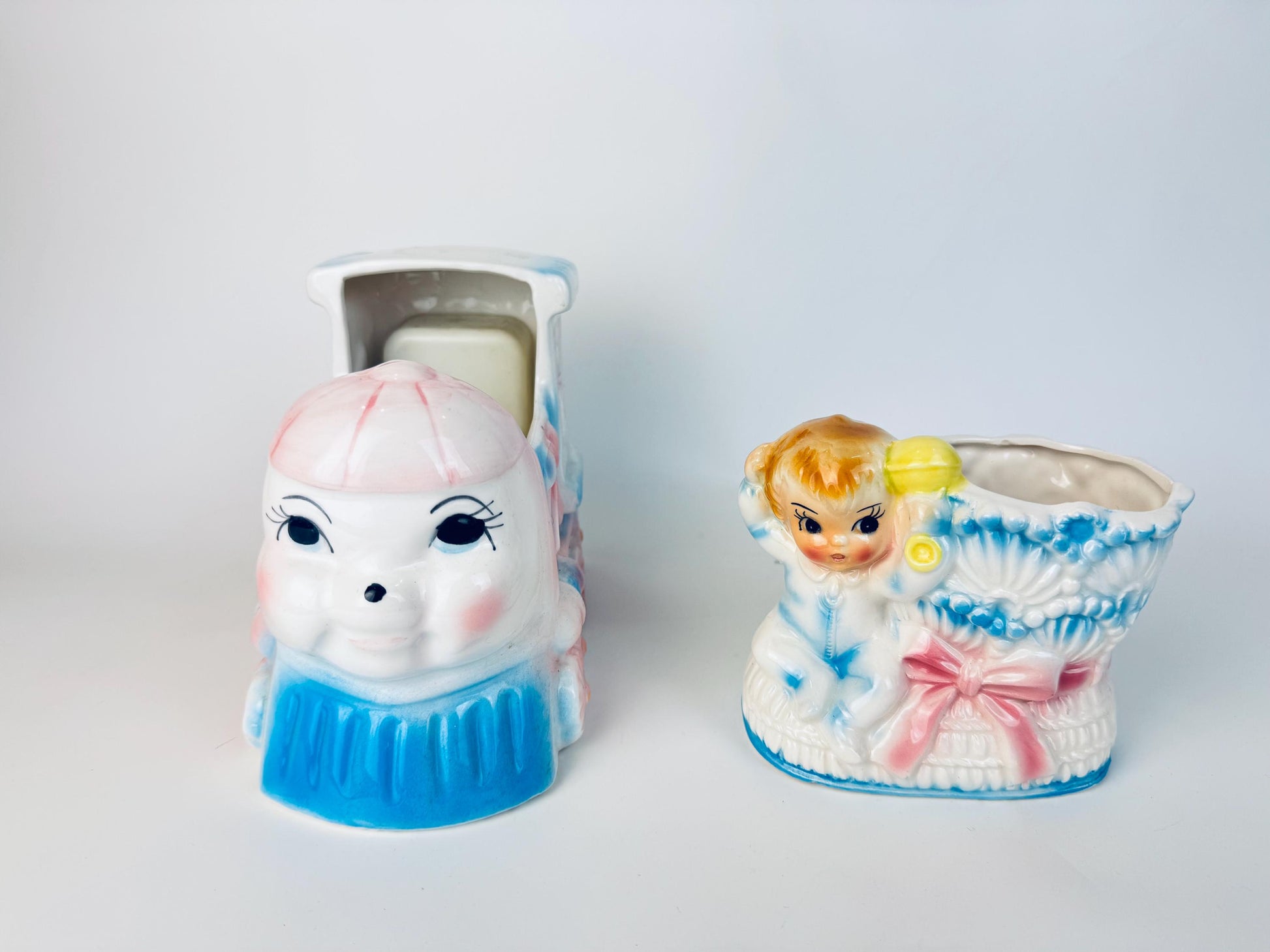 â History Behind The Piece â During the postwar Baby Boom, hospitals and florists popularized Japanese export ceramics as congratulatory gifts for new parents. Visitors often purchased pastel-painted planters shaped like trains, shoes, or bassinets, filled with flowers or sweets, before visiting the maternity ward. Produced largely in the 1950s, these whimsical planters were inexpensive yet sentimental, and their survival speaks to the cherished role they played as keepsakes of a childâs arrival.
