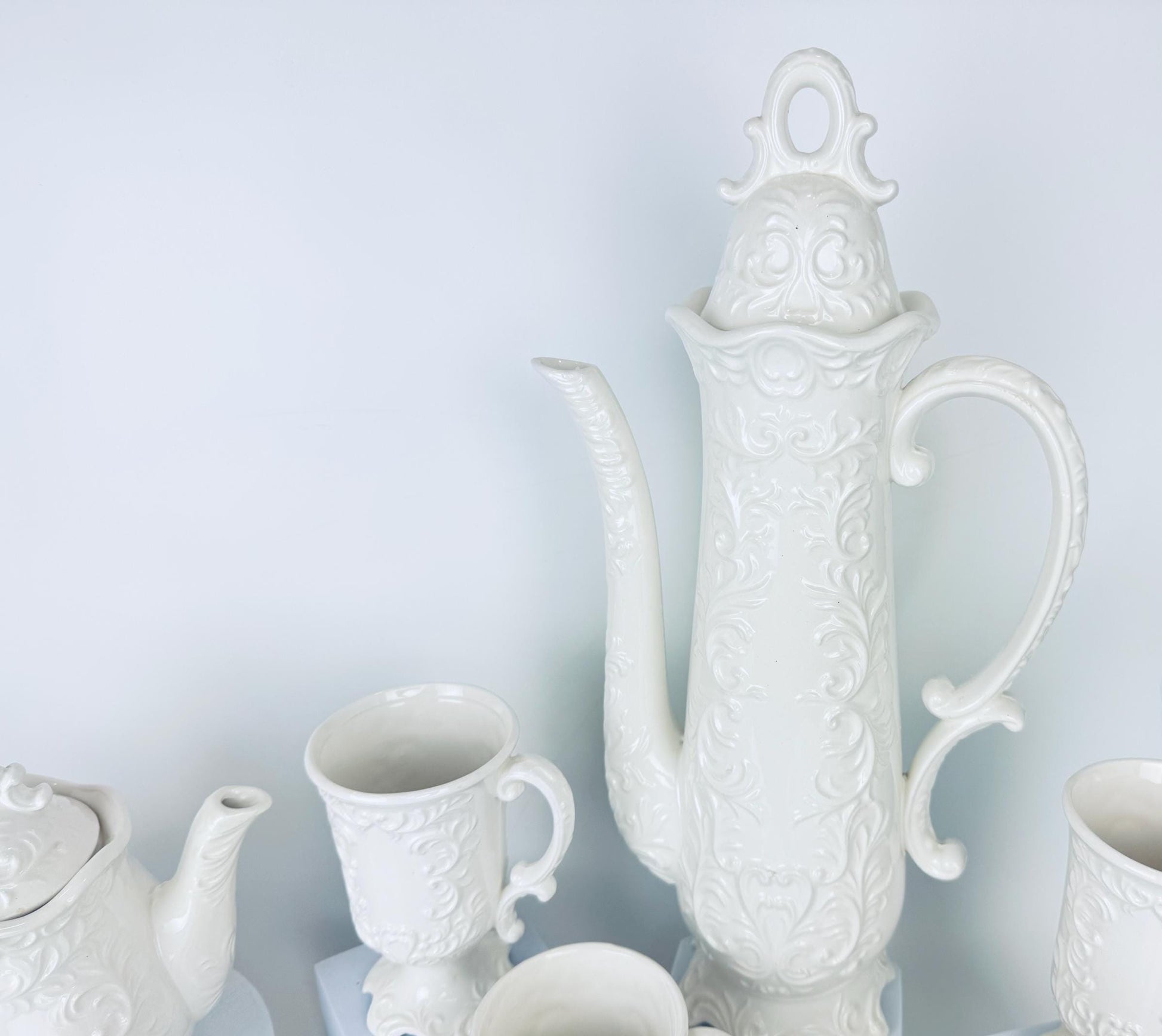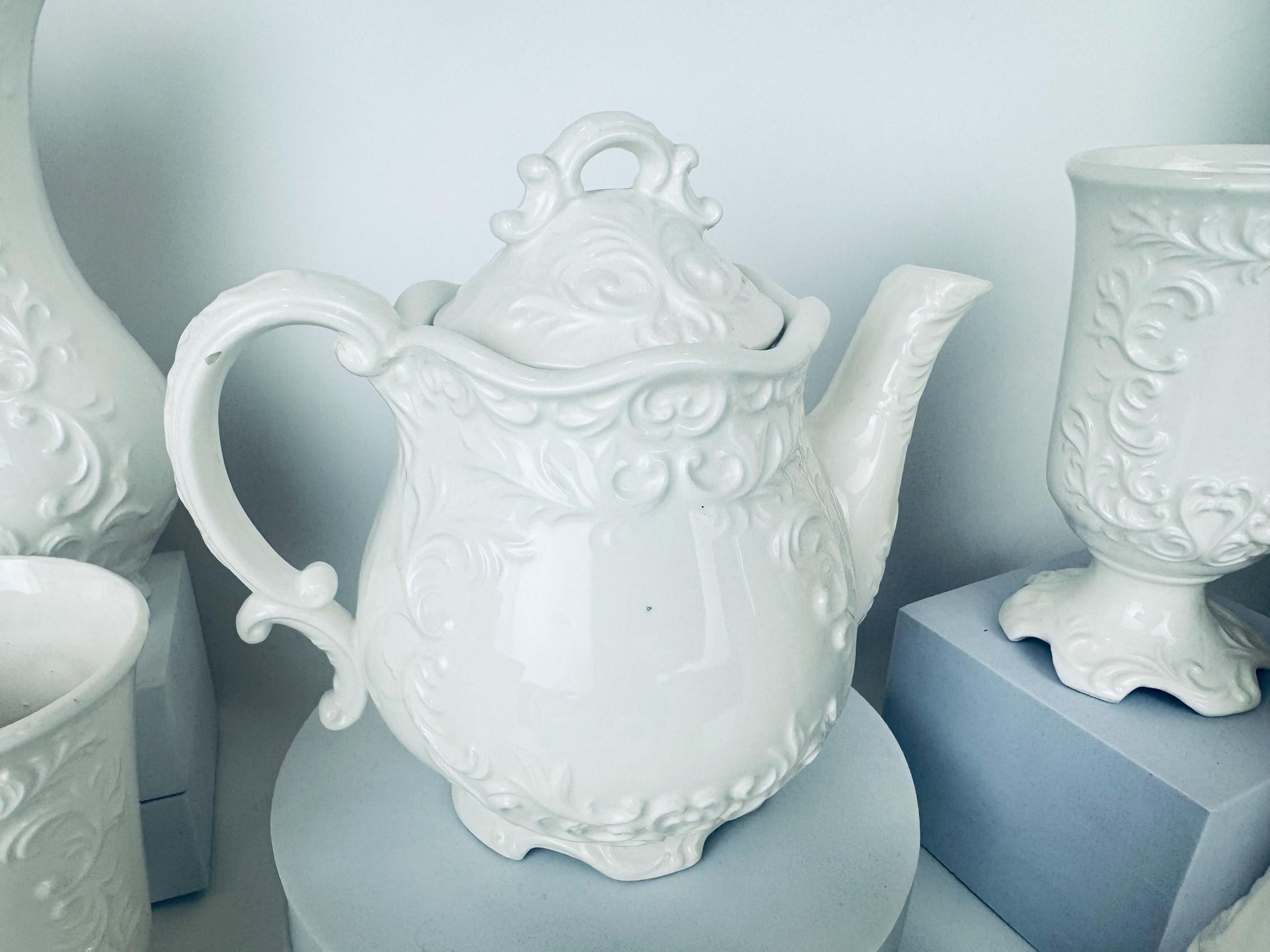 đ« An exquisite example of mid-century ceramic artistry, this French Provincial tea and coffee service set by Napcoware Japan exudes opulence in pure white glaze. Each pieceâranging from the tall, sculptural coffee pot with ornate pierced finial to the generously rounded teapot, sugar bowl, and creamersâis adorned with high-relief rococo scrollwork reminiscent of 18th-century European porcelain. The footed pedestal bases and scroll handles offer an elegant silhouette, while subtle flourishes like curled spouts, pierced pitcher necks, and delicately scalloped edges give each form a refined, romantic air. Even the pedestal mugs feel elevated, with their baroque embossing and weighty, comfortable gripâideal for serving or display.