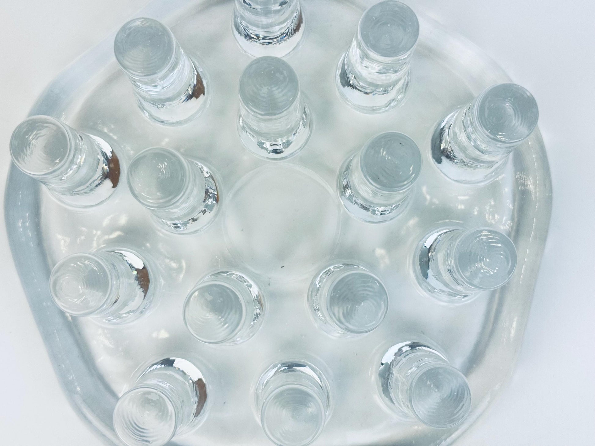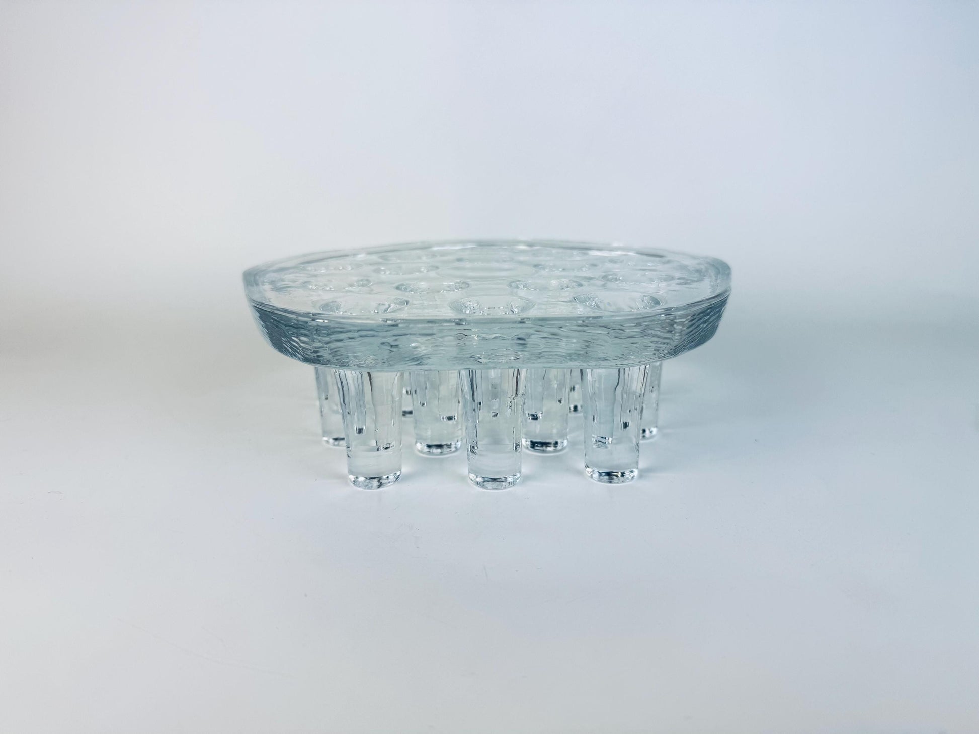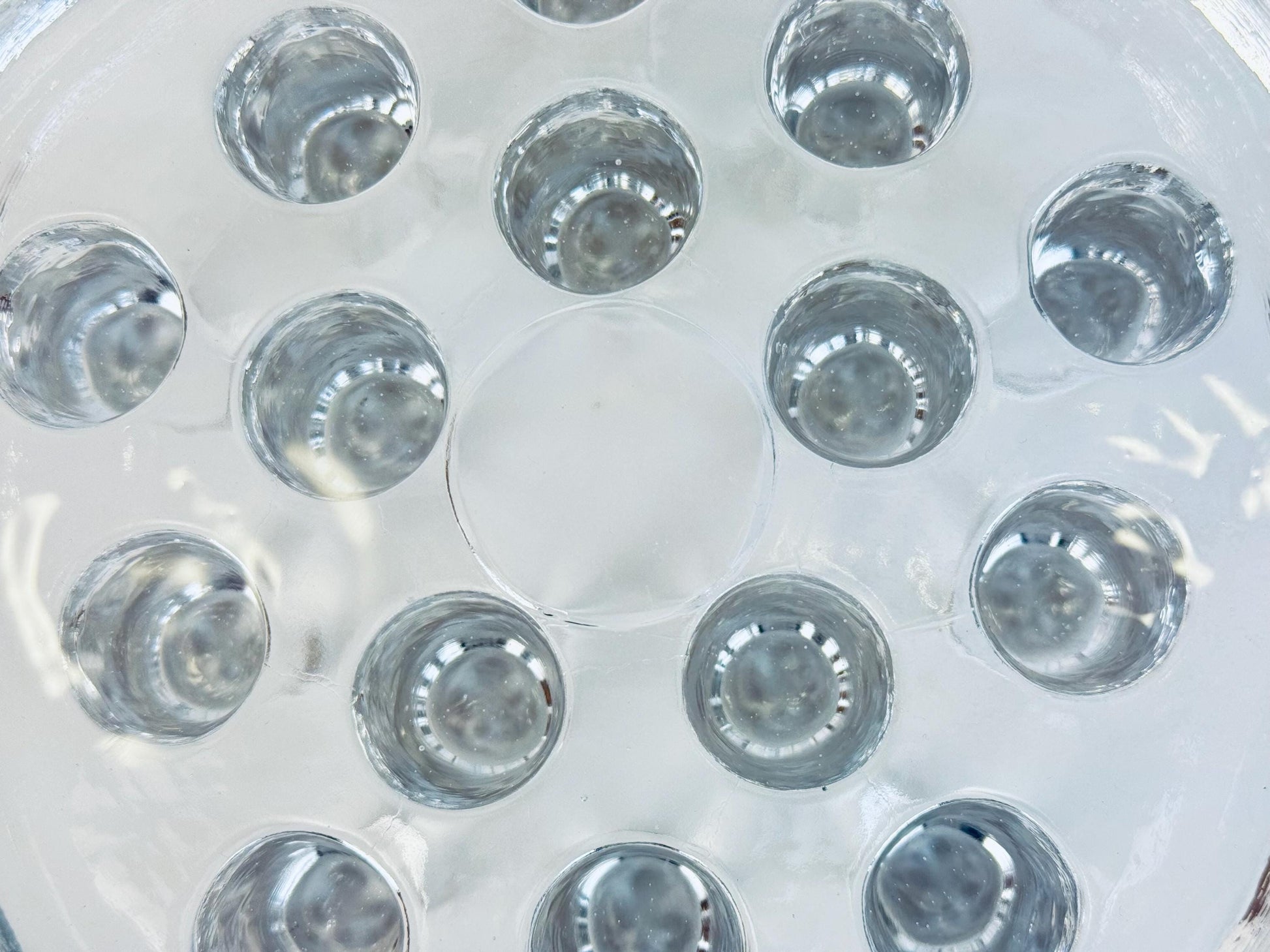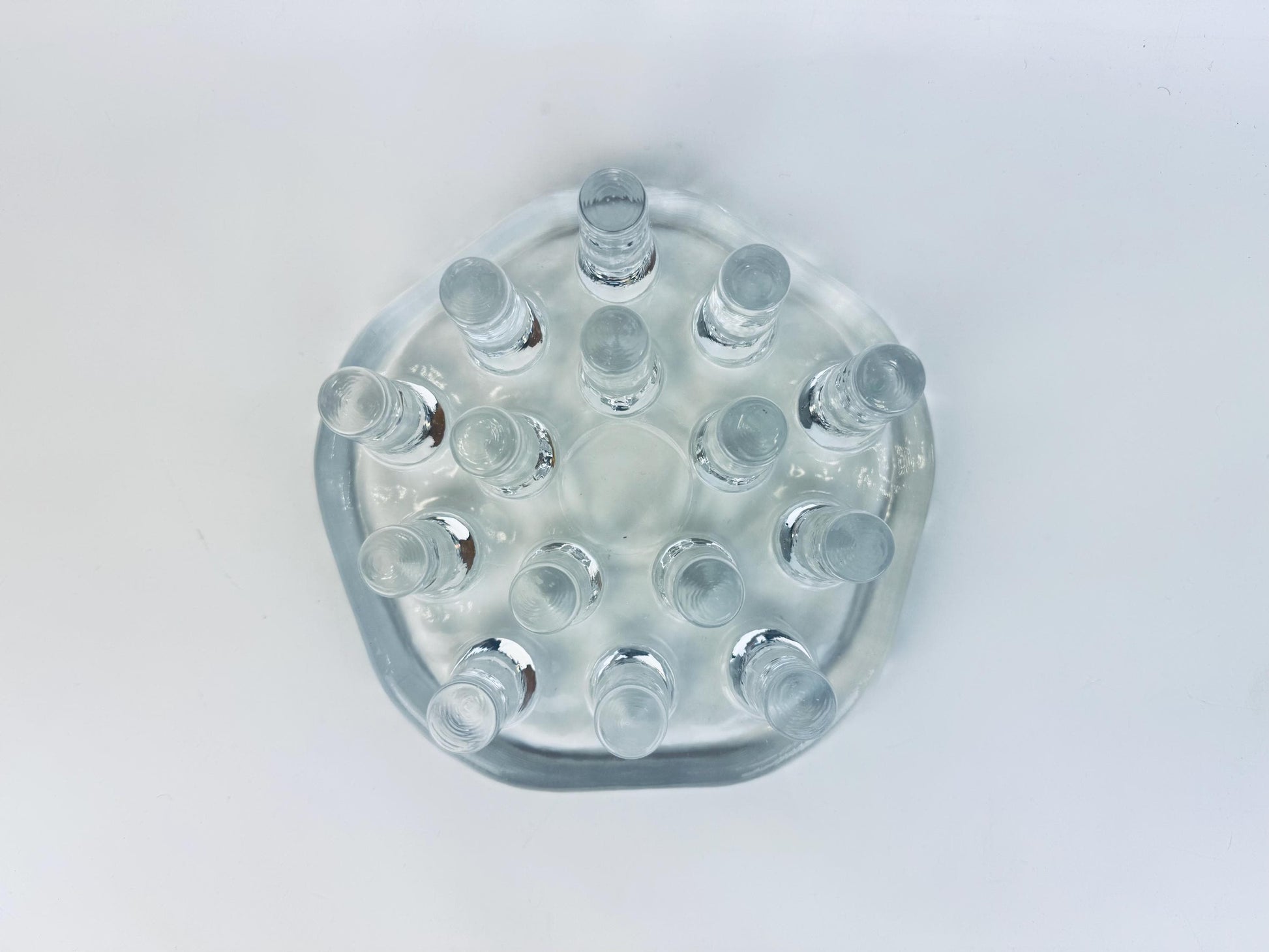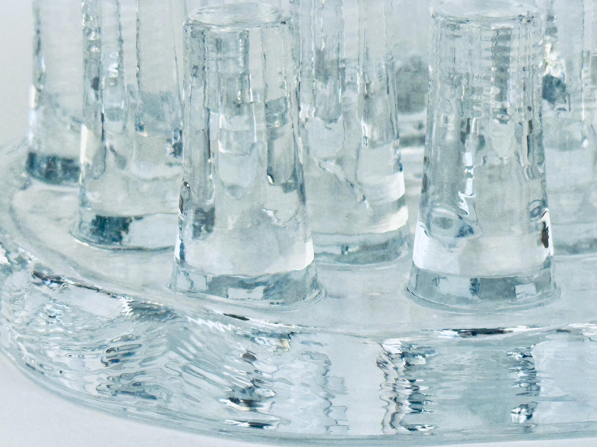 ✨ A sculptural glow in crystalline form, this 1970s Georgshütte tea warmer / votive stand displays an array of vertical glass pegs above a flat base — elegantly blending Nordic minimalism with Germanic solidity. The clear pressed-glass construction casts complex light and shadow, making it ideal for use as a votive candle holder, trivet, or tea pot warmer. Pair it with a tealight, espresso pot, or small teapot atop — this piece becomes both functional and artistic.