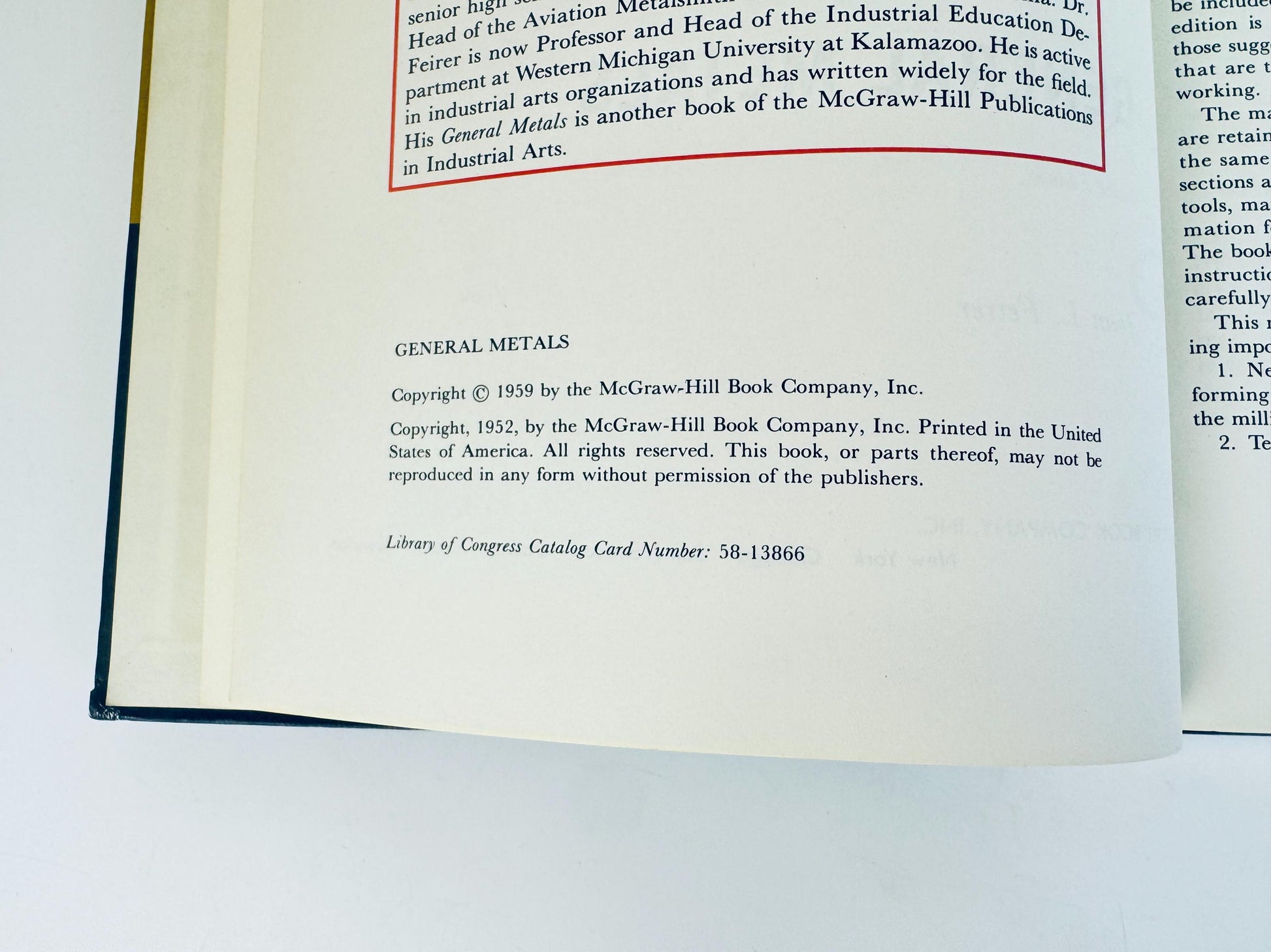Published by McGraw-Hill’s Industrial Arts division, General Metals was part of a suite of shop-craft textbooks used in U.S. vocational and art curricula through the 1950s and ’60s. Its clean modernist diagrams and didactic clarity reflect an era when design and industrial skills were taught side by side in secondary schools.